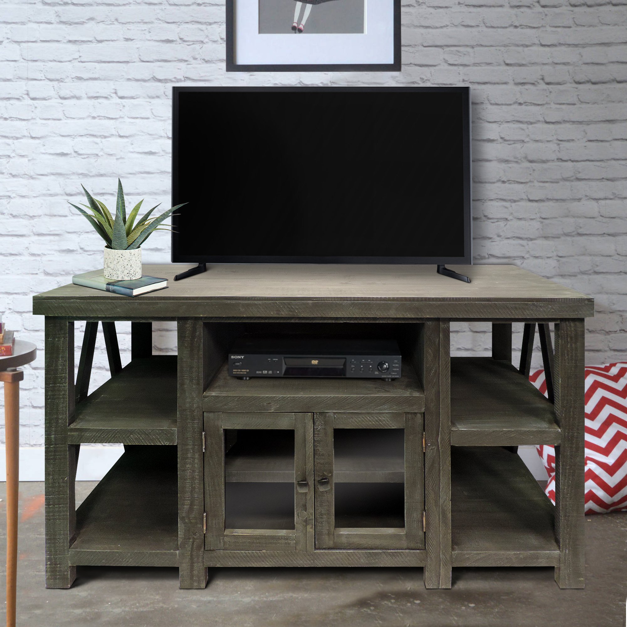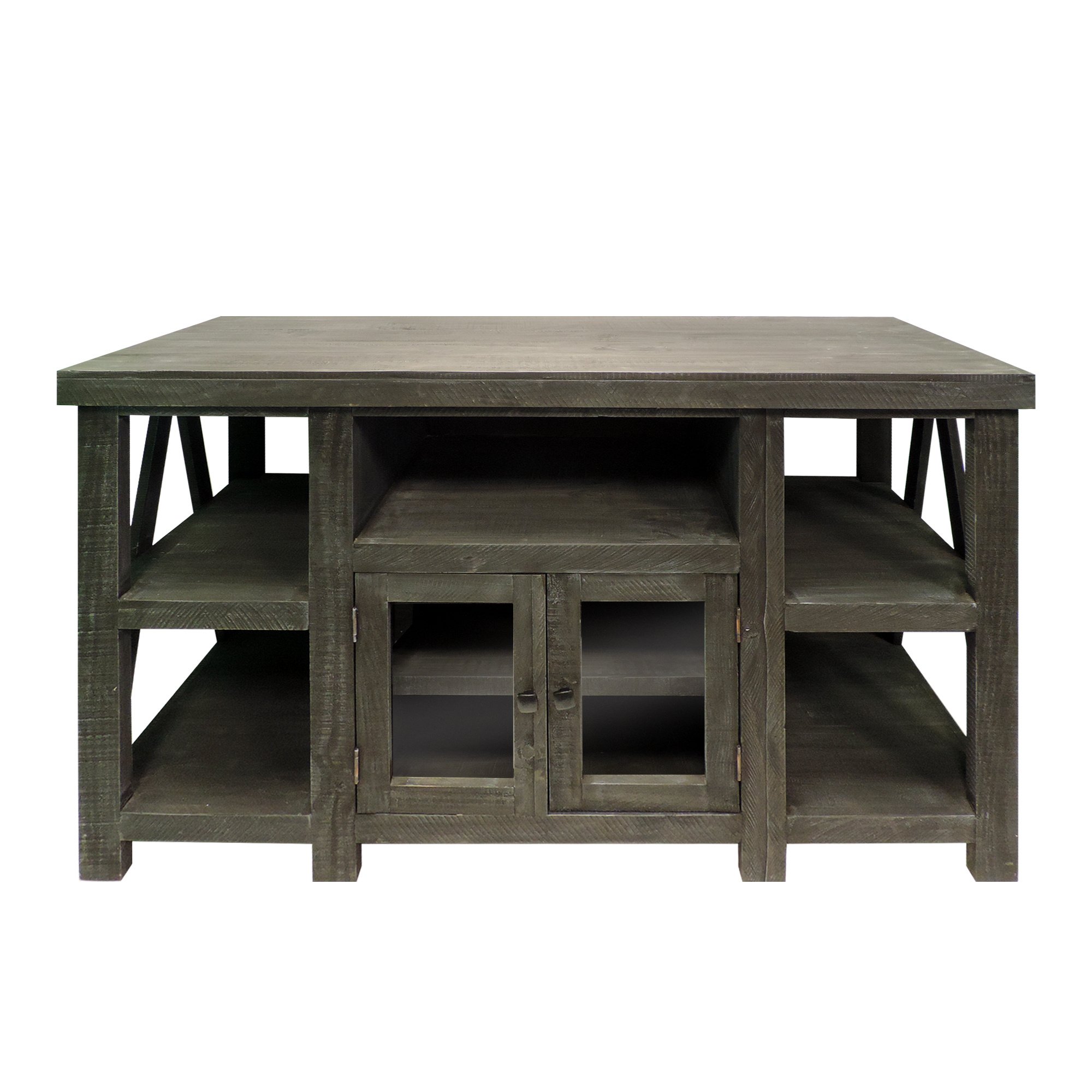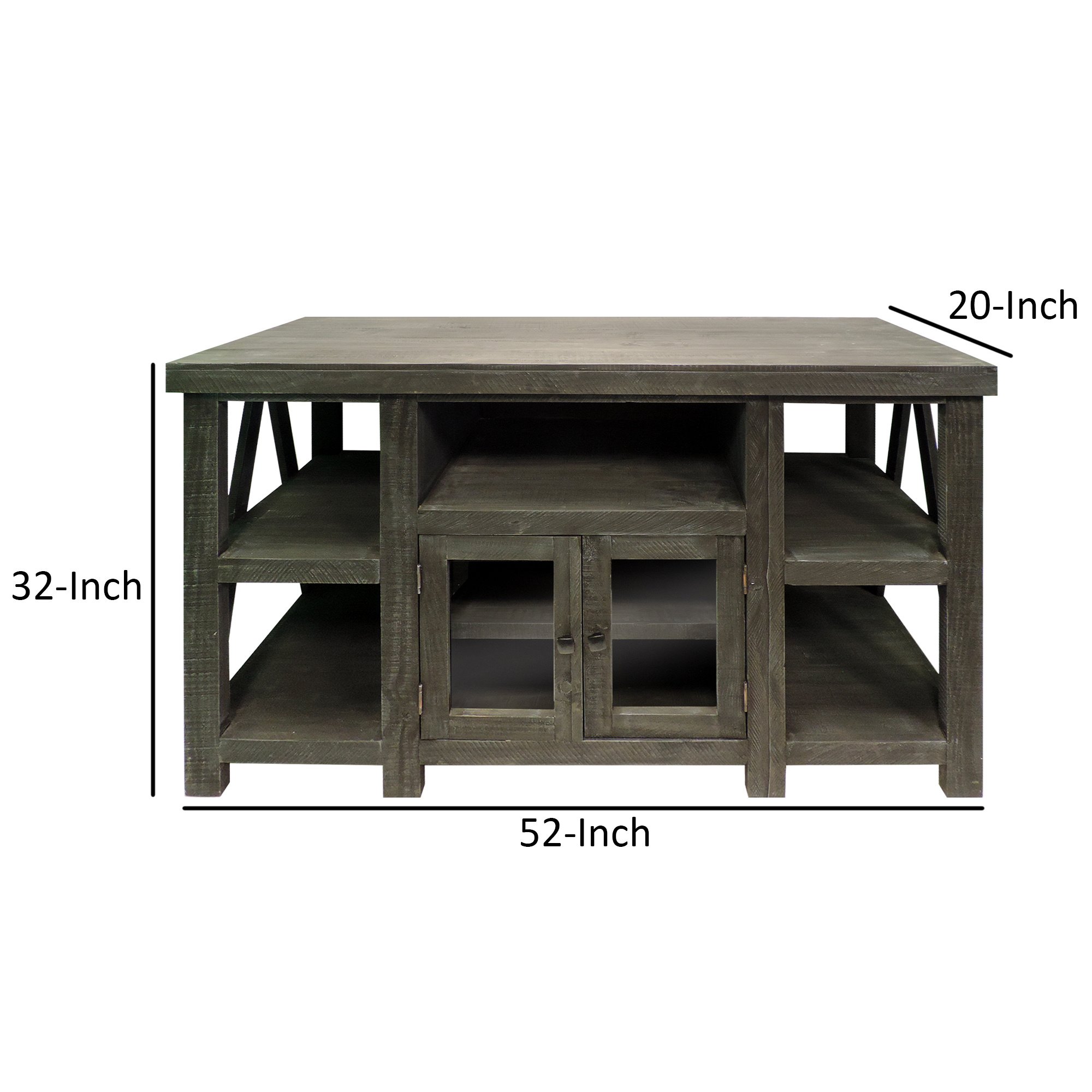 Bringing the best of design and function together, this rustic style TV console is a perfect addition to your home. Handcrafted from wood with distressed gray finish, this TV stand features an open compartment with cable cutout and two glass door cabinet with an interior shelving unit to keep your media accessories in an organized manner. The four side shelves with inverted V shape sides, offering display space. Due to the handcrafted nature of the product, there may be variation in color, finish, wood grain and knots.