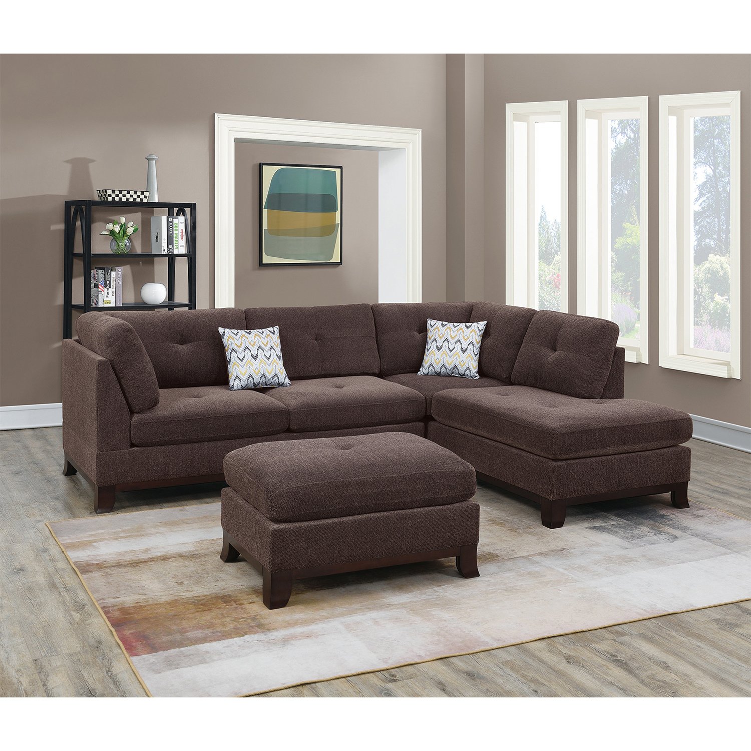 Chenille Reversible Sectional Sofa with Ottoamn in Dark Coffee