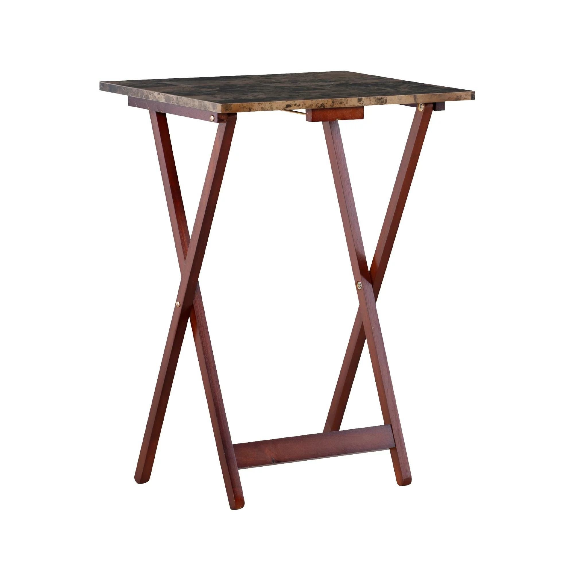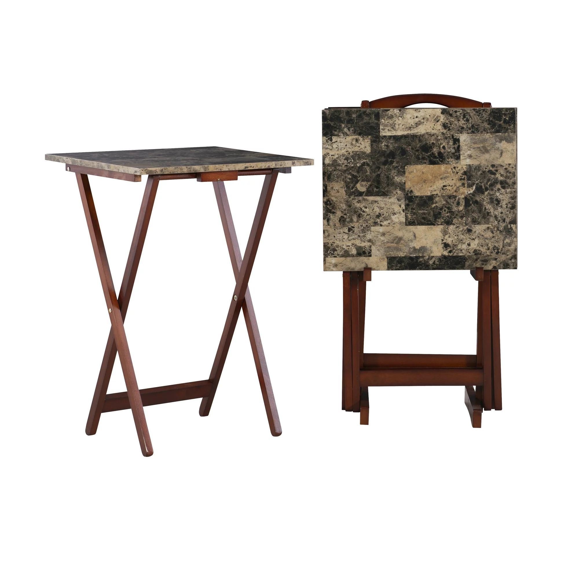 The Brown Faux Marble Rectangular TV Table Set has a distinctive look with its sturdy wood construction and faux brown marble top. This set includes foldable TV trays and one storage stand. The handle on the top of the stand makes it easy to transport the entire set from one room to another. A true home furnishings staple.Brown faux marbleSeat includes tray tables and storage standEasy to move from one room to another with the handle on topA home furnishing stapleSet in stand is 19 in. W x 13 in. D x 31 in. H. Individual tray (open) is 19 in. W x 15.75 in. D x 26.25 in. HSturdy Design