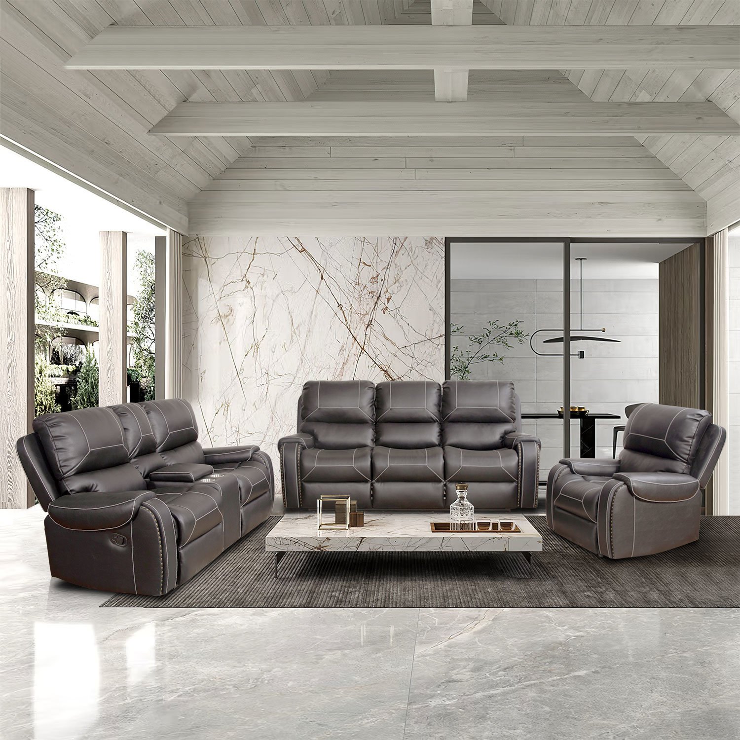 Leather Reclining Sofa Couch 3 Seater Sofa for Living Room GreyLUXURY RECLINING SOFA SET:This recliner sofa brings classic style and functionality to your living room. This sofa is made of solid wood frame and features medium density sponge and thick padded cotton cushions, and quality faux leather in a solid color. Copper nail decoration on the arms, this Reclining sofa completes the look in any traditional or rustic setting. MODERN DESIGN & MULTIFUNCTIONAL:The 3-seat sofa is with a drop down table, with it you can release your hands at any time. The loveseat recliner has storage space in the middle, put small items in it, won't affect the sofa's beautiful look and is also very convenient. The classic wingback design furniture set is ideal for your living room, lounge, home theater or office. RECLINING & ROTATION DESIGN:The loveseat sofa with 2 reclining seats, and the single sofa not only has recline function but also has 360° rotation function.Padded seat cushions give more comfort and support where it's needed the mostProduct TypeGeneral ItemMain MaterialPUCustomizeYesMain ColorGreyProduct Dimensions85.82*37.79*40.94inch