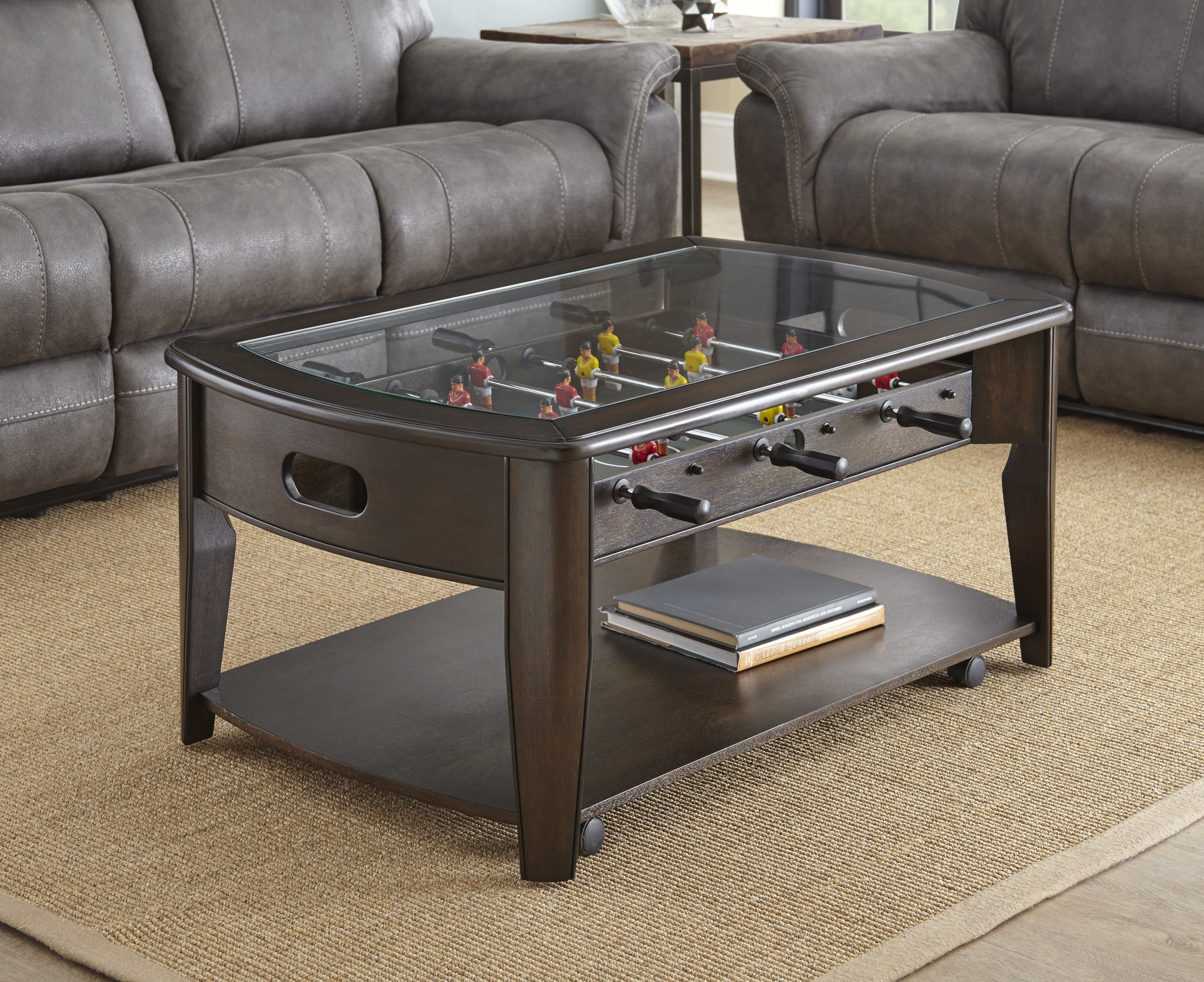 DimensionsCarton Dimensions L 47.5 x W 30.5 x H 10.5Features-Table does double duty as a cocktail table and fully operating foosball table-Constructed of tempered glass, chrome coated iron, wood veneers and engineered wood products-Table does double duty as a cocktail table and fully operating foosball table-Foosball table has six handles, two foosballs, an easy-to-retrieve ball return on each end and a side entry port on side to start the game action-Table comes with five casters (two locking) for added mobility and features a bottom shelf for added strength and storageProduct DescriptionElevate your game room or living room with the Cocktail Table featuring a built-in foosball game. This fully operational foosball table provides endless entertainment and adds a unique touch to your space. The tempered glass insert adds a touch of sophistication, while the locking and non-locking casters ensure easy mobility. Whether you're hosting game nights or enjoying leisurely evenings with friends and family, this cocktail table is the perfect centerpiece. Additionally, the end table features a reversible top with a chessboard, offering even more gaming options. Experience a new level of fun and functionality with this exceptional cocktail table.