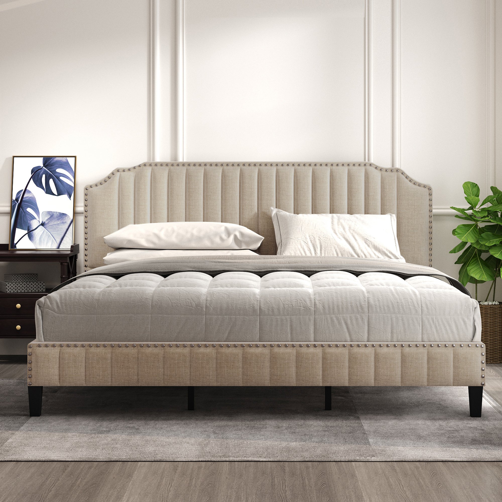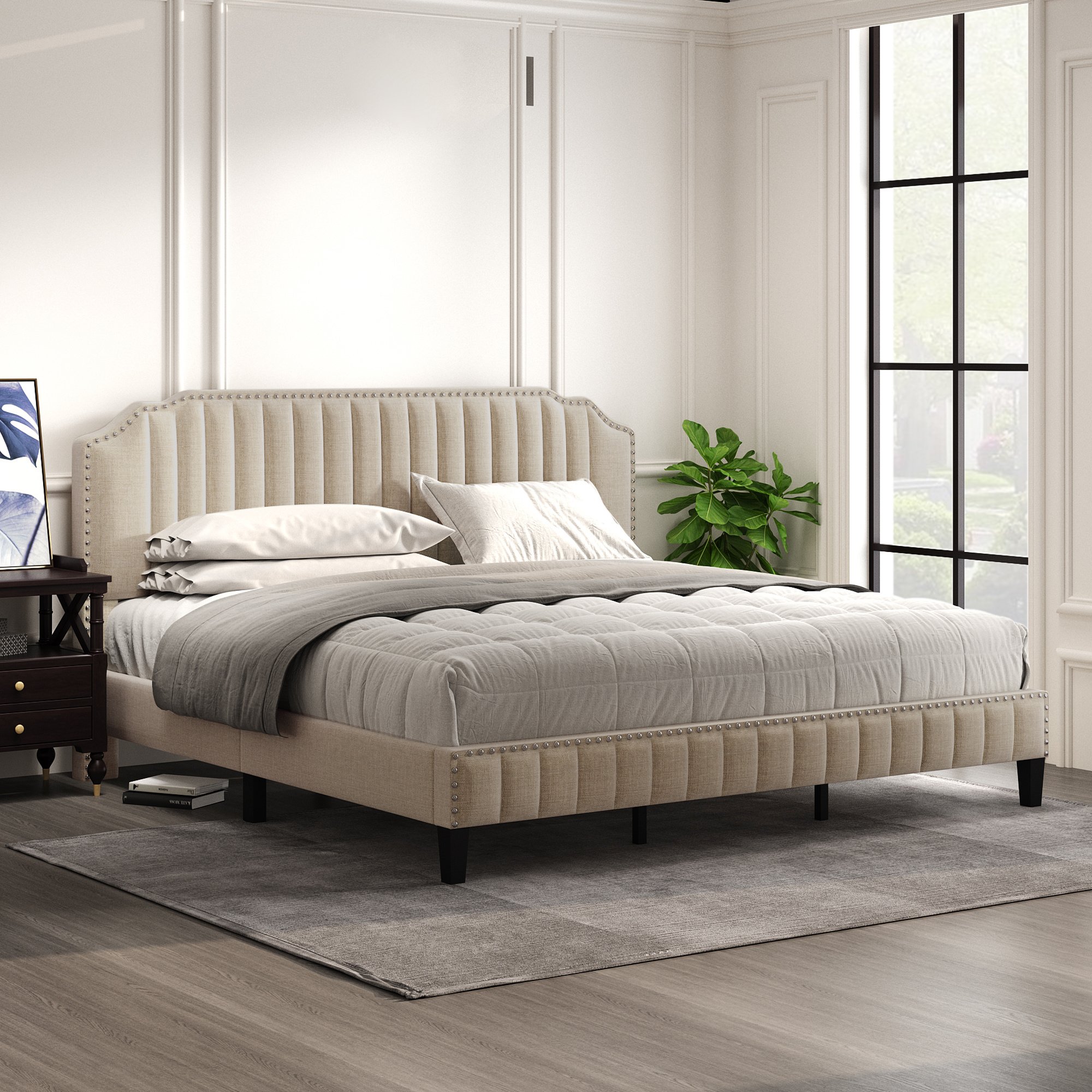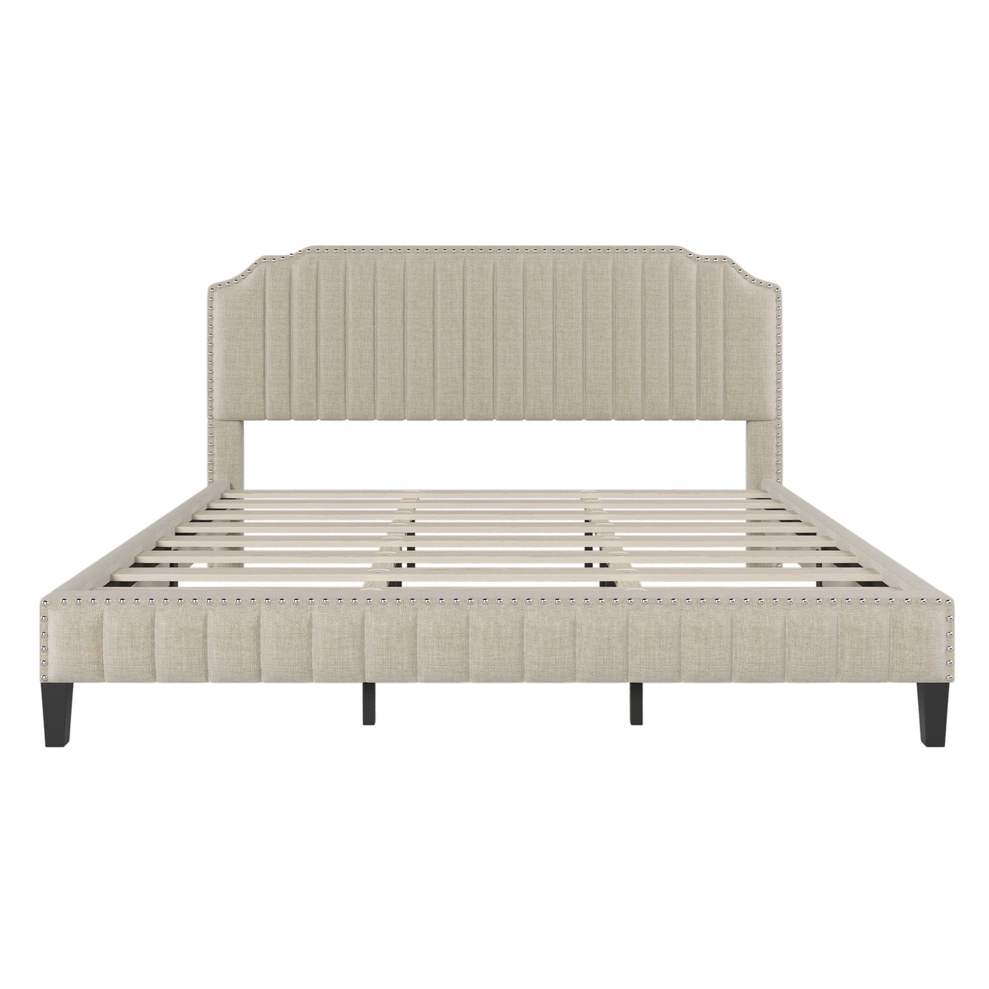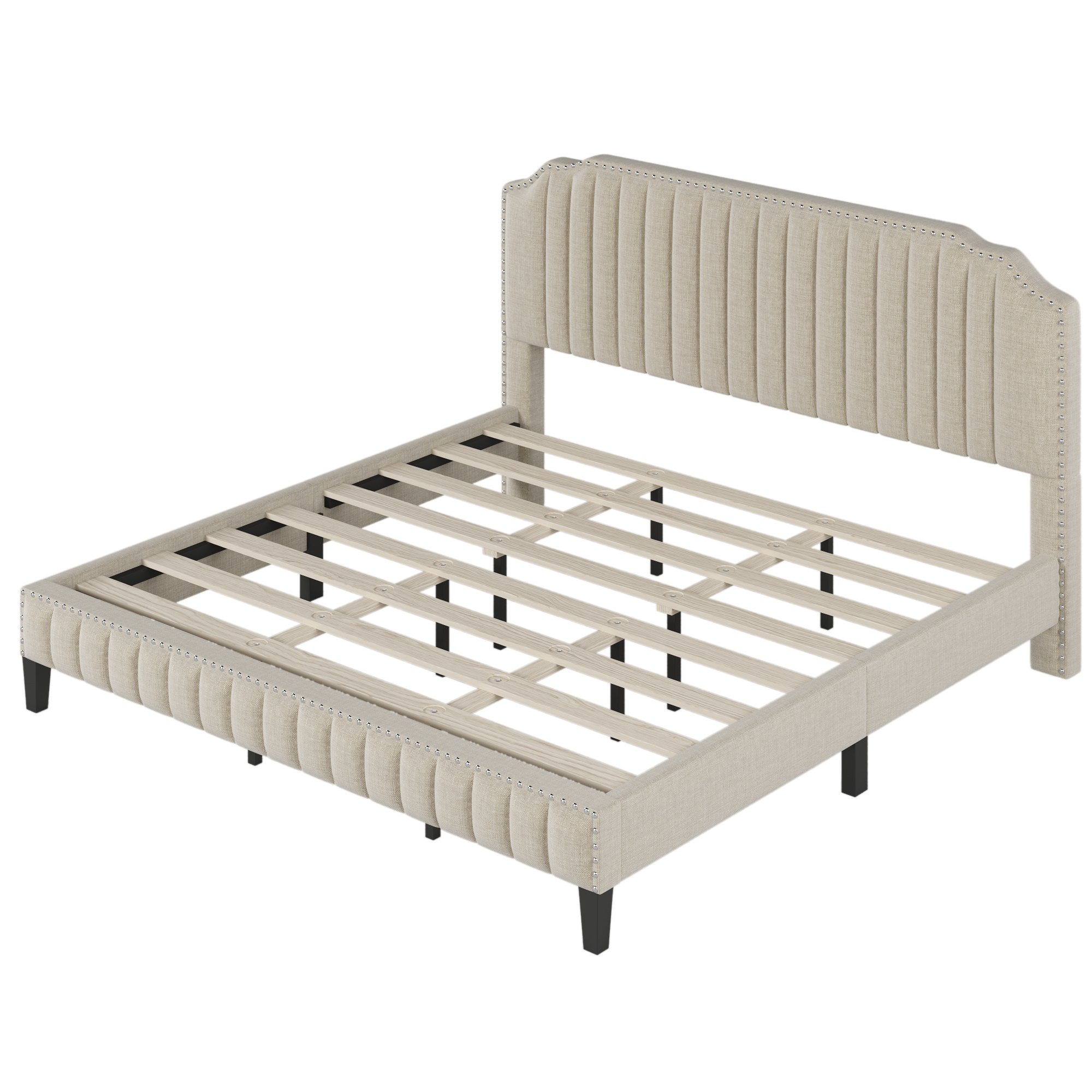 Modern Linen Curved Upholstered Platform Bed , Solid Wood Frame , Nailhead Trim, Beige (King)