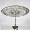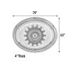 The Champagne Large Oval Chandelier Ceiling Medallion 79 inches is a large fully assembled and intricately finished Ceiling Medallion. Finished in a softened Silver with a light wash of Gold, our Champagne Silver Medallion offers a luxurious finish in a stylish design. This completely finished Architectural Ceiling Medallion creates instant 3 dimensional detail to an otherwise boring plain ceiling. Also a crowning Elegance to a Chandelier Installation, which is often a good time to install your selected Medallion. The item comes fully finished out of the package and is Hand Cast in a lightweight Polystyrene that will never shrink, split or crack. Prior to Masterpiece Moldings creation of this Collection by AFD Home, the only way to have had an advanced ceiling with this level of design would have been a very expensive addition and an owner willing to take on an elaborate installation project, requiring carpenters, finishers, and in some instances even artists. One of the best parts about this item is that installation could not have been made easier, as the outer ring is created with a cabochon design allowing intermittent spaces specifically created as locations for your screws or hollow wall anchors, matching decorative caps are even provided that will cover the screw heads of your anchors and offer a complete professional looking install. A 1.5 inch center hole is provided for the installation of chandeliers and fans. The overall measurements are 79 x 4 x 63. Hollow wall anchors or installation screws are available at your local hardware store, as your need will vary depending on your ceiling.