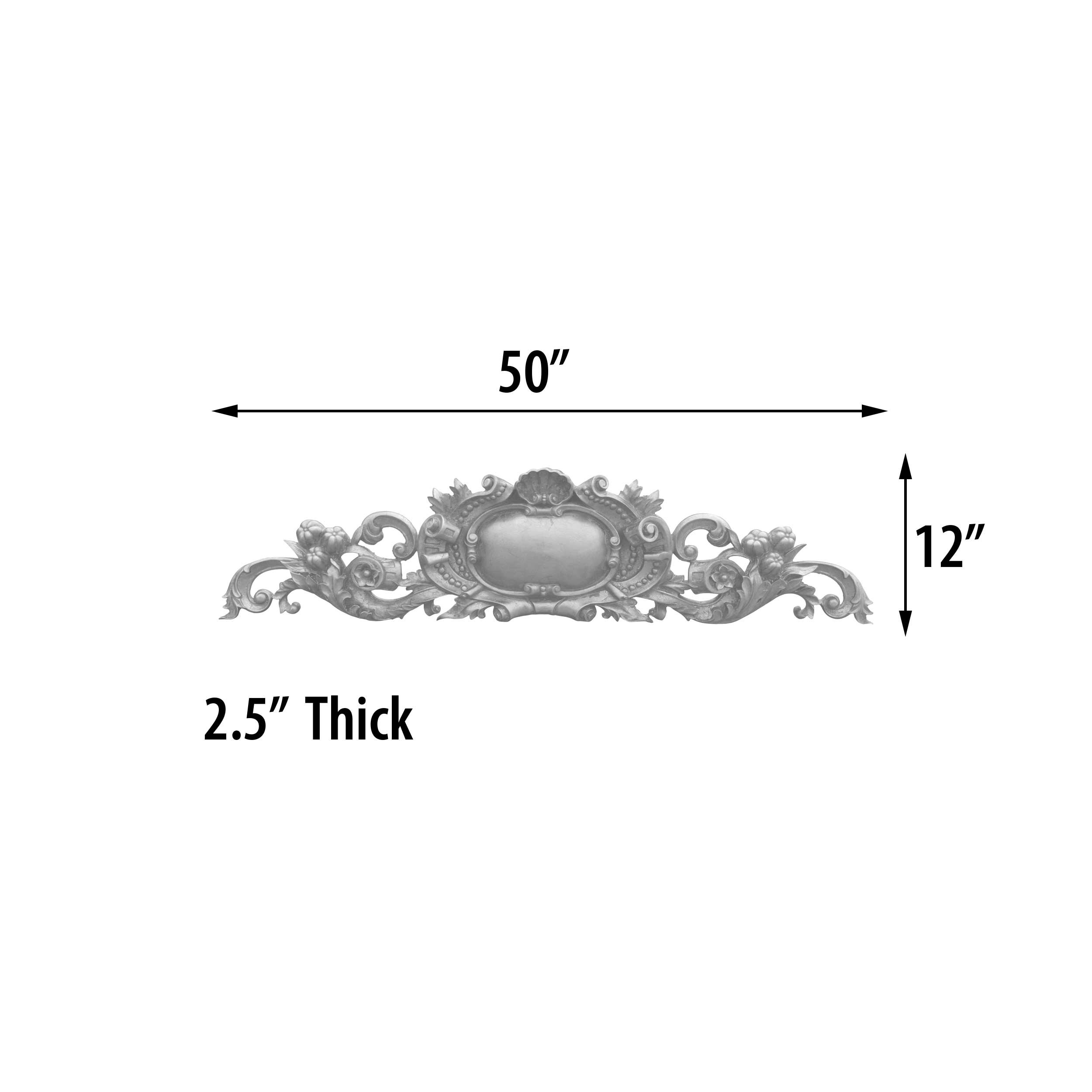This Royal Scroll Gilt Crest Pediment measures 50 inches wide x 2.5 inches deep x 12 inches tall. It is a Rococo influenced architectural element of a classic flowing scroll and crest. The item is hand cast in durable polystyrene. It has the value added aspect of being completely hand finished in antiqued gold leaf. Its a multi useable design adding classic 3 dimensional detail to a wall also often used as a centerpiece for a drapery application, a doorway crest, or possibly a unique way to enhance a headboard. Ships Assembled And Prefinished