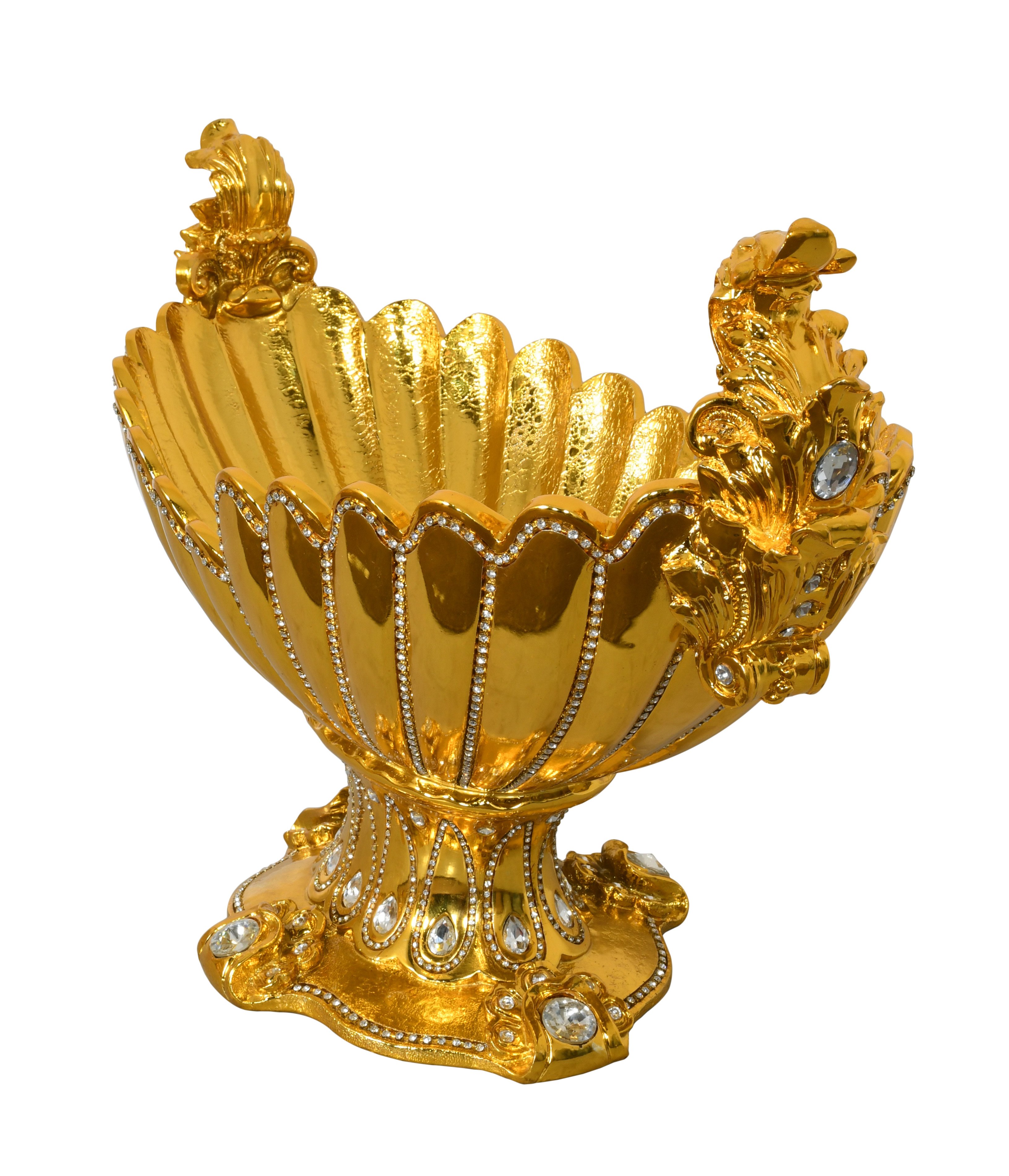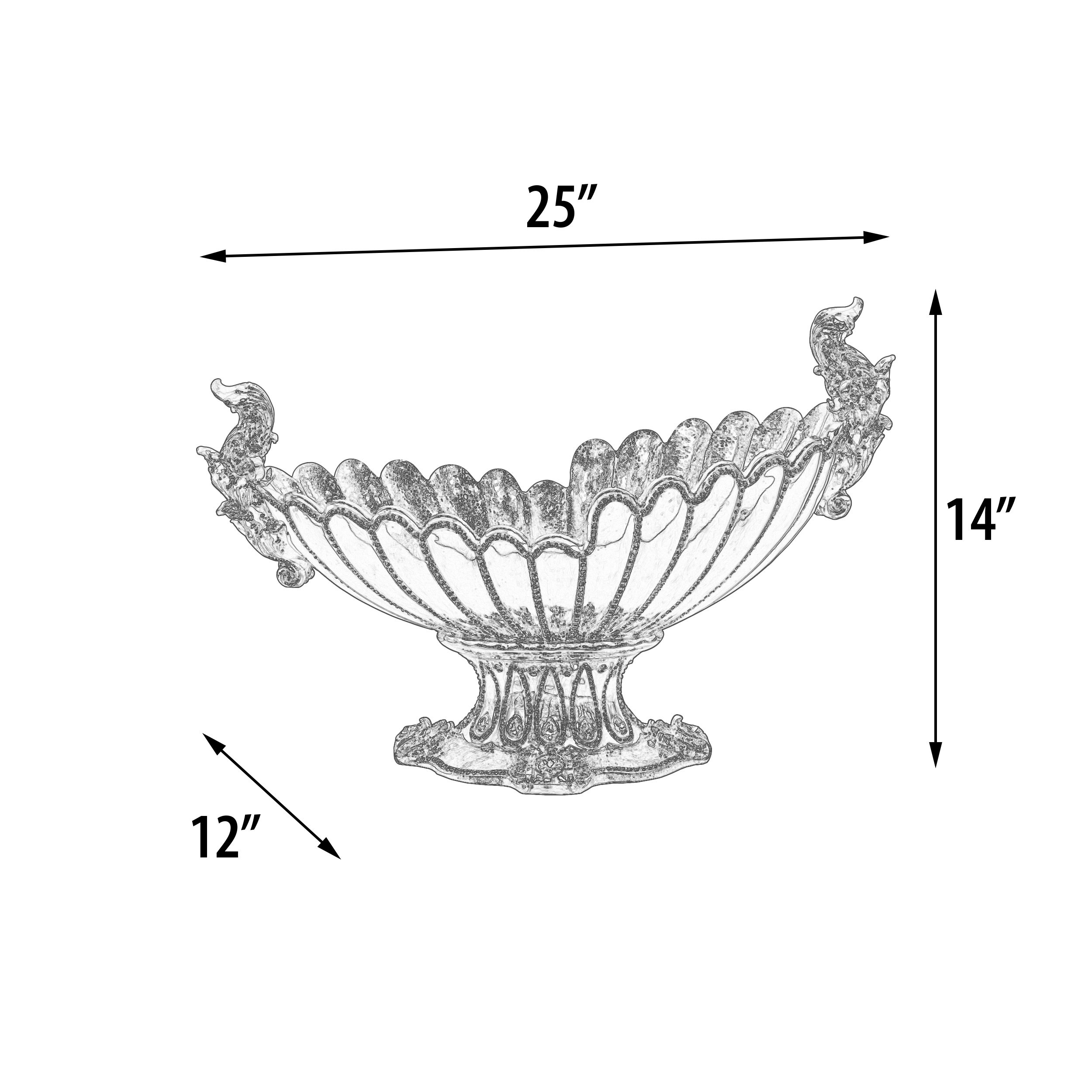 The European Elegance Grand Golden Centerpiece Bowl is a powerful and unique piece that exudes opulence. Its shiny gold color and rhinestone crystal accent the festoon shaped bowl making it a standout centerpiece. This longer and narrower bowl is perfect for a dining table or console, adding a touch of grandeur to any setting. Embrace the allure of European elegance with this striking bowl that commands attention with its grand scale and big look. Elevate your decor with this impressive and versatile centerpiece, perfect for showcasing faux flowers or standing tall as a captivating statement piece on its own.