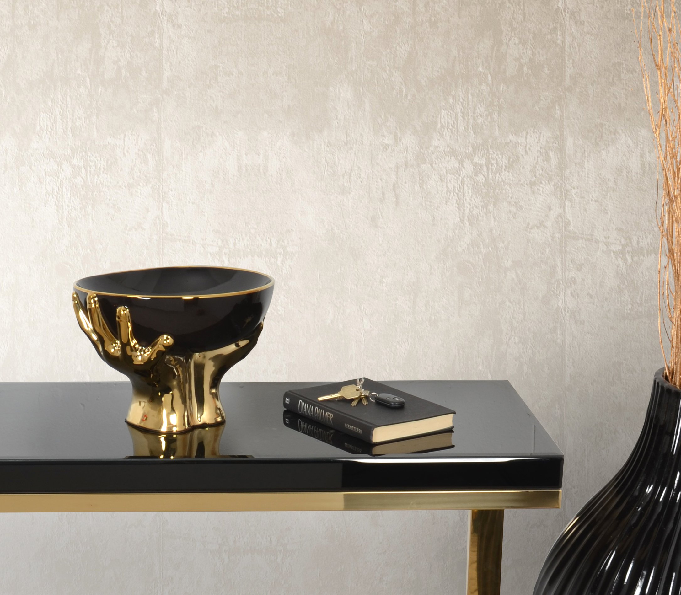 Black Bowl Held by Gold Hands