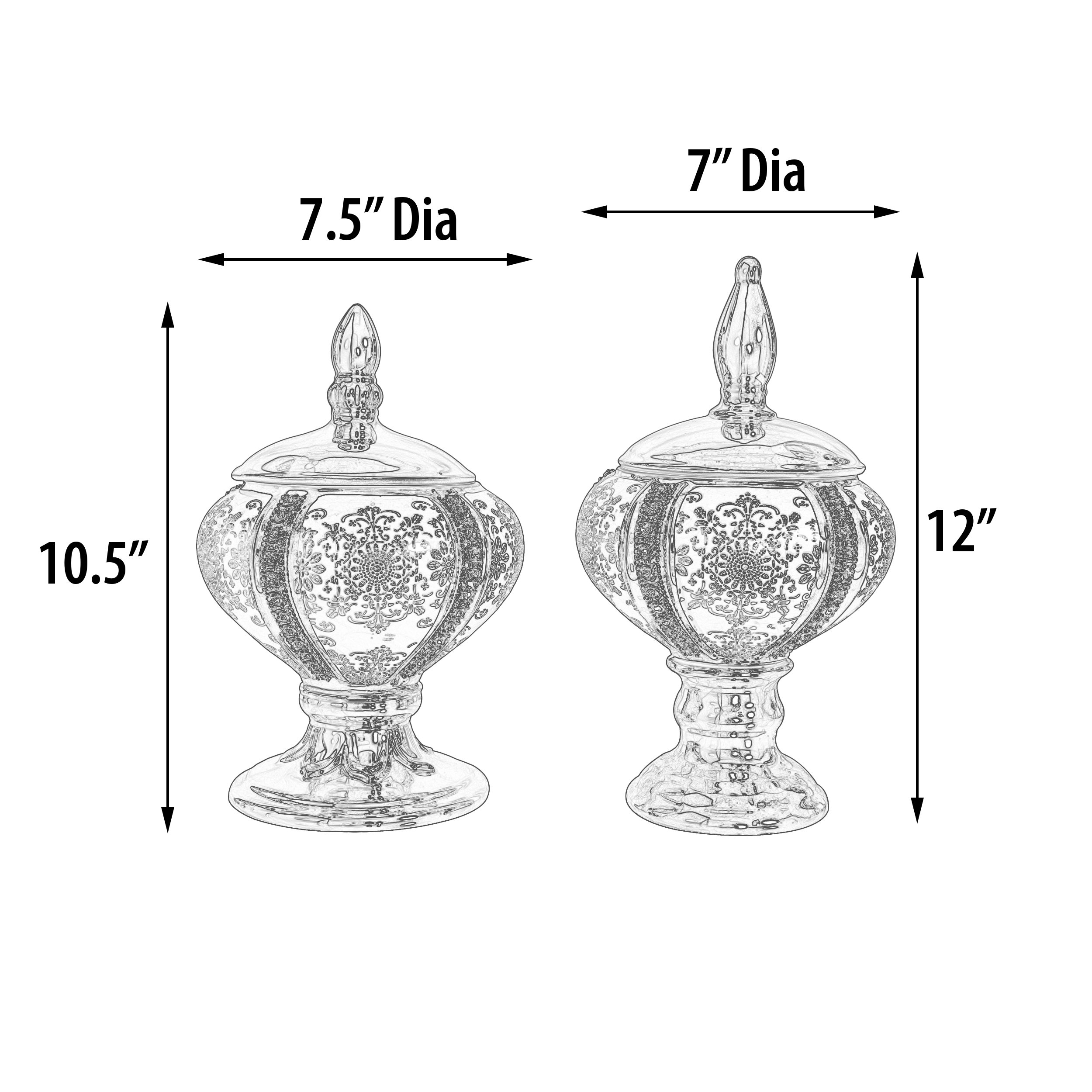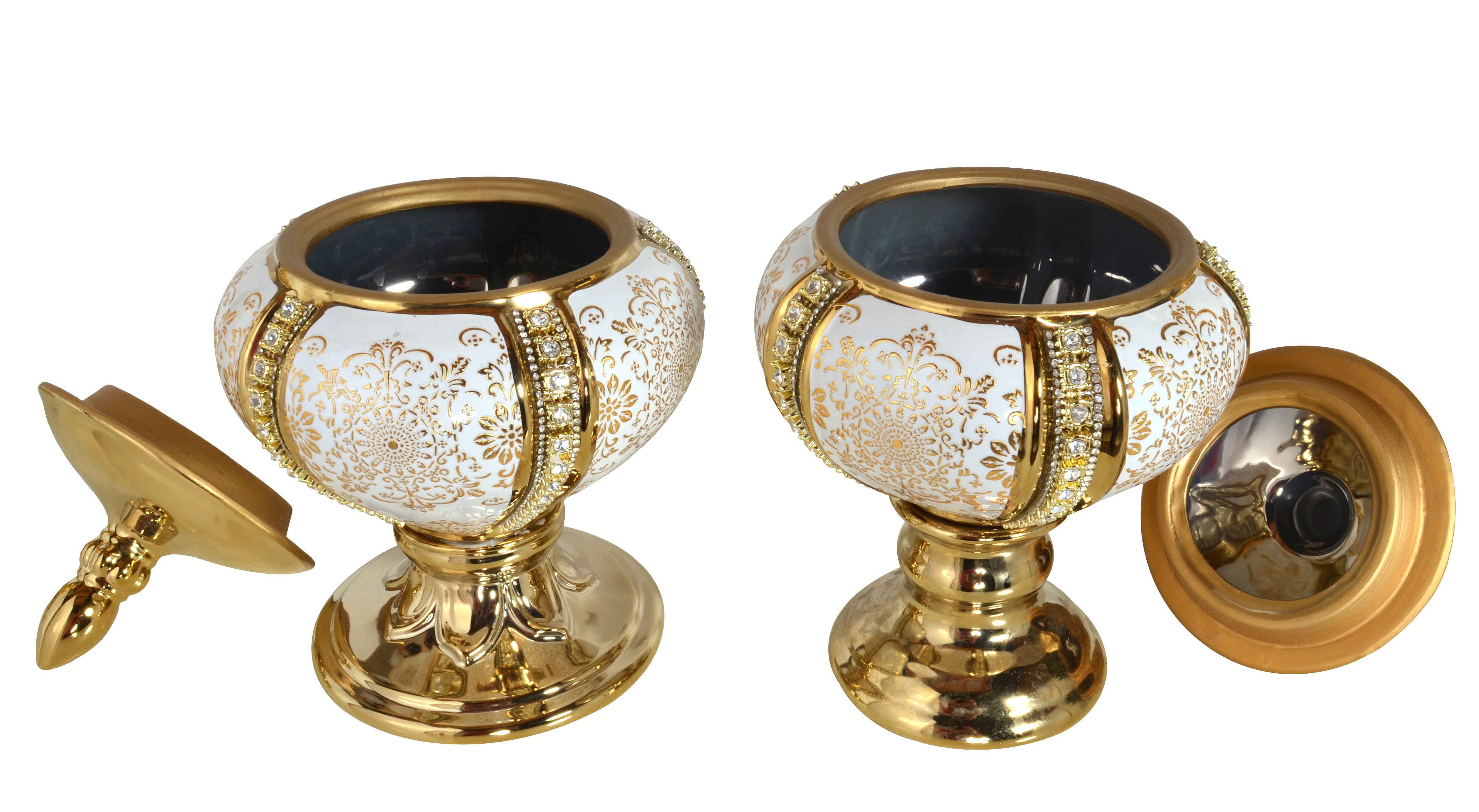Twice the value the Alicia Keepsake Canisters set of 2 is an elegant set of graduated sized decorative containers. These traditional keepsake boxes come with removable lids for use as jewelry, trinket, or storage boxes. Hand cast in white porcelain with gold plating accents. The set features delicate hand applied gold tooling designs. The sides are decorated with vertical bands of hand applied elements of clear and subtle contrasting toned rhinestone crystal. The contrast and design create a rich effect on these handcrafted functional decorative items