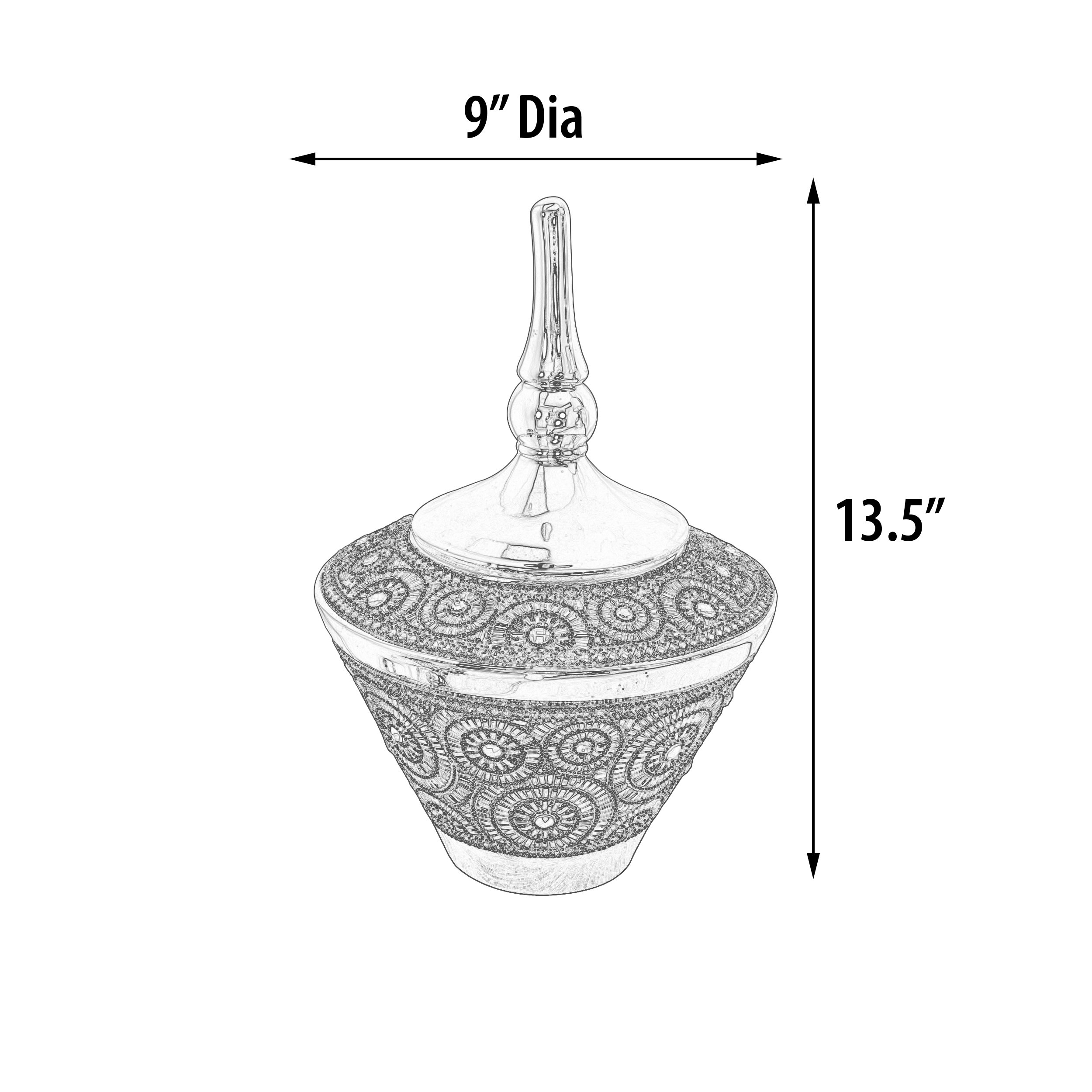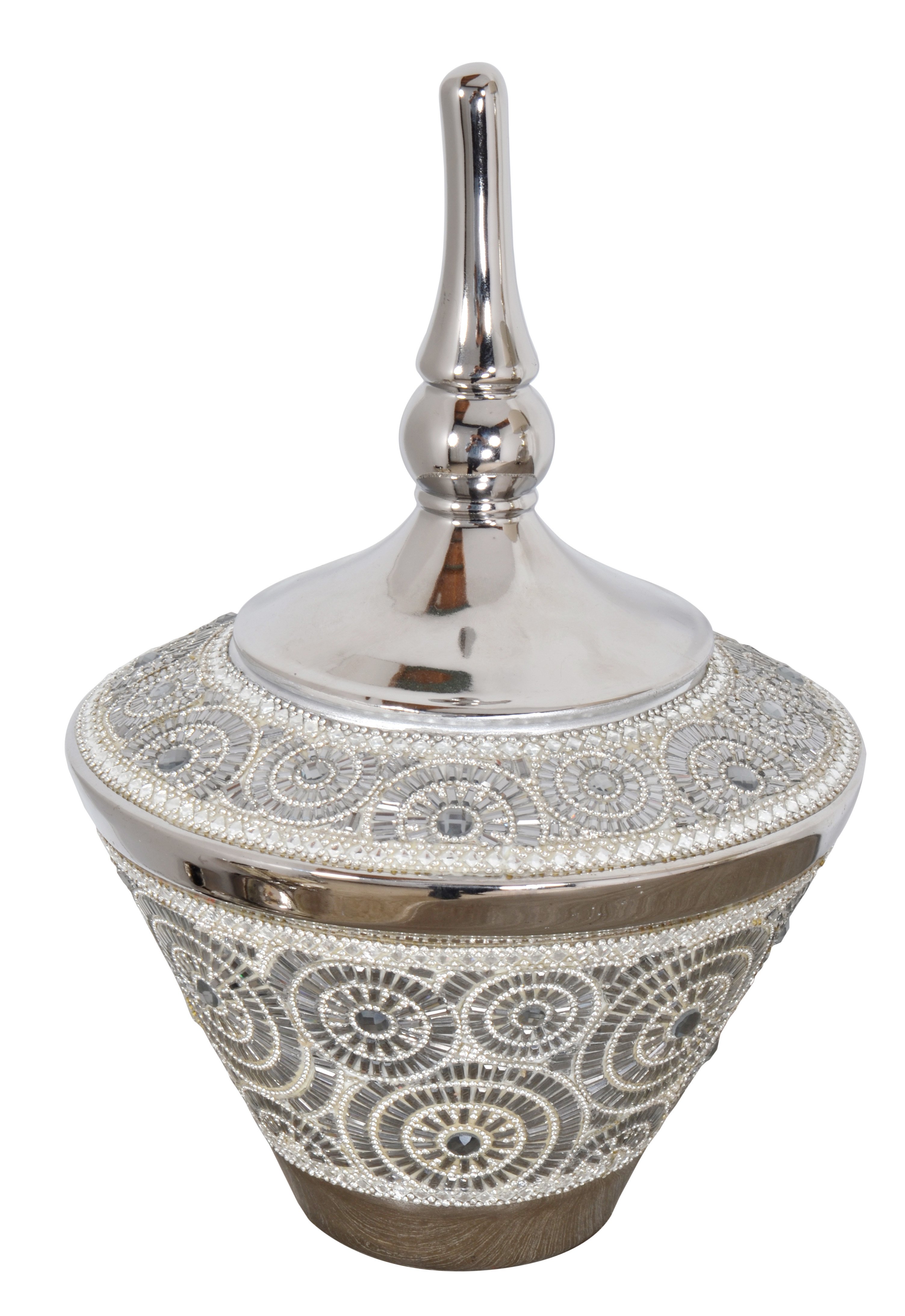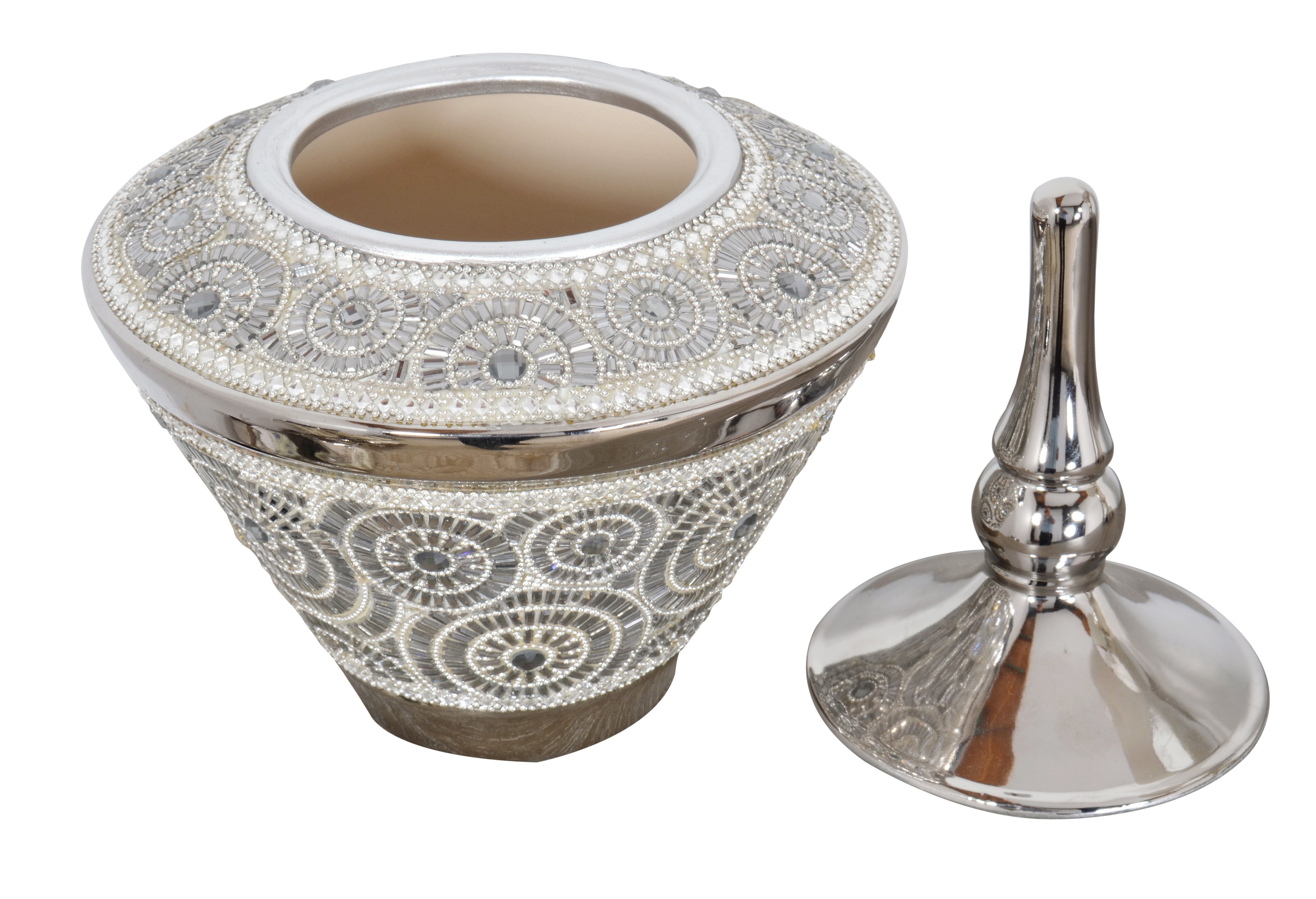 The evolving Sterling selections are amongst the most stunning accessories for those who love the Dazzle of Silver and Crystal. The Sterling and Crystal Box with removable Lid offers a dazzling design and a finish with function. Use to stylishly store jewelry, keepsakes in the prettiest box, and organizer. It is hand cast in porcelain and plated with Silver. Thousands of individual crystals and pearl rhinestone crystals are arranged in circular patterns creating a mesmerizing beauty of glamorous sparkle. No assembly is required.