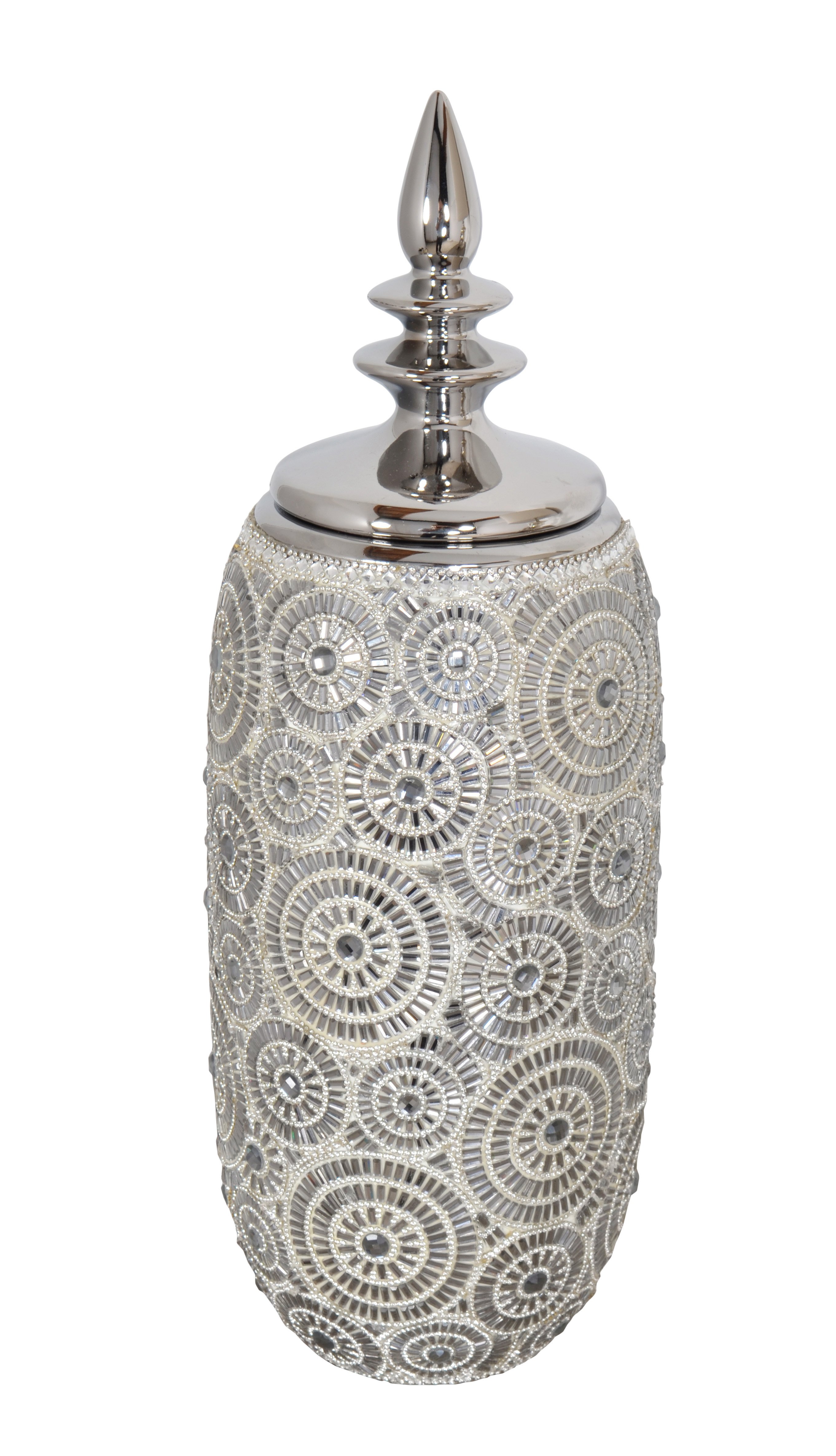 The evolving Sterling selections are amongst the most stunning accessories for those who love the Dazzle of Silver and Crystal. The Sterling and Crystal Cylindrical Vase with Lid offers a dazzling design and a finish with function. Multi functional for storage and stylishly fabulous for display. Hand cast in porcelain and plated with Silver. Thousands of individual crystals and pearl rhinestone crystals are arranged in circular patterns creating a mesmerizing beauty of glamorous sparkle. No assembly is required.