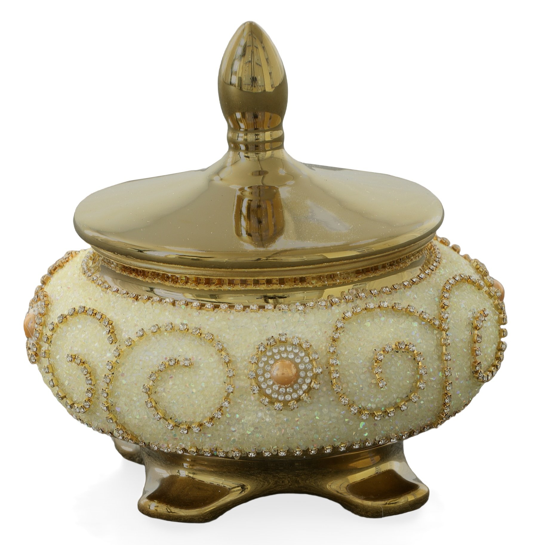 A Pearl And Swirl Golden Keepsake Jewelry Box with removable lid. An attractive find for a ladies desk, dresser, or vanity. Hand cast in porcelain and finished with an applied Gold Plating for richness and durability. The body of the box is uniquely covered in Obliquitous crushed faux Pearls further embellished by artist applied decorative swags of small pronged crystals in a flowing pattern. The combination offers a delicate effect, and the finished creation is beautifully functional. The item is Hand Made and Hand Finished. We would make a nice gift on its own or consider combining it with other new items from our Pearl and Swirl Series by AFD Home. No assembly is required.