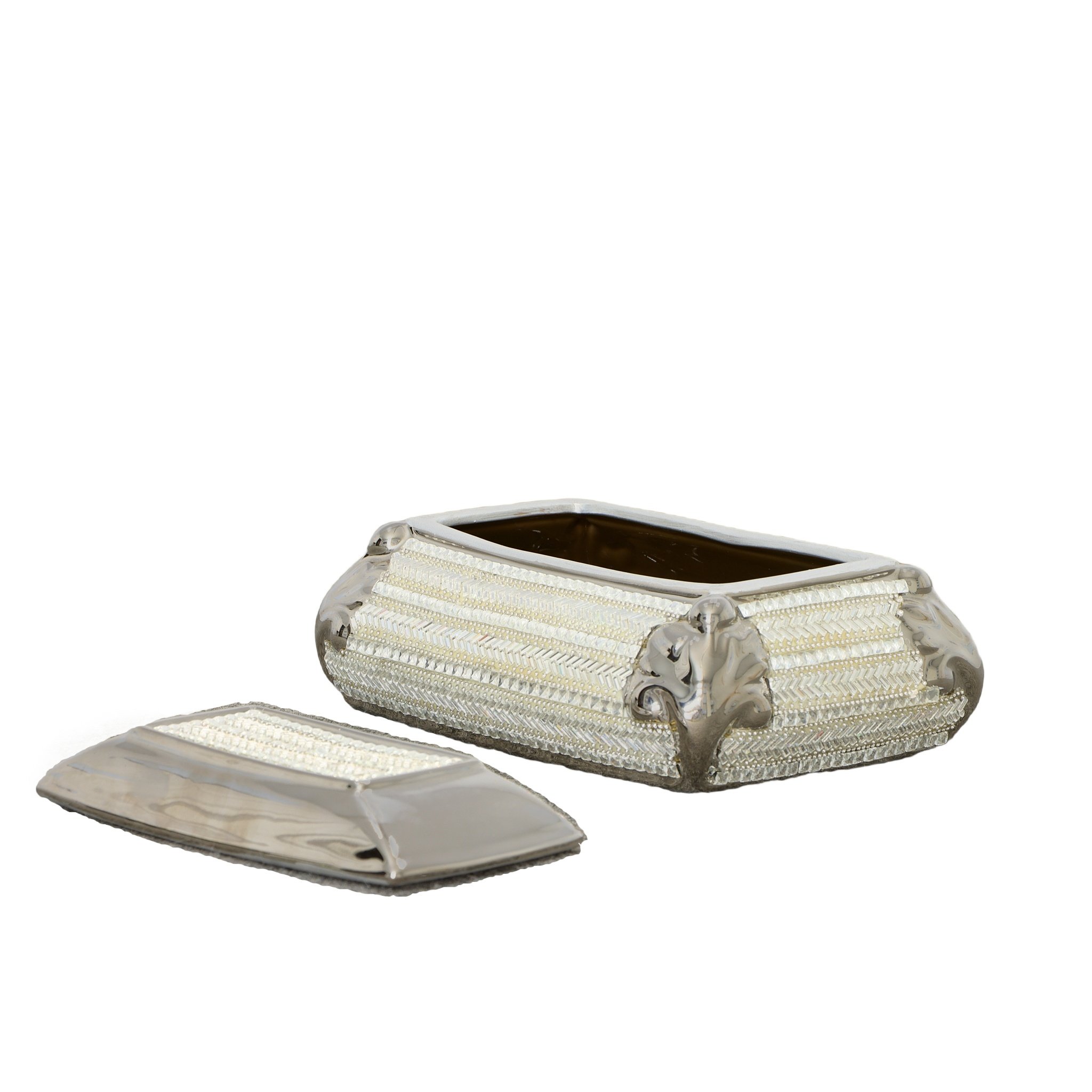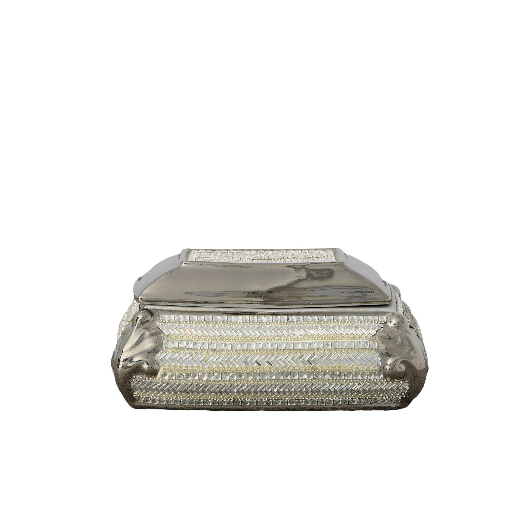A 10 inch wide rectangular jewelry or trinket box, with removable lids for storage, from our Princess Series, is hand cast in porcelain and Chrome plated. It features thousands of individually hand applied Princess Cut Clear Crystals in a zipper cut pattern. The Crystal Chrome effect on this handcrafted decorative item is Stunning. Consider adding to other Princess Series items for a larger display affect. No Assembly required.