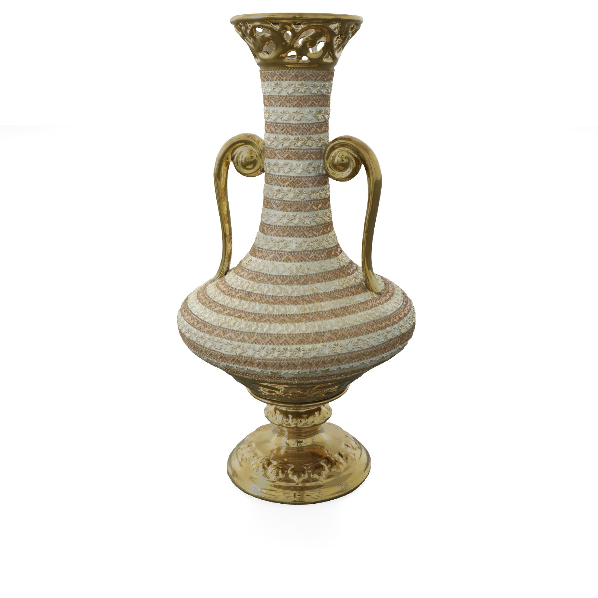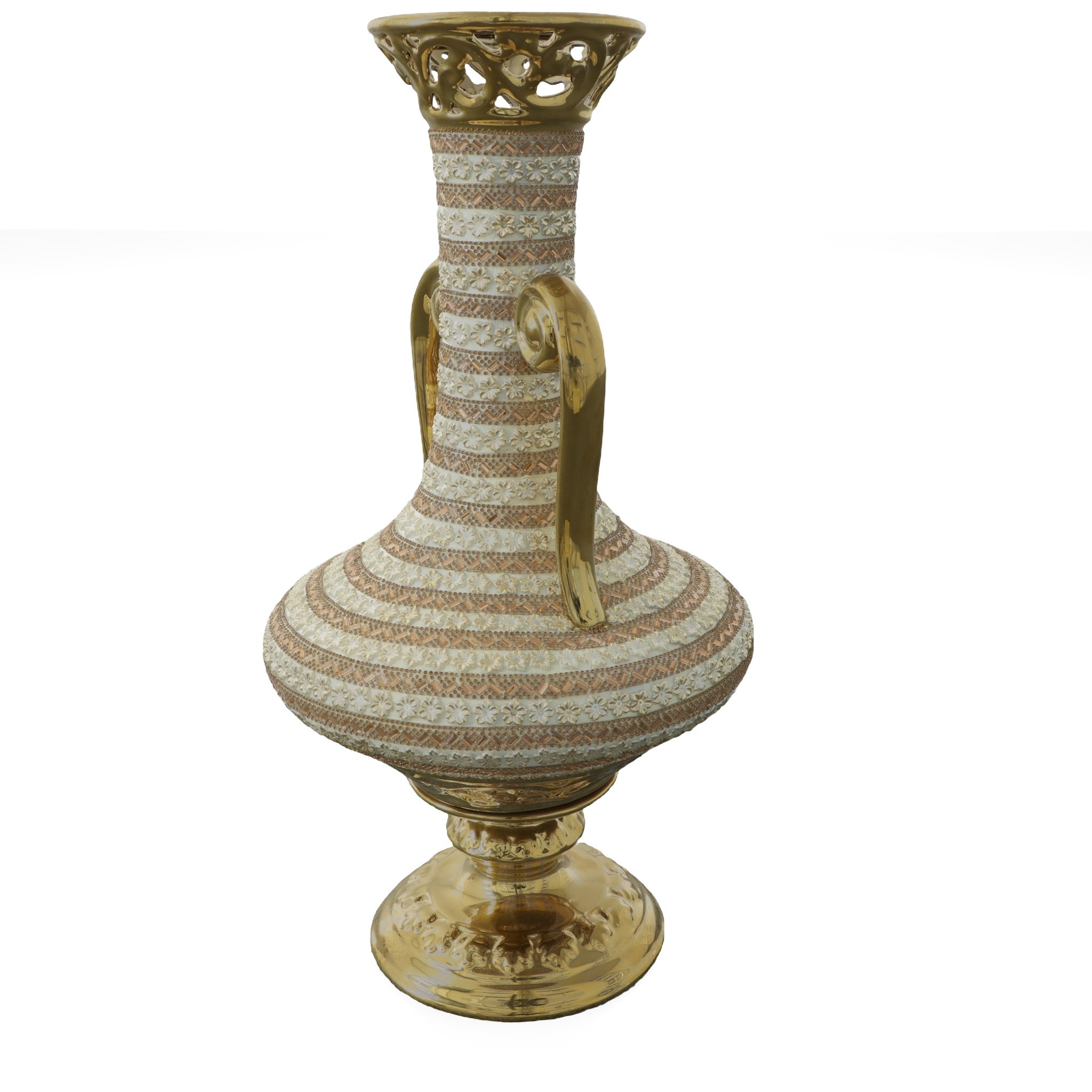 A 21.25" tall Golden Floral Tall Vase with handles, this item is part of our popular Golden Floral Collection. Whether this decorative vase sits alone or it is the perfect vessel for a future flower arrangement, its presence will be noticed. The vase is hand-cast in Porcelain with gold plating. The vase features intermittent applied Rhinestone amber Crystals and petite floral appliques in ambers and whites. They contrast beautifully against the Gold plated finish on the body of the tall vase. The finished item offers a focal bit of sparkle and color that livens up the decor. It can enhance a traditional setting and also crosses into a more contemporary design. Consider ordering a pair for balance or symmetry!