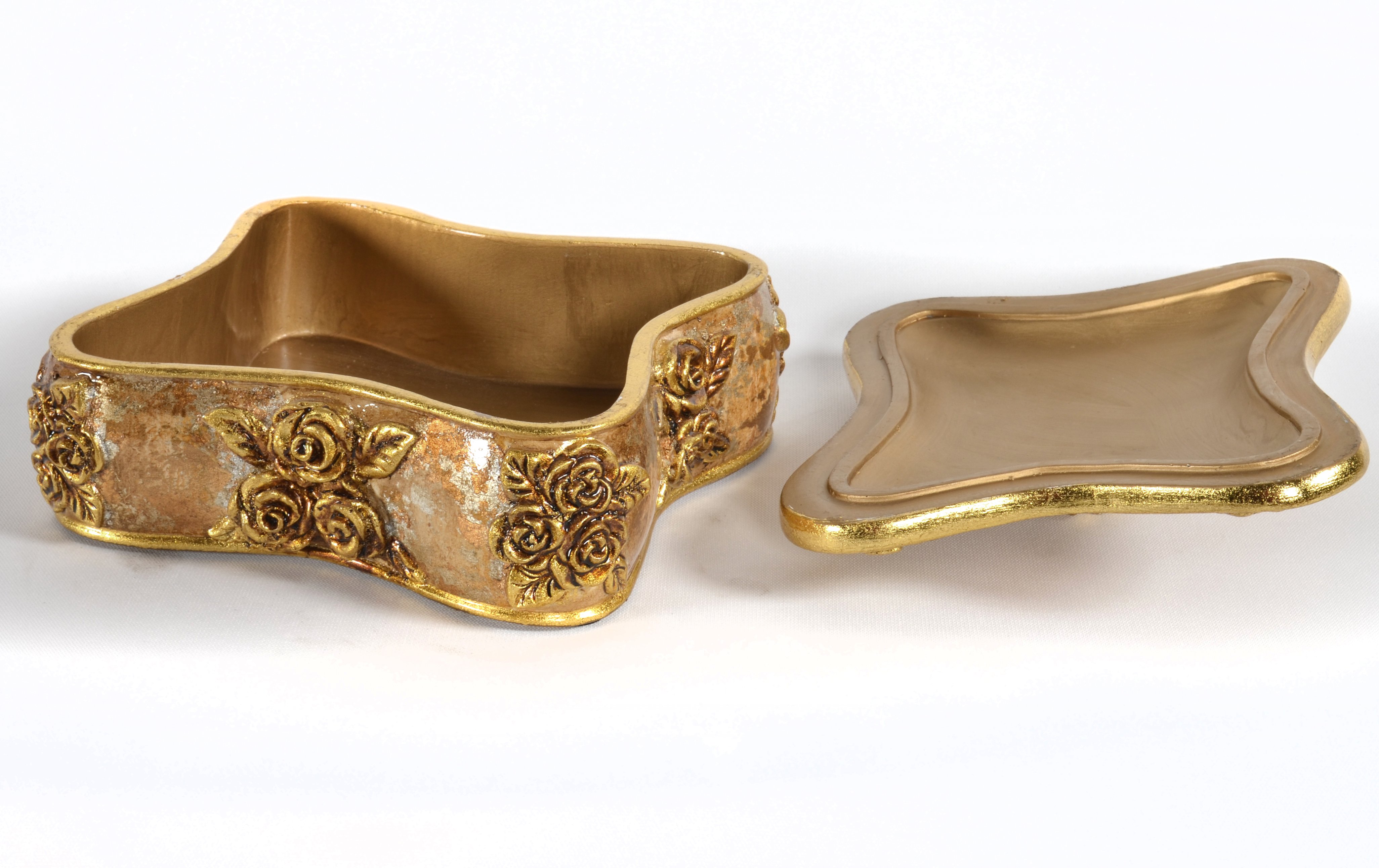 A fine Medici Keepsake Table Box with removable Lid for storage. A good choice for a Ladies Dresser or Vanity. This addition from the House of Medici Collection features deeply carved Roses. A collection inspired by the art of Florence and Italian Renaissance grandeur. The hand finishing in rich jeweled tones creates an interesting contrast with the variegated golds, silvers, and antiquing. Hand cast in durable Polyresin. There are many beautiful offerings from the Fabulous Medici Collection that could combine to create a larger display. One of the most expansive collections offered. No Assembly Required.