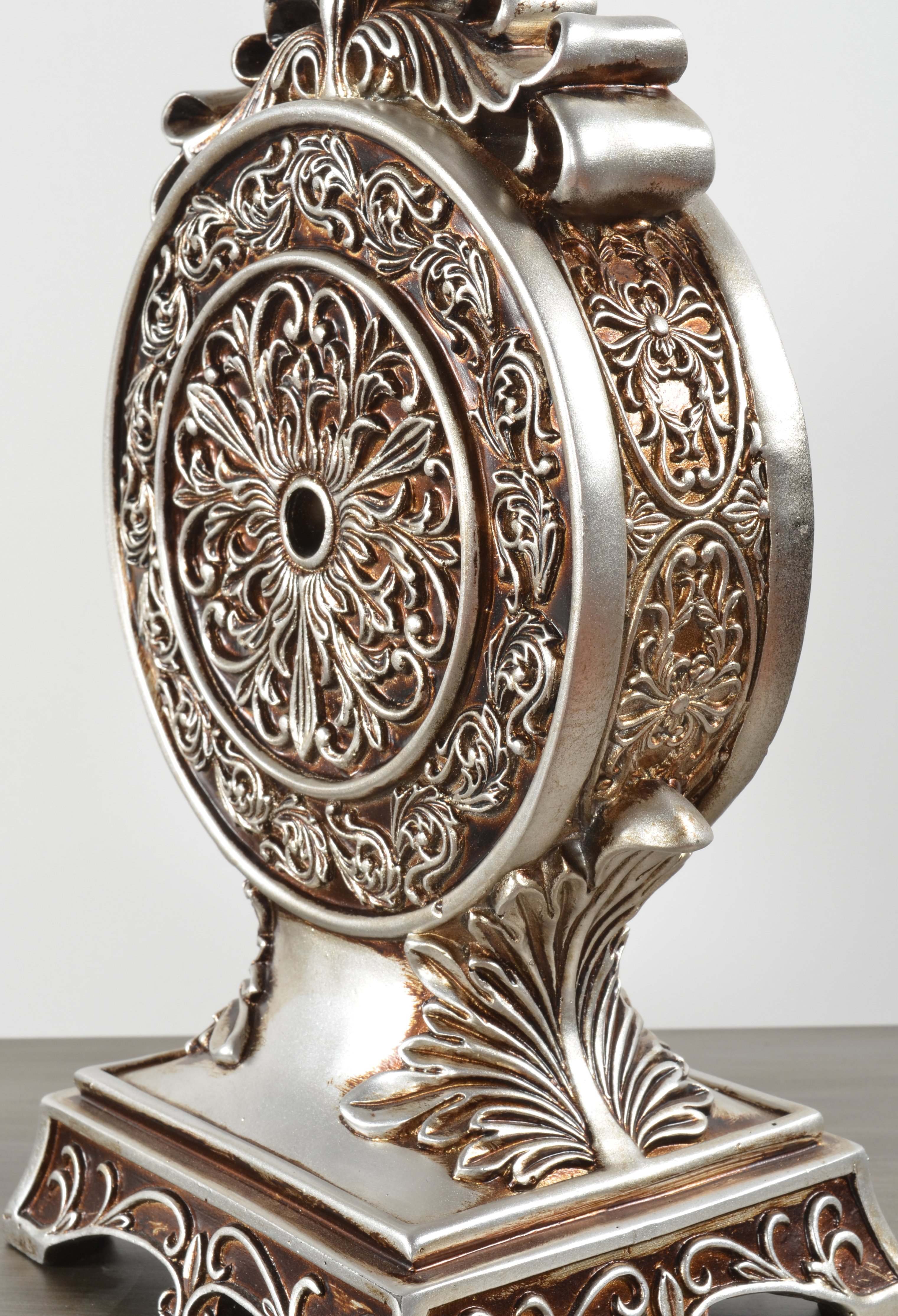 Standing 11 inches tall on an elegant pedestal base the Laviere table clock is hand finished in antique silver with mirror mosaic accents.  The table clock has detailed floral accents around the face with leaf details and scroll work on the base. 1 AA battery (not included) is required for operation.  Functional as well as decorative the Laviere table clock would look good on a tabletop or shelf with good presence to be noticed.