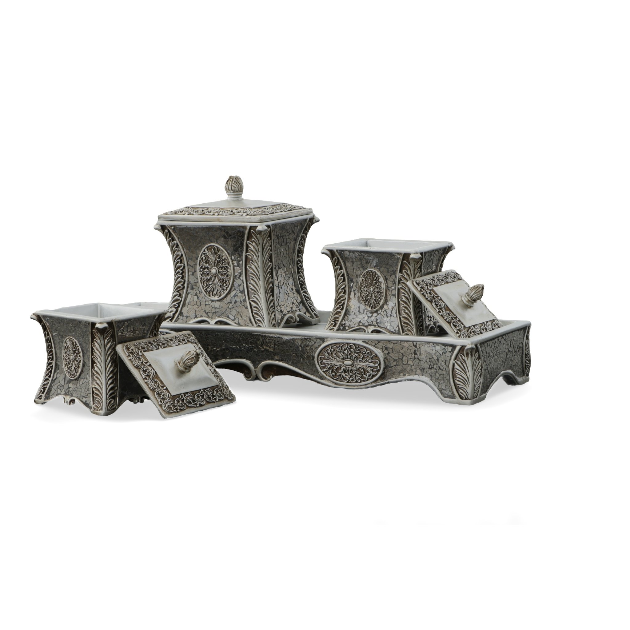 The Laviere Keepsake Organizer Tray Set of 4 is a beautiful set and addition to our Laviere Collection. The Collection is large and offers many other Laviere designed items with lots of sparkle and beauty to enhance your decor. Hand cast in Fiberglass with 1000's of micro mosaic mirror tiles carefully hand applied creating a total glamourous veneer. No Assembly Required