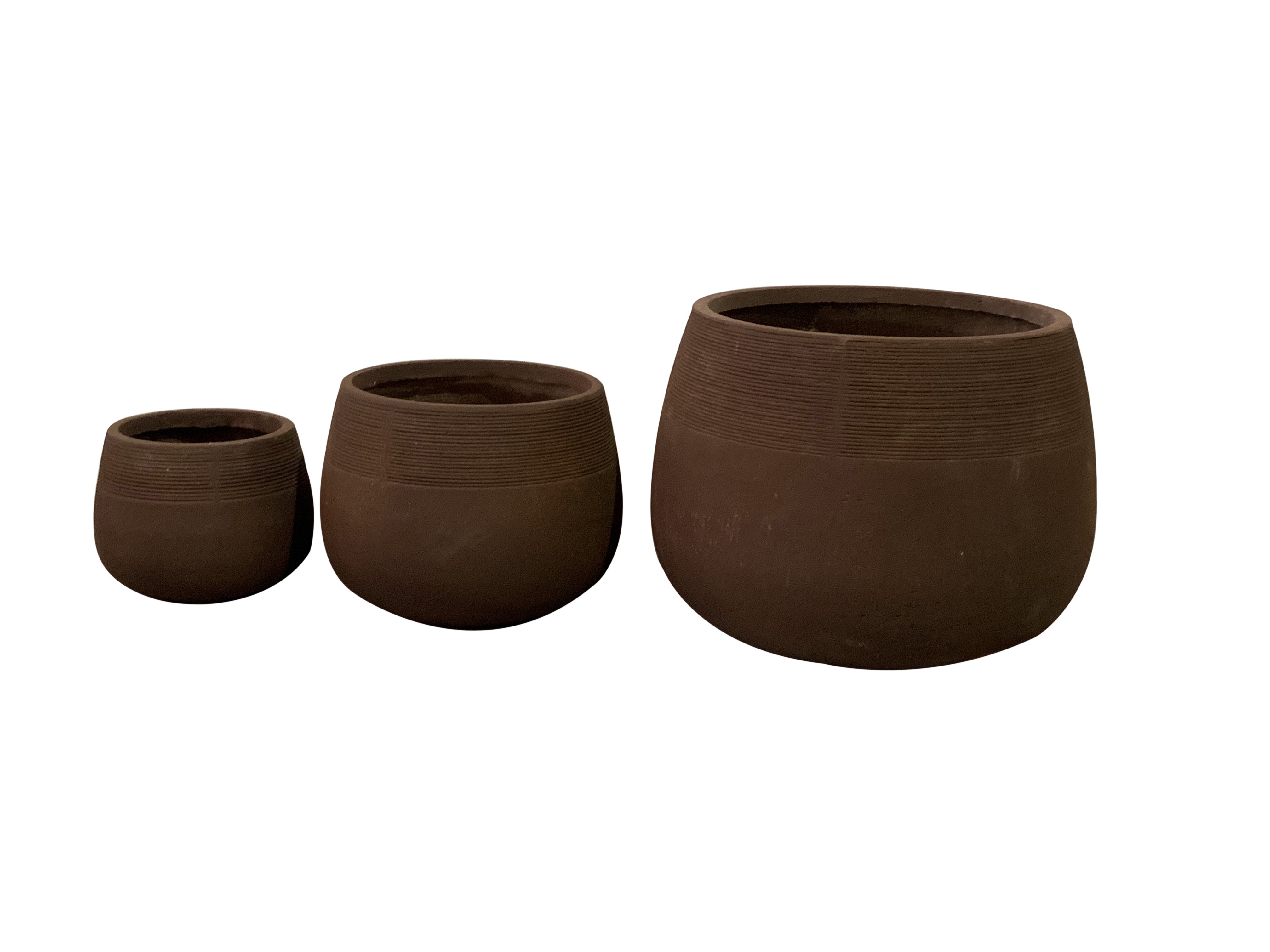 Rust stone finishing Design Planters with stripe Set of 3. The set offers graduated sizes that arrive nested inside each other. A modern rustic style easily placed in a variety of applications from rustic, traditional to the modern mountain. Suitable for indoor or outdoor use. They are hand hast in a durable Fiber Glass reinforced concrete. The hand applied finish offers a Rust tone simulating Terra Cotta color. Another exclusive design by AFD Homes outdoor collection. No Assembly Required