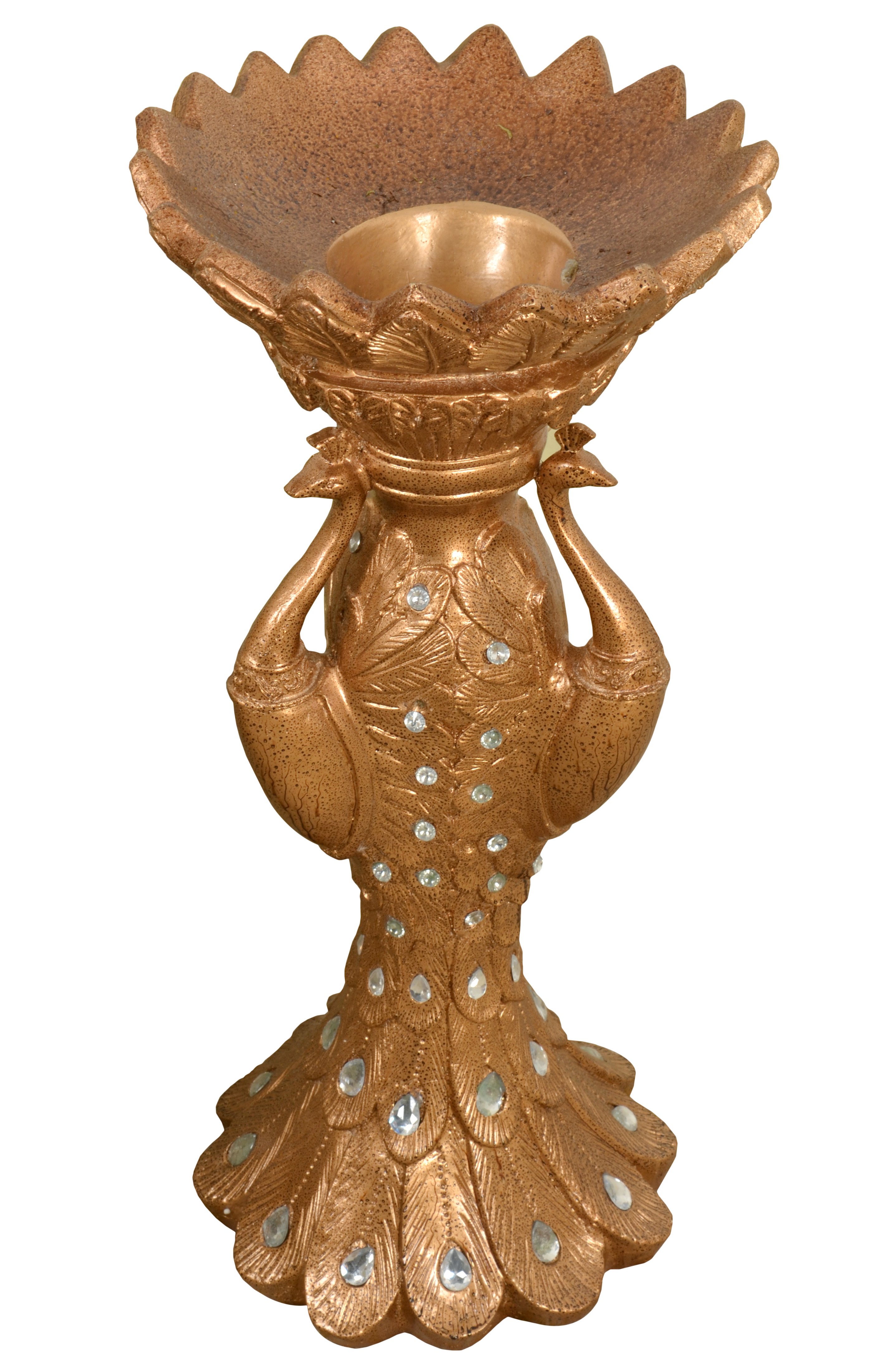 Our popular and a very unique Copper Drizzle Peacock Vase at 12.5" diameter x 28" tall. Featuring a rich hand applied copper drizzle finish with embedded jewels, from our Copper Drizzle Collection. The drizzled affect created uses a dark contrasting umber over a copper base and is further enhanced with a lustrous lacquer top coat. Sold separately but often ordered in pairs for balance and symmetry. This vase is also available in a larger size consider pairing with the Copper Drizzle Large Peacock Vase. The vase is hand cast in a fiberglass resin which is durable and can withstand outdoor applications. The finish however is not recommended for outdoor use unless maintained with protective lacquer top coatings. The frequency of which will depend on your specific conditions.