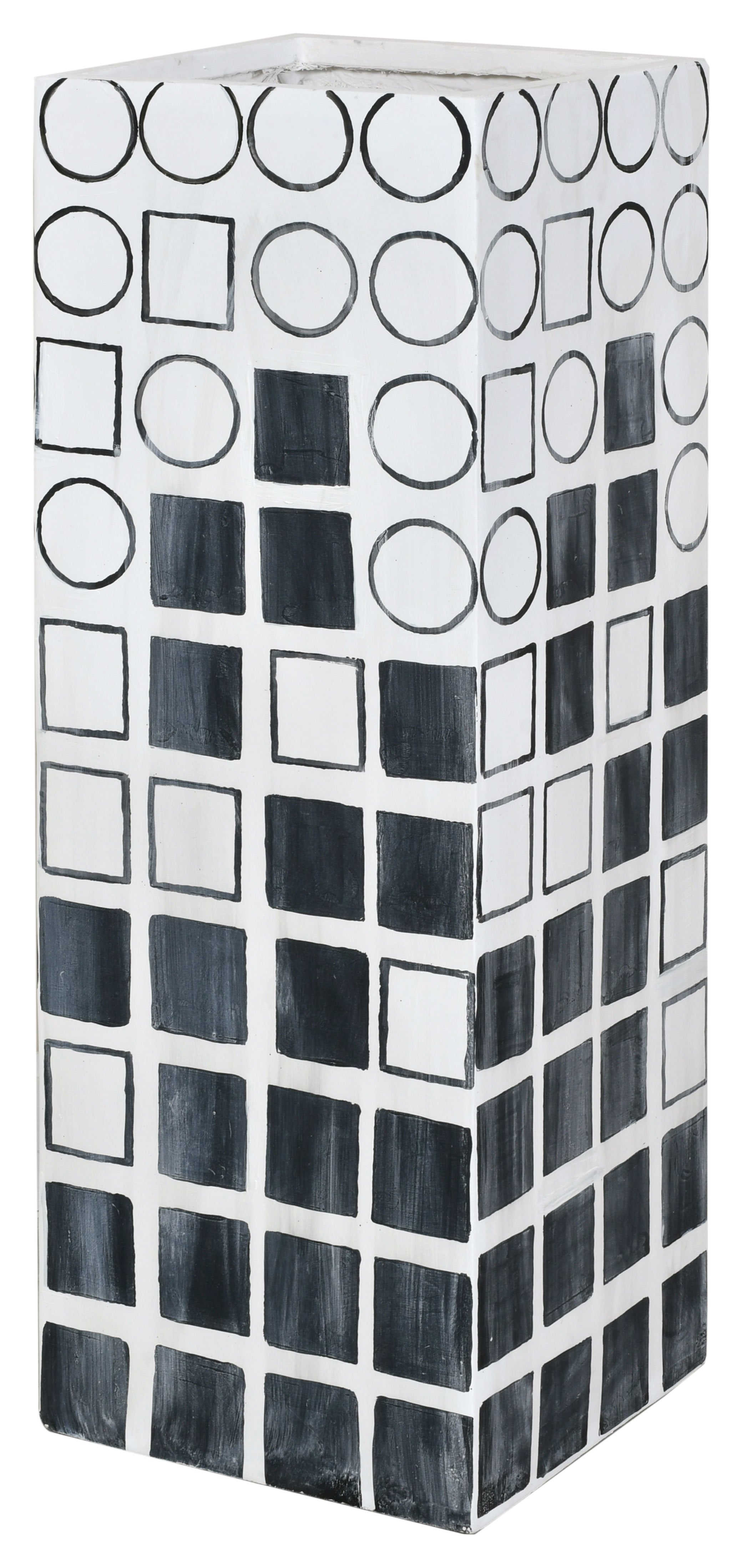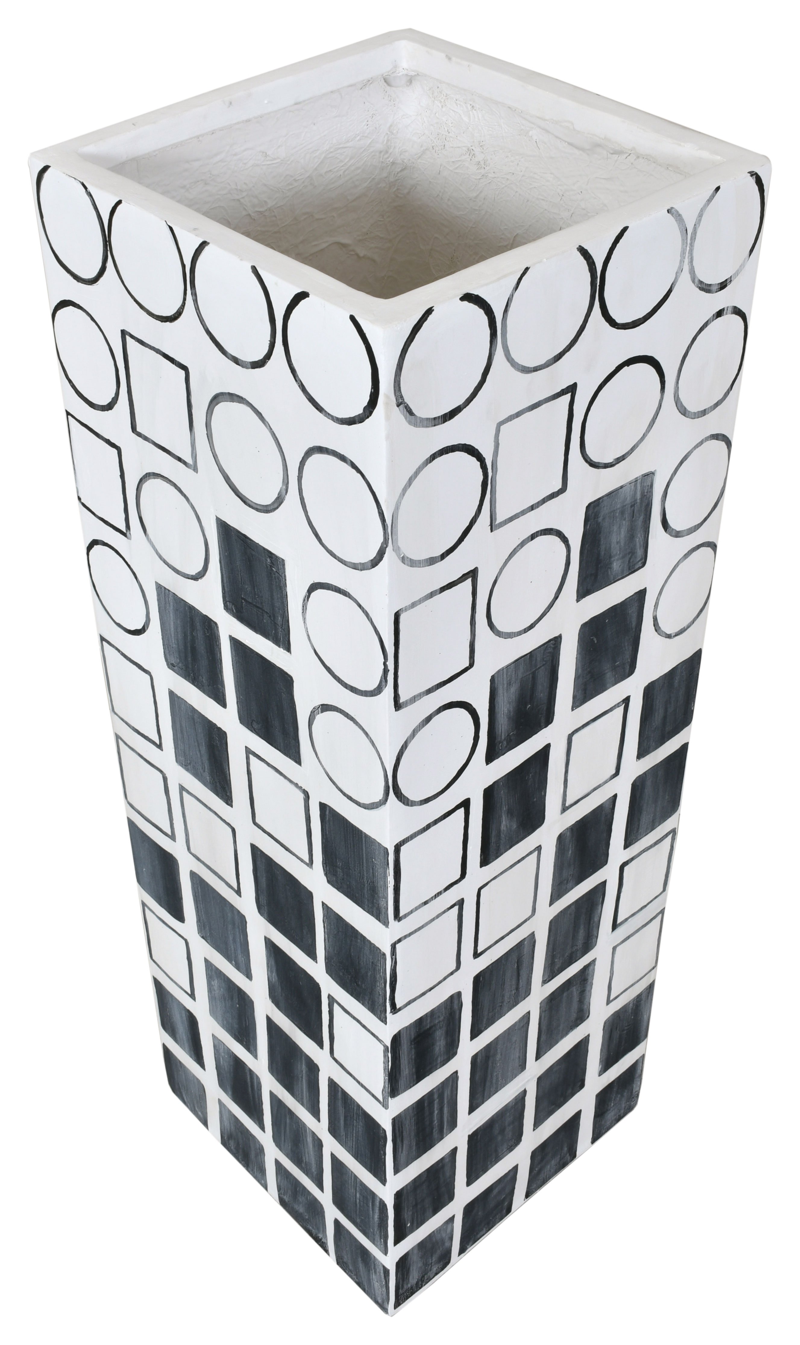 Introducing the 40-inch tall Decorative Planter Vase, a masterful blend of contemporary design and modern flair. With dimensions of 13 inches in both width and depth, this vase is an artistic statement piece, meticulously hand-painted in black and white and adorned with a captivating array of geometric shapes. The medium height of this vase, within its collection, allows for versatile decorative arrangements, whether used on its own or grouped with the 32-inch and 48-inch versions for a visually engaging tiered display. The geometric patterns, rendered in a stark black and white palette, provide a dramatic contrast that accentuates the vase's elegant profile and adds a dynamic touch to any space. This 40-inch planter vase is not only a striking decorative element but also a functional piece, ideal for housing plants or acting as a standalone accent. Its contemporary design complements a variety of decor styles, making it a perfect addition to any modern living room, entryway, or office. Create an atmosphere of sophistication and artistic charm with this exquisite planter vase, transforming any area into a focal point of style and creativity. Whether enhancing a minimalist setting or adding a finishing touch to a boldly decorated space, the 40-inch tall Decorative Planter Vase is sure to captivate and impress.