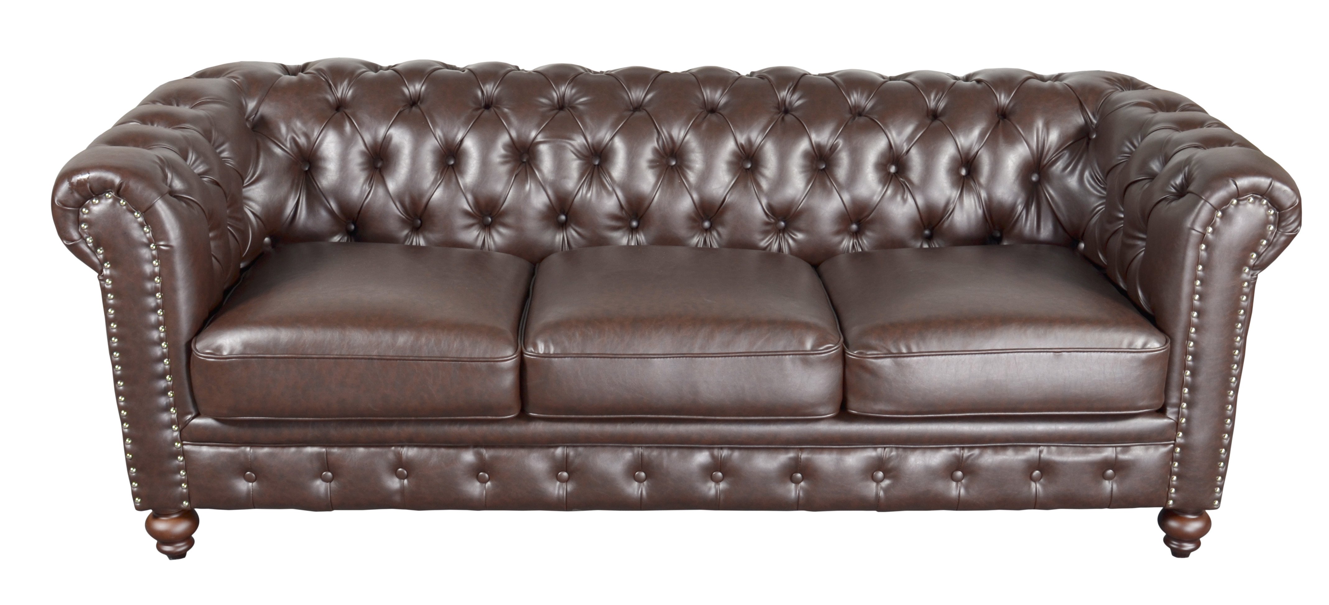 The Classic Chesterfield Brown Sofa 87 inches Wide X 37 inches Deep X 31 inches Tall. In the seemingly endless world of sofa style options, the Chesterfield design is an All Time Classic Timeless in style fitting a wide array of interior designs from Semi Modern to Casual Farmhouse, from Urban Transitional to Classic Traditional. The Chesterfield is often a favorite Designer choice. This beautiful offering from the AFD Home Collection is available in a variety of seating configurations, from sofa sets to sectionals that are also offered in a variety of popular covers. The frames are constructed in wood and plywood solids. The Cushions are very comfortable with embedded spring coil construction, which also helps keep the seating looking newer longer. The Brown Micro Bonded Leather has a very nice hand or feel. It uses a very durable micro-leather tested to 30, 000 Double Rubs exceeding Industry Residential Standards. Consider ordering the matching Love Seat and Chair to complete the set. Light Assembly of legs required.