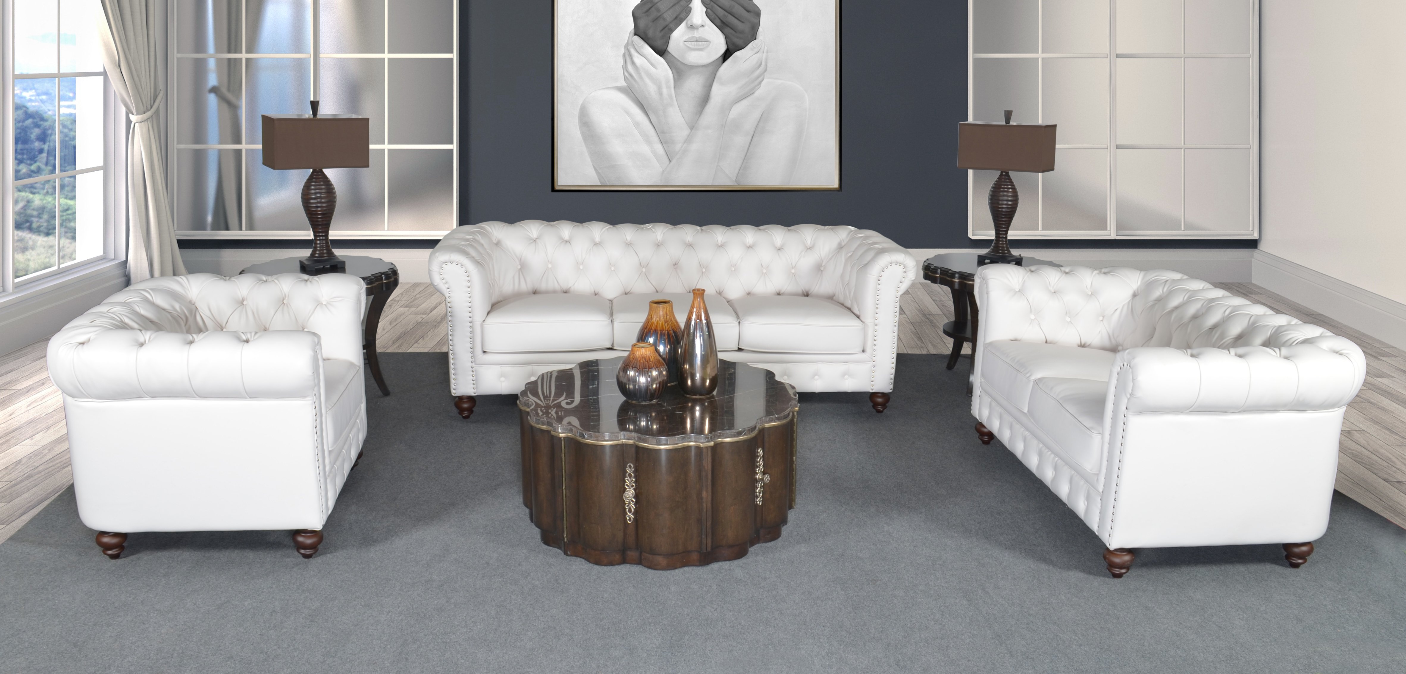 The Classic Chesterfield White Sofa Set of 3 Includes an 87 inches Wide Sofa, a 63 Inch Wide Loveseat and a spacious 43 Inch wide Chair. In the seemingly endless world of sofa style options, the Chesterfield design is an all Time Classic. Timeless in style, fitting a wide array of interior designs from Semi Modern to Casual Farmhouse, from Urban Transitional to Classic Traditional. The Chesterfield is often a favorite Designer choice. This beautiful offering from the AFD Home Collection is available in a variety of seating configurations, from the complete Sofa set shown available in a variety of colors to sectionals. The frames are constructed in wood and plywood solids. The Cushions are very comfortable with embedded spring coil construction, which also helps keep the seating looking newer longer. The White Micro Bonded Leather has a very nice hand or feel. It uses a very durable micro-leather tested to 30, 000 Double Rubs exceeding Industry Residential Standards. Individual pieces of this set can be ordered separately to create your perfect design. Light Assembly of legs required.