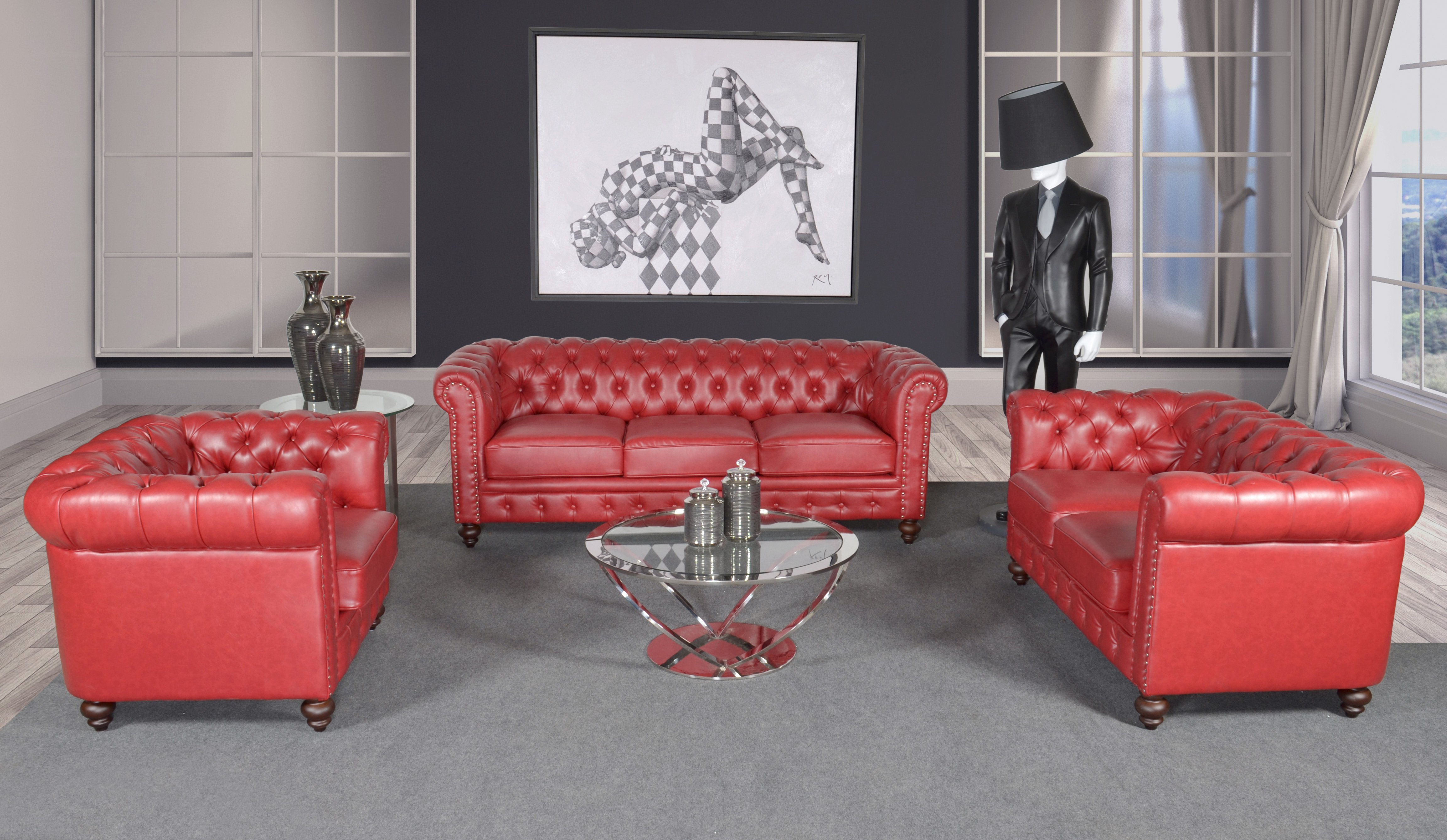 The Classic Chesterfield Red Sofa Set of 3 Includes an 87 inches Wide Sofa, a 63 Inch Wide Loveseat and a spacious 43 Inch wide Chair. In the seemingly endless world of sofa style options, the Chesterfield design is an all Time Classic. Timeless in style, fitting a wide array of interior designs from Semi Modern to Casual Farmhouse, from Urban Transitional to Classic Traditional. The Chesterfield is often a favorite Designer choice. This beautiful offering from the AFD Home Collection is available in a variety of seating configurations, from the complete Sofa set shown available in a variety of colors to sectionals. The frames are constructed in wood and plywood solids. The Cushions are very comfortable with embedded spring coil construction, which also helps keep the seating looking newer longer. The Red Micro Bonded Leather has a very nice hand or feel. It uses a very durable micro-leather tested to 30, 000 Double Rubs exceeding Industry Residential Standards. Individual pieces of this set can be ordered separately to create your perfect design. Light Assembly of legs required.