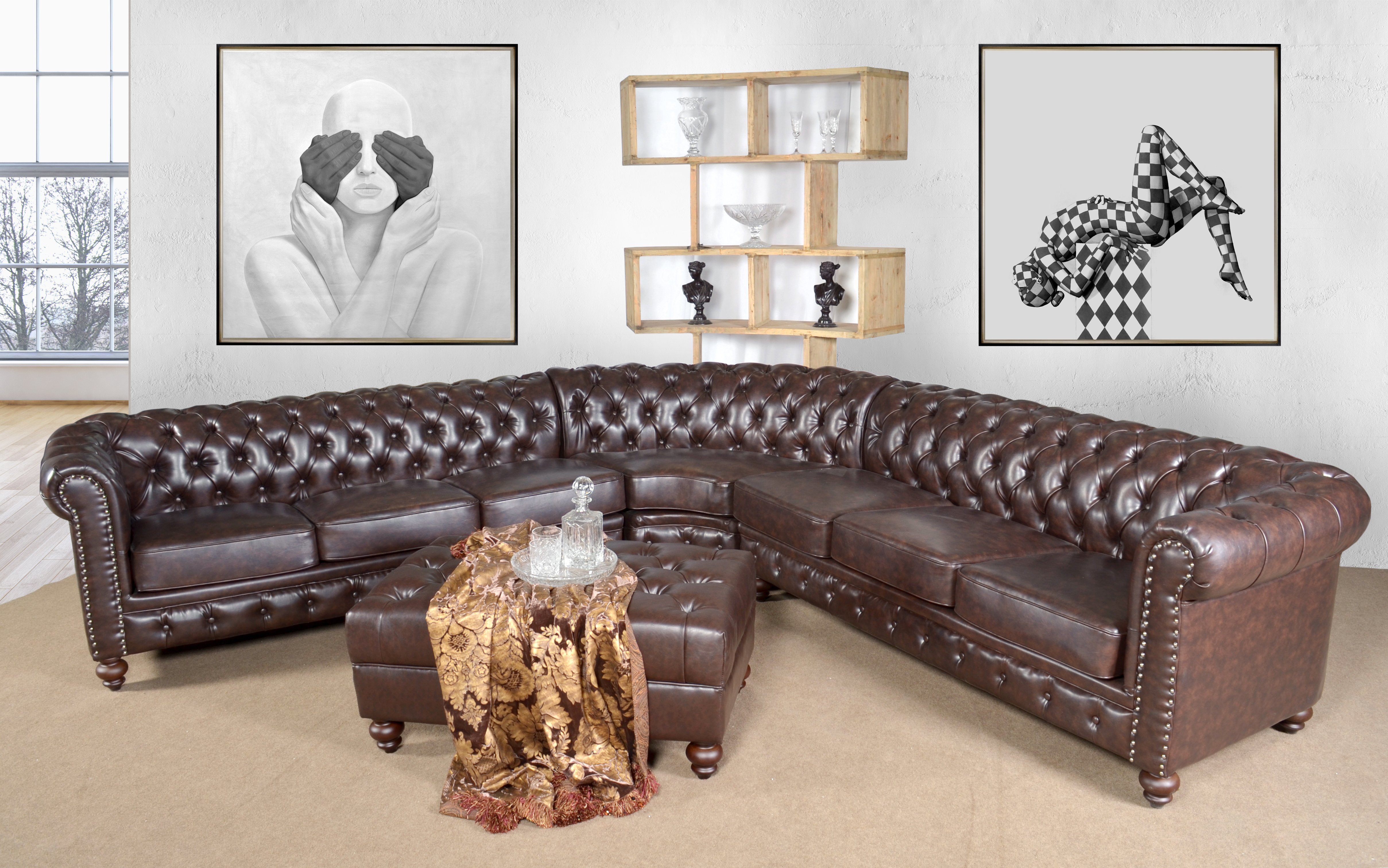 Classic Chesterfield Brown Sectional with Ottoman (KIT)
