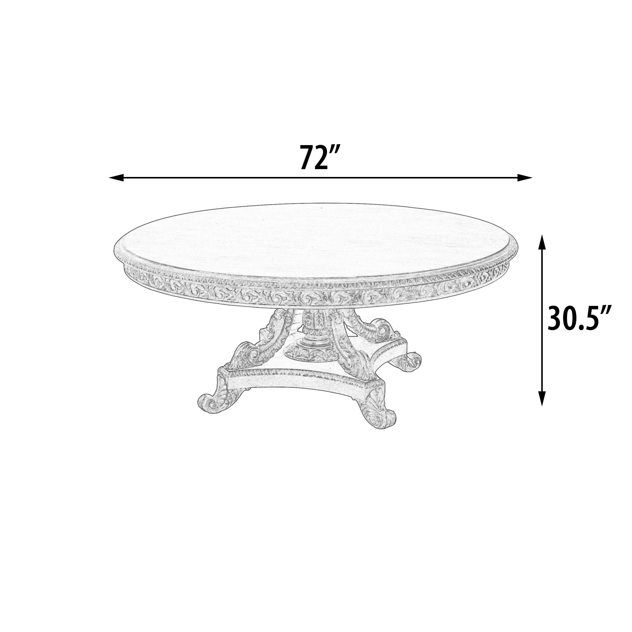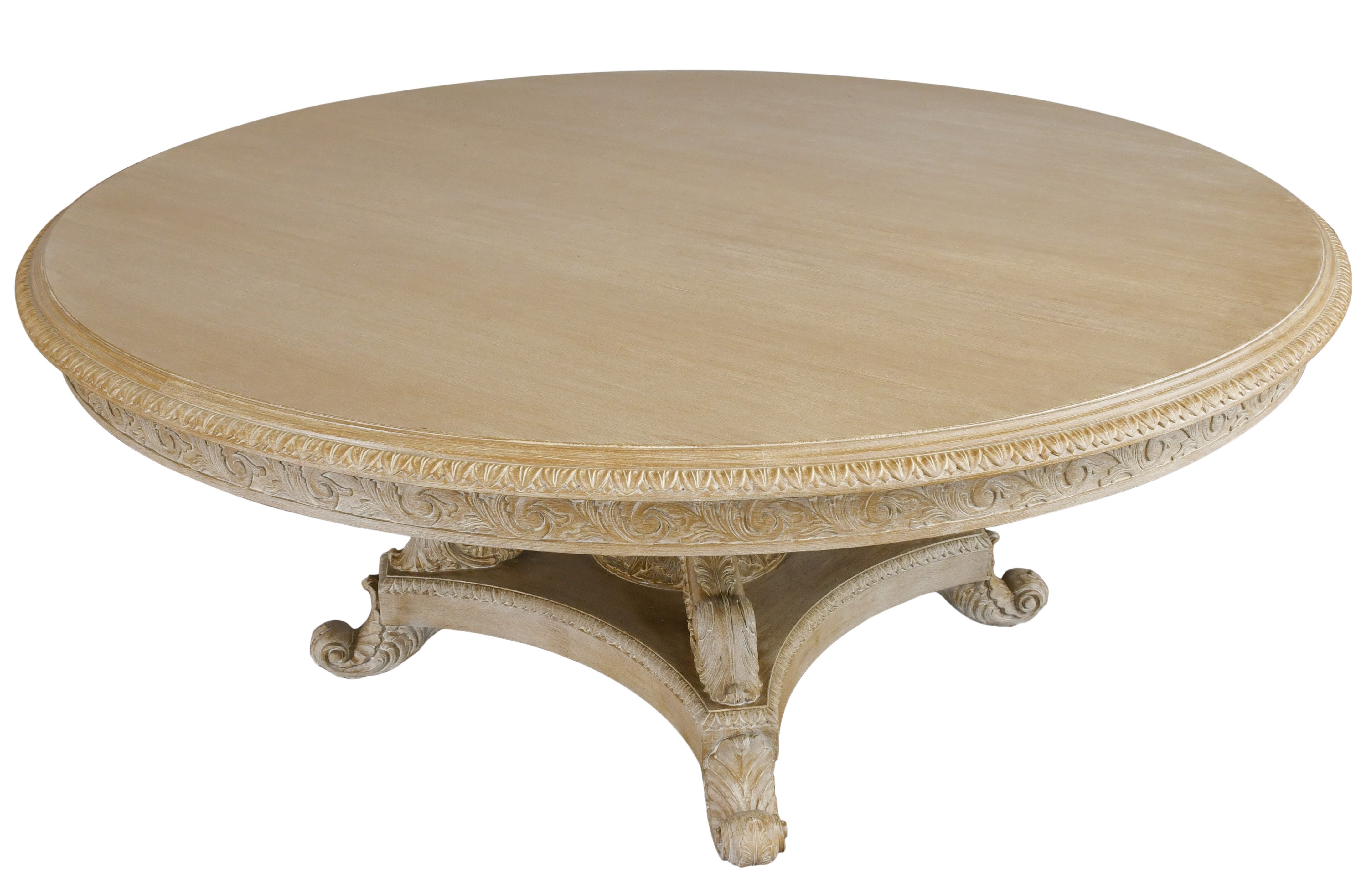 The Anglia Pedestal Round Dining Table from Heritage Furniture, a centerpiece that exudes timeless elegance and meticulous craftsmanship. As part of the esteemed Heritage Collection, this table represents one of the original pieces, renowned for its stunning hand-carved details and versatile design options. The Anglia Dining Table is available with a solid mahogany wood top or a glass top, each option designed to highlight the table's exquisite base. Choose between a 60" or 72" diameter to best suit your space and design preferences. The glass top version offers a unique opportunity to fully appreciate the intricate carvings of the base, providing a clear view that complements the table's artistic appeal. Offered in all Heritage finishes, the Anglia table can be personalized to harmonize with your interior design. Whether you prefer beachstone finish or another combination, each choice reflects the table's adaptable elegance. The table in the beachstone finish features turn-of-the-century styling, scaled to contemporary American standards, showcasing the depth of its carving and the craftsmanship invested in every detail. Constructed from kiln-dried mahogany sourced from replanted forests, the Anglia table emphasizes Heritage Furniture's commitment to environmental responsibility. The wood is carefully prepared to ensure lasting stability and durability, with each table undergoing rigorous stress and pressure testing. Pair this magnificent table with casual dining chairs like the Bordeaux or explore other Heritage Seating Options to create your ideal mix-and-match set. For a fully coordinated dining experience, consider the Anglia Lazy Susan, especially if selecting the larger tabletop. Handmade and imported from Indonesia, the Anglia Pedestal Round Dining Table is more than a piece of furniture—it's a functional work of art, backed by the Heritage warranty and designed to be cherished for generations. Whether anchoring a formal dining room or serving as a grand center table, the Anglia brings unparalleled beauty and craftsmanship to your home.