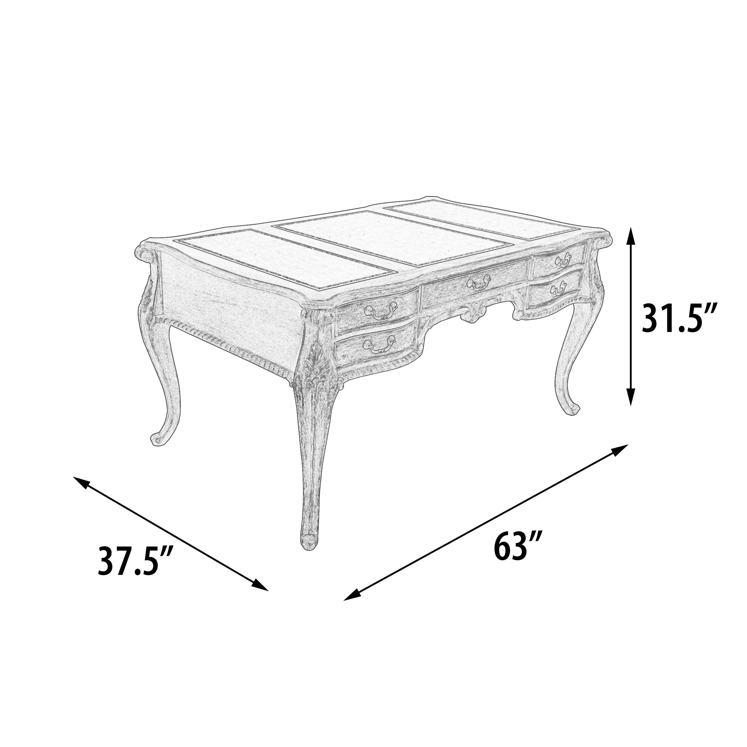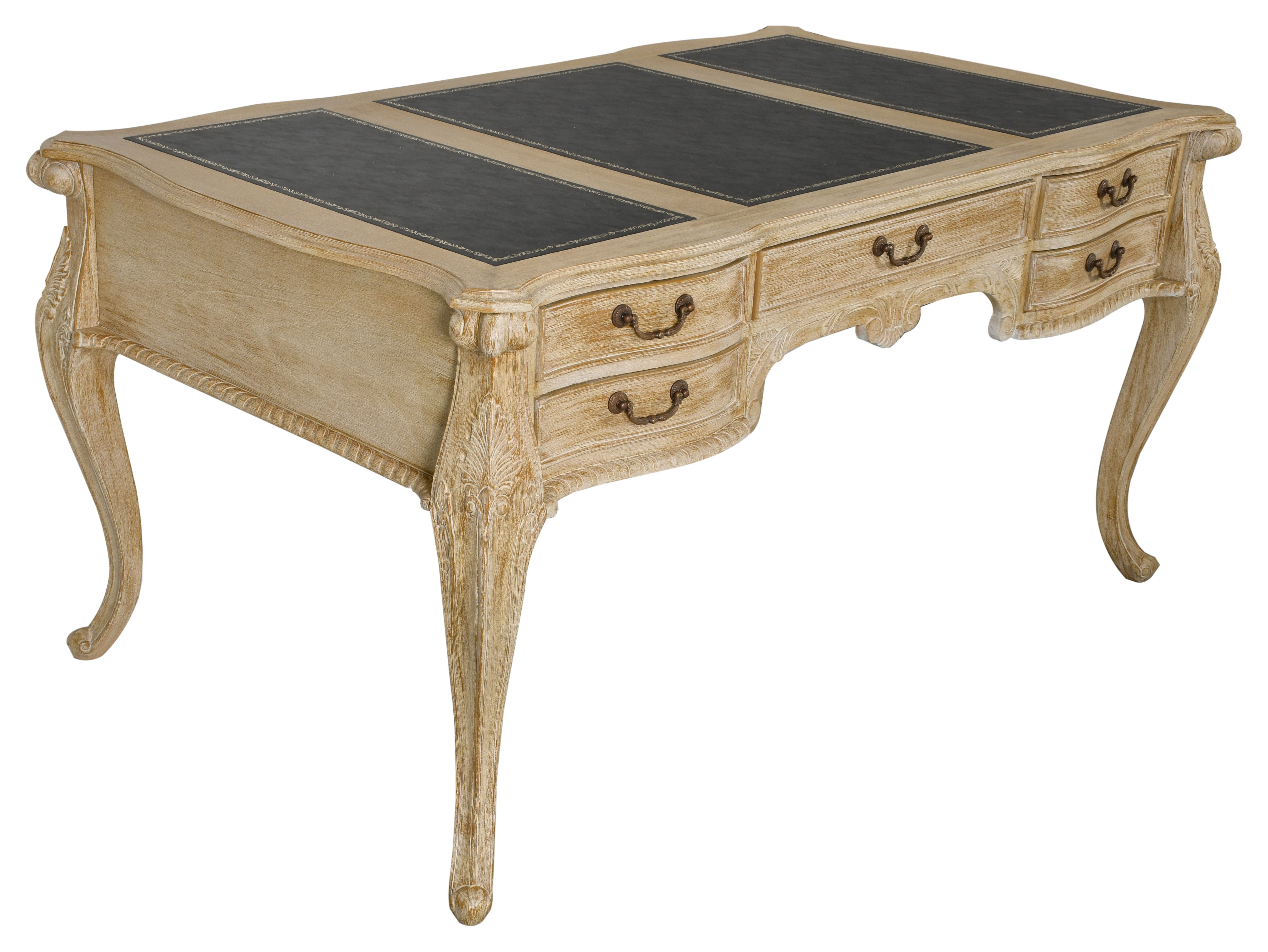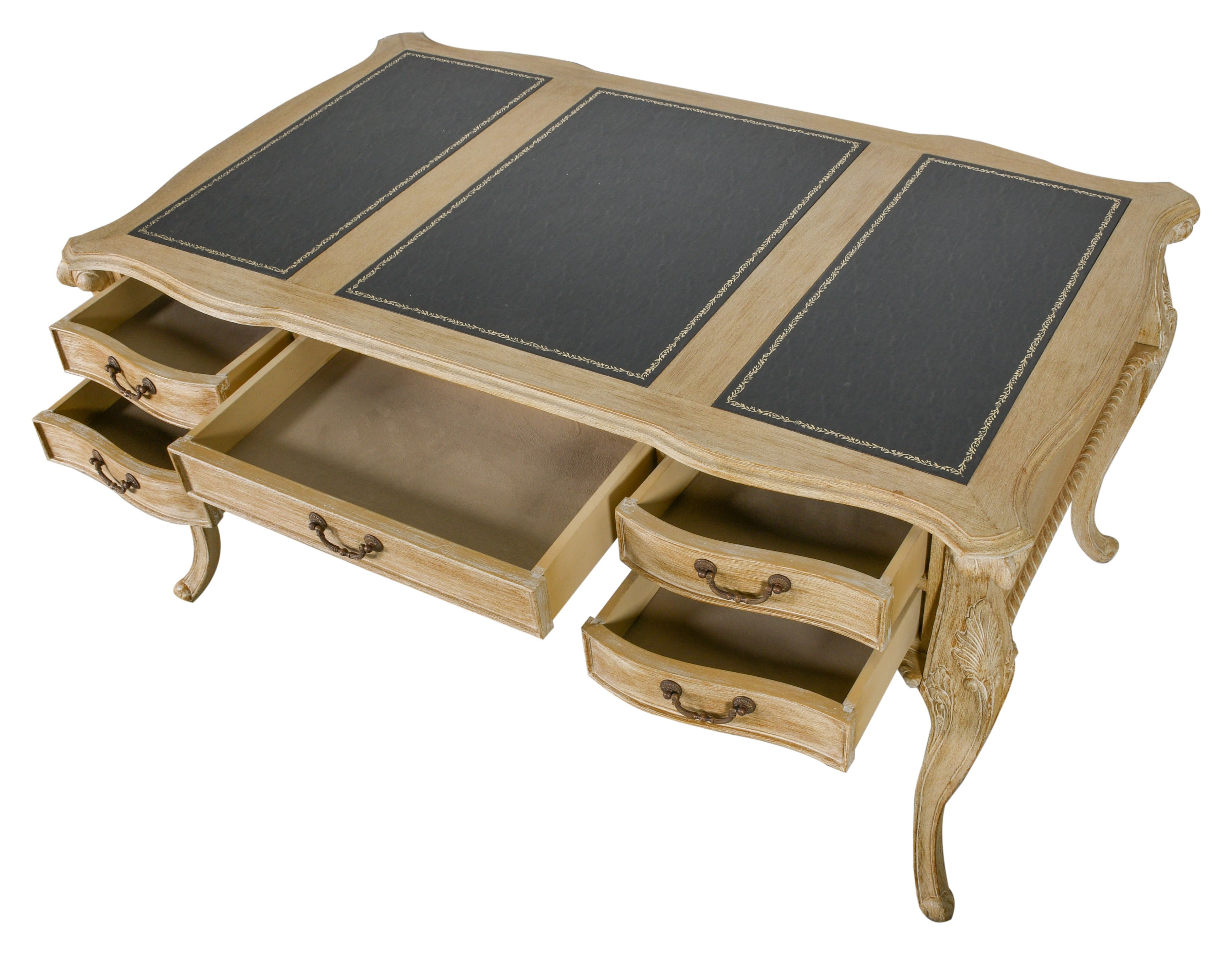 The charm and functionality of the Large Mahogany 5 Drawer Writing Desk from Heritage Furniture is now available in the inviting Beachstone finish. Spanning 63 inches in width, 37.5 inches in depth, and 31.5 inches in height, this desk offers an expansive work area that elegantly fuses practicality with artisanal beauty. Expertly handcrafted and hand-carved from select mahogany, this desk is a testament to the artistry of some of the world's most skilled carvers. Its detailed leaf and rope edge carvings are gracefully highlighted by the Beachstone finish, a process that involves a hand-scraped light wood base and a whitewash finish, emphasizing the natural textures and subtle elegance of the mahogany. The desk features a leather inset top, elegantly tooled, and accented with gold embossing, providing a sophisticated and durable surface for writing or computing. Five generously sized drawers ensure ample organizational space for your essentials, blending functionality seamlessly with the desk's aesthetic appeal. Committed to environmental responsibility, Heritage Furniture sources all wood from replanted forests, ensuring sustainability alongside quality. Each desk undergoes kiln drying and comprehensive stress and pressure testing, ensuring its endurance and stability across diverse environments. The Beachstone finish lends a light and airy feel to the desk, complemented by a hand finishing process that includes glazing, padding, distressing, and other meticulous techniques, resulting in a desk that is not only timeless in style but also rich in character. Minor assembly is required, with straightforward instructions for attaching the legs to the desktop, ensuring a sturdy and reliable workspace. The Large Mahogany 5 Drawer Writing Desk in the Beachstone finish from Heritage Furniture stands as a beacon of fine handmade furniture, promising years of enjoyment and utility in any home office or study, and enhancing your space with its understated yet undeniable elegance.