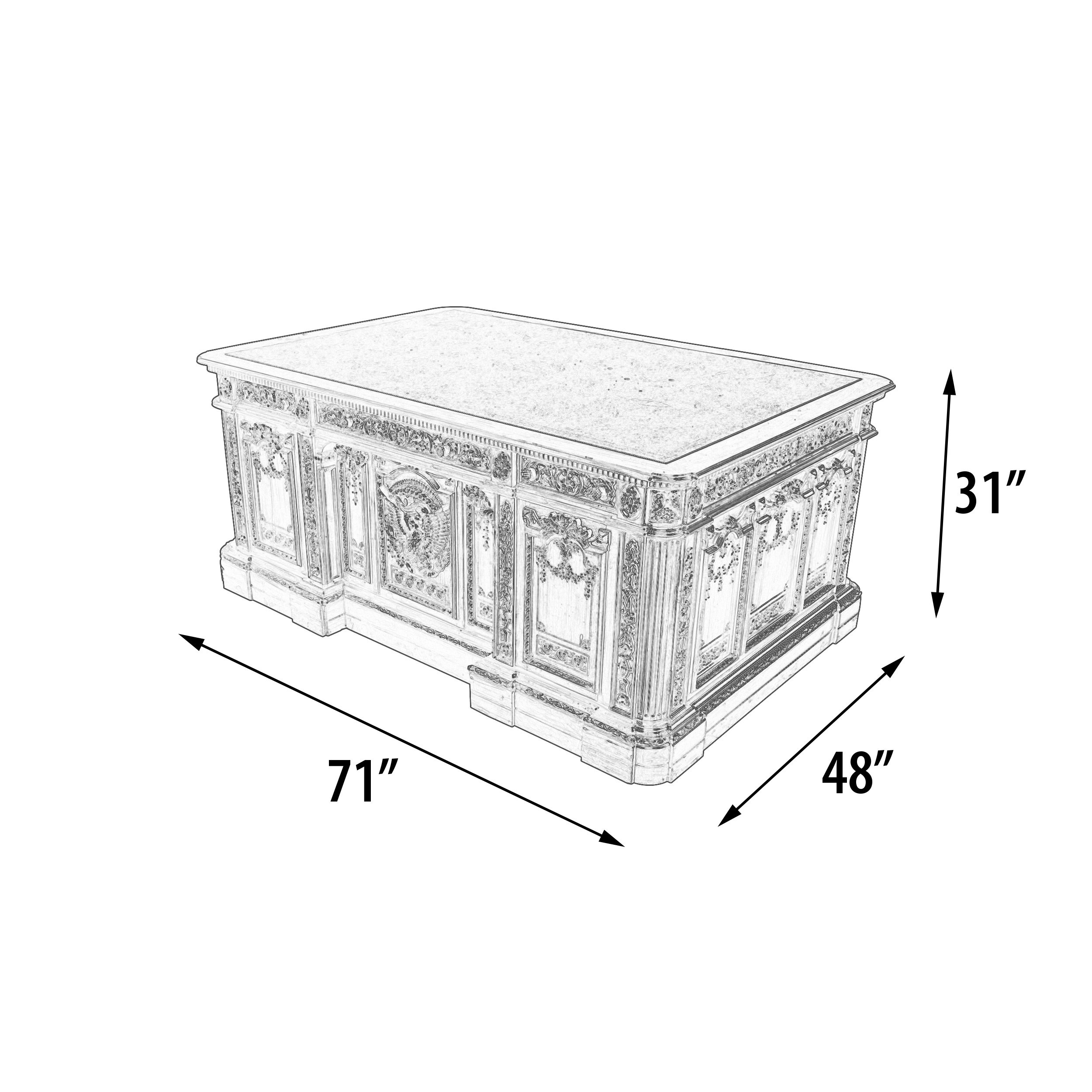 Experience a piece of history in your own workspace with the Resolute Desk replica from Heritage Furniture. This exquisite reproduction pays homage to the renowned desk used by several U.S. Presidents in the Oval Office, including the five most recent. Originally a gift from Queen Victoria to President Rutherford B. Hayes in 1880, the original desk was crafted from the oak timbers of the HMS Resolute, an Arctic exploration vessel. This amazing replica created by Heritage Furniture embodies the same grandeur and significance, meticulously handcrafted to mirror the iconic design and historical essence of the original. With Heritage Furniture's commitment to quality, each desk is constructed with the utmost attention to detail and adherence to the highest standards of craftsmanship, ensuring a piece that is not only a functional workspace but also a striking conversation starter. Featuring all the trademark specifications of the original Resolute desk, including a kneehole panel and a plinth base added over the years, this replica is designed to offer an authentic experience. It is available in various Heritage finishes, allowing you to choose a look that best suits your office or study. In addition to the desk, Heritage Furniture offers a matching Resolute bookcase, hand-carved to complement the desk perfectly, enabling you to establish a complete office setup. Together, these pieces create an environment that is both inspiring and steeped in history. Whether for your home, office, or as a statement piece in a public setting, the Resolute Desk replica and its coordinating bookcase from Heritage Furniture bring a touch of presidential elegance and historical significance to any space, all backed by Heritage's warranty and commitment to quality.