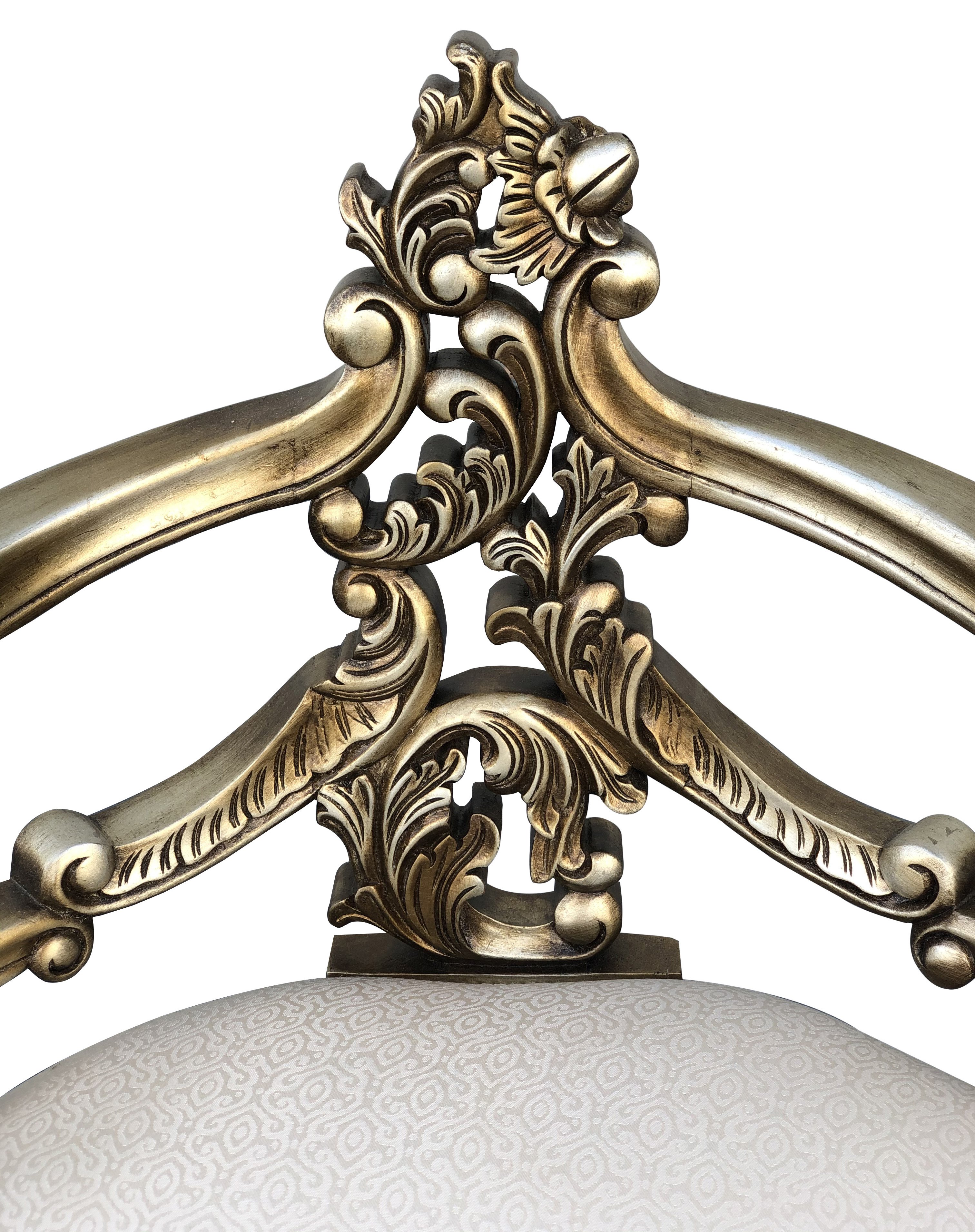 The Platine Venetian Corner Chair is an elegant 28.25 wide x 22.50 deep x 32 inches tall fine hand made mahogany chair. A perfect vanity stool or a corner chair. The smaller scale and corner shape combine with its intricate hand carved details to offer a style befitting the grand dame courts of Venice as well as multiple placements in Todays homes. Hand carved out of solid Mahogany that is then tastefully finished in our Platina finish and upholstered with an imported beautiful Cream Taffeta fabric. Another exclusive design and finish from the Heritage Collection, a division of AFD Home. A collection of fine, hand made furniture in the purest of standards of age old traditional crafting. Each piece is hand carved, one piece at a time, by some of the world's best carvers. The special Mahogany wood comes from replanted forests. The selected wood has been kiln dried. The item in its final form is stress and pressure tested prior to finishing to ensure long lasting stability, in most climates, a Heritage Brand standard. The Platina finish series offers many accompanying items to this settee that can be considered and combined to expand your desired interior. The chair comes fully assembled, a process of finer construction offering a more stable seating. Made by hand and imported from Indonesia.