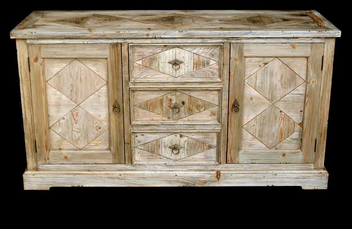 Using the natural beauty of the wood to arrange a parquetry pattern on this farmhouse style sideboard makes for an interesting cabinet made of solid wood and showing a great appreciation for the materials used.