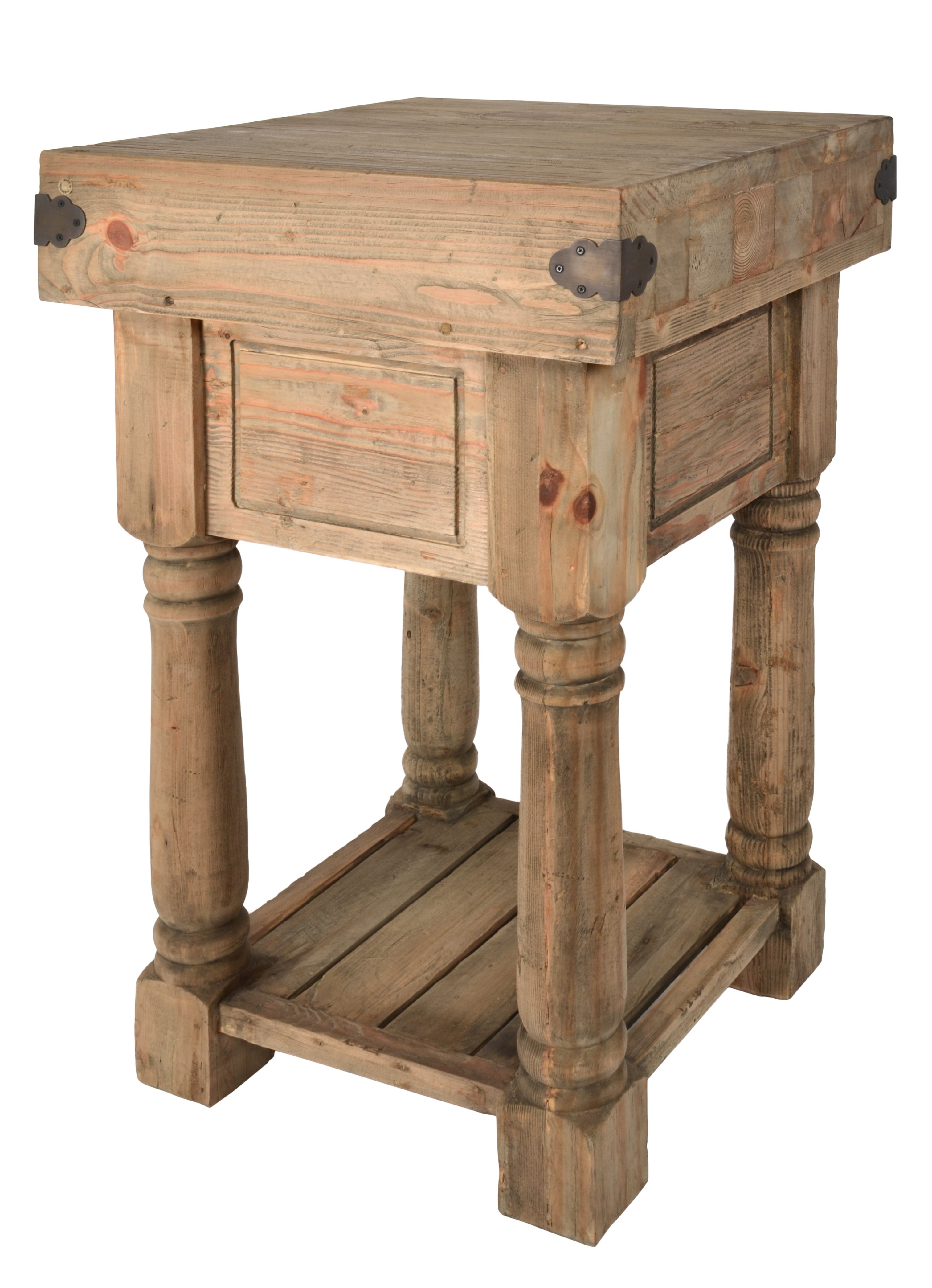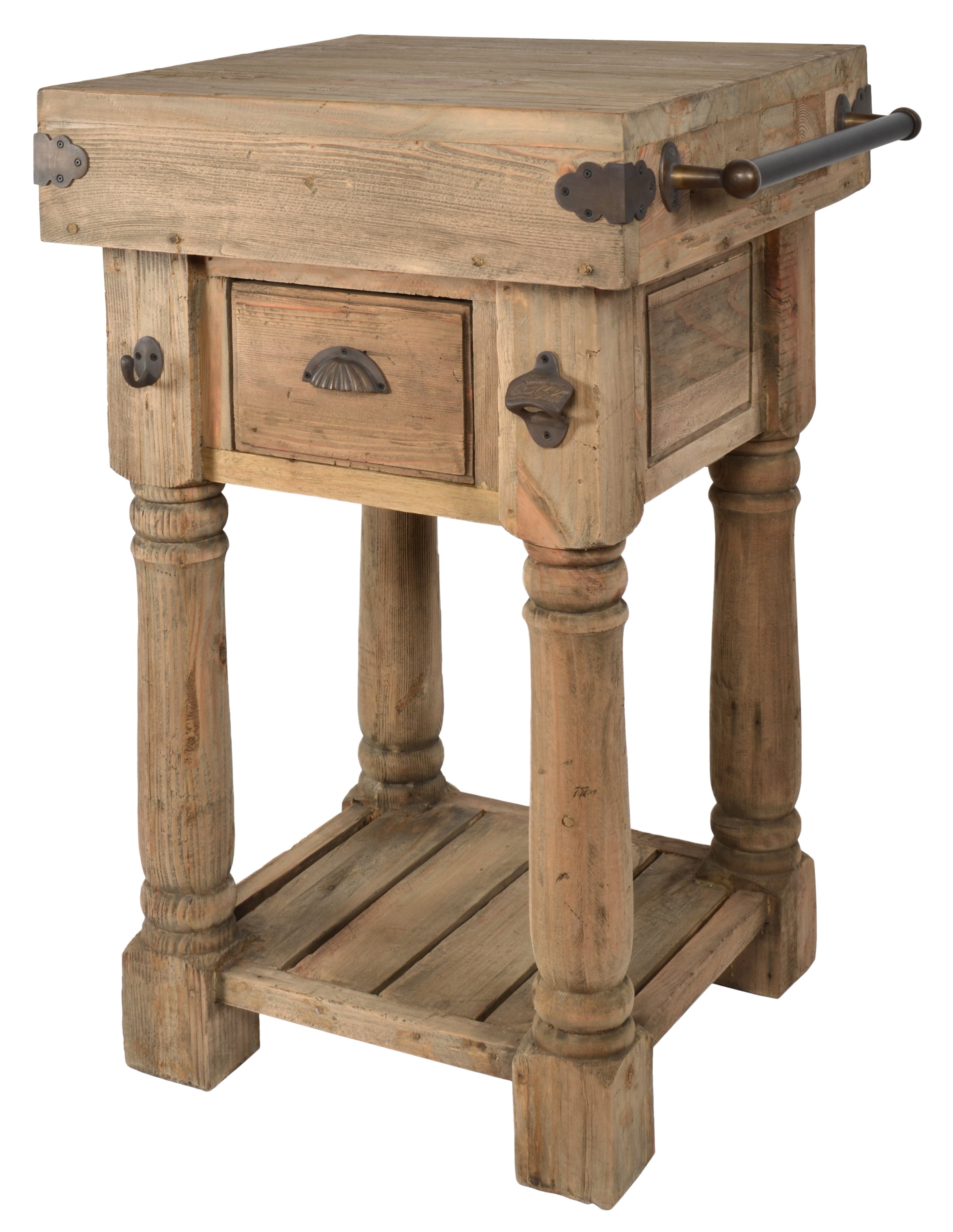 The Coastal Island Table at 22" wide x 22" deep x 36" tall is a very cool unique item in the style of an old butcher block counter. It features a thick wood top with 1 drawer, brass towel rail, antiqued hand hammered hardware, bottle opener and hanging hook atop a slat wood bottom storage shelf. It is a part of a popular new Coastal Series from the Heritage Collection. The Coastal Series is an expanding series that is affordable yet appropriately fashioned for a more relaxed coastal life style. The style of the collection also can fit with farmhouse interiors as well as southern or new England designed more rustic homes. The items are all hand made using solid bleached pine from Indonesia. The table is sold separately and is a unique stand alone addition. Customers liking this design but liking a larger option may consider the Coastal Isle Console. All of the Coastal Series pairs perfectly with each other and can be mixed matched and combined to increase the desired interior design.
