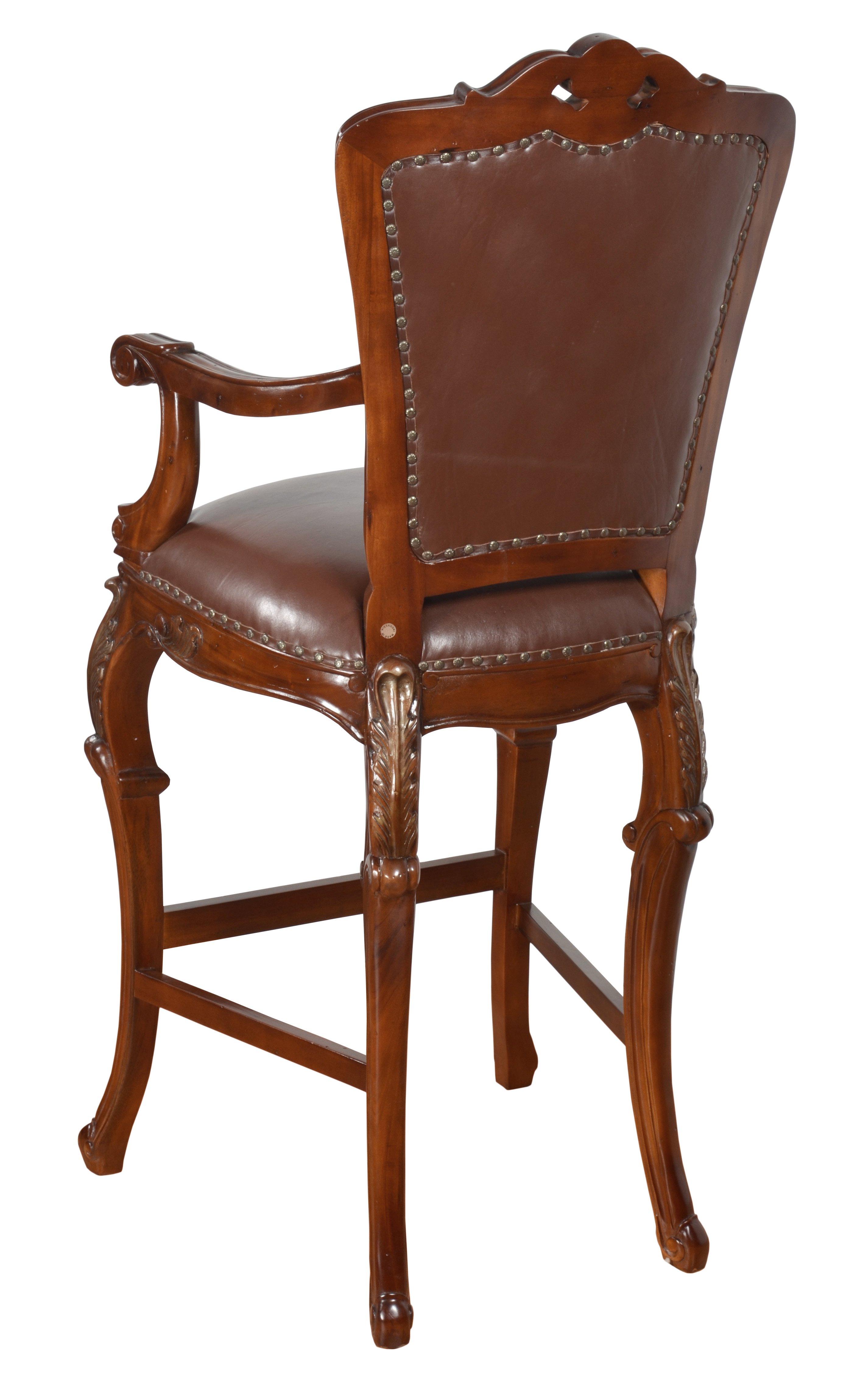 A very well defined and hand carved Fur Leather Barstool-VC from our Heritage Collection. A collection offering turn of the century European styling designed and scaled to showcasing American Standards. This top selling barstool comes fully assembled and as such is very sturdy. It is designed with a natural fur back and a top grain brown leather seat that compliments the elegant Vintage Estate (VC) finish, a rich mahogany finish with a subtle grey wash rub used to accent and enhance the details. The barstools are sold separately. The seat height of these stools make these appropriate for conventional bar counter heights ranging from 42" to 44" The Heritage Collection is a fine hand made furniture collection in the purest of standards of age old traditional crafting. Each piece is hand carved one piece at a time by some of the worlds best carvers. The special Mahogany wood used comes from replanted forests, the selected wood has been kiln dried. The item in its final form is stress and pressure tested prior to finishing to insure long lasting stability in most all climates, a Heritage Brand standard. The final steps of hand making furniture is the application of the hand applied finishes. The specialty finishes used combine hand applied layering, glazing, padding, distressing and crackling techniques and complete the beauty and value of owning timeless Heritage Furniture, a quality that will last for generations of ownership. Made by hand and imported from Indonesia.