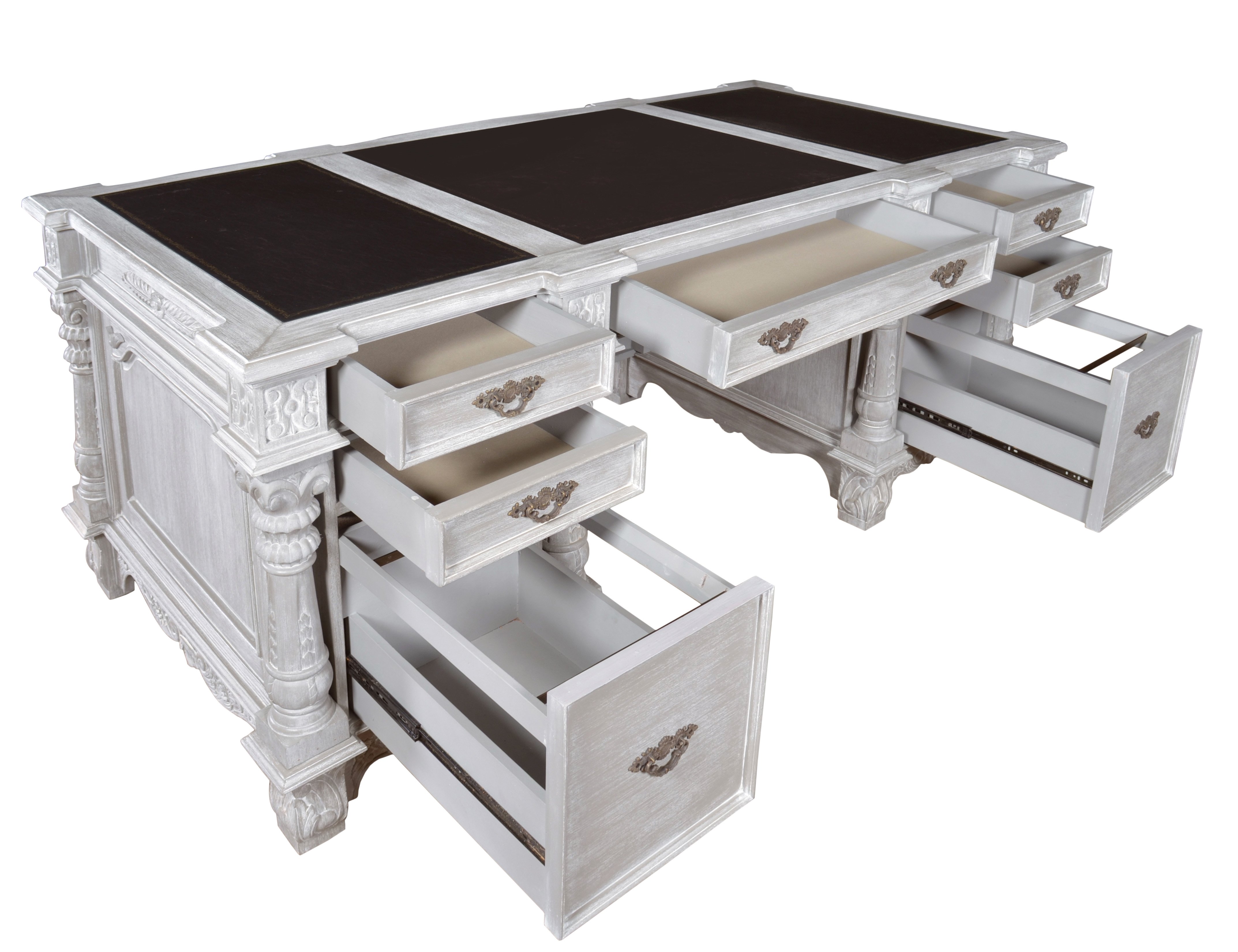 Beautifully hand carved mahogany wood with carved columns, recessed panels, and other carved decorations. Available in several finish options the desk is larger in scale with many fine details. The desk has a three panel leather top that is gold embossed for an elegant finished top. Handcraftsmanship makes each desk a unique piece balancing quality with beauty. Double pedestal bases have each have large file storage drawers as well as 2 additional draw, 3 drawers in each pedestal. With the center drawer, there are 7 drawers to provide ample storage for important documents and other general office items. Finished with a modesty panel connecting the pedestals and top, the desk seamlessly comes together creating a special executive desk solution. The quality of the desk really shows and stands out. Minor assembly required. Each desk ships in 4 pieces, 2 pedestal bases, desktop, and Modesty Panel. Simply set the pedestals, position/align the modesty panel, and set the top. No tools or equipment needed. The desk pieces are designed to interlock supporting one another creating a strong structure. Truly made one piece at a time for many years of useful enjoyment.