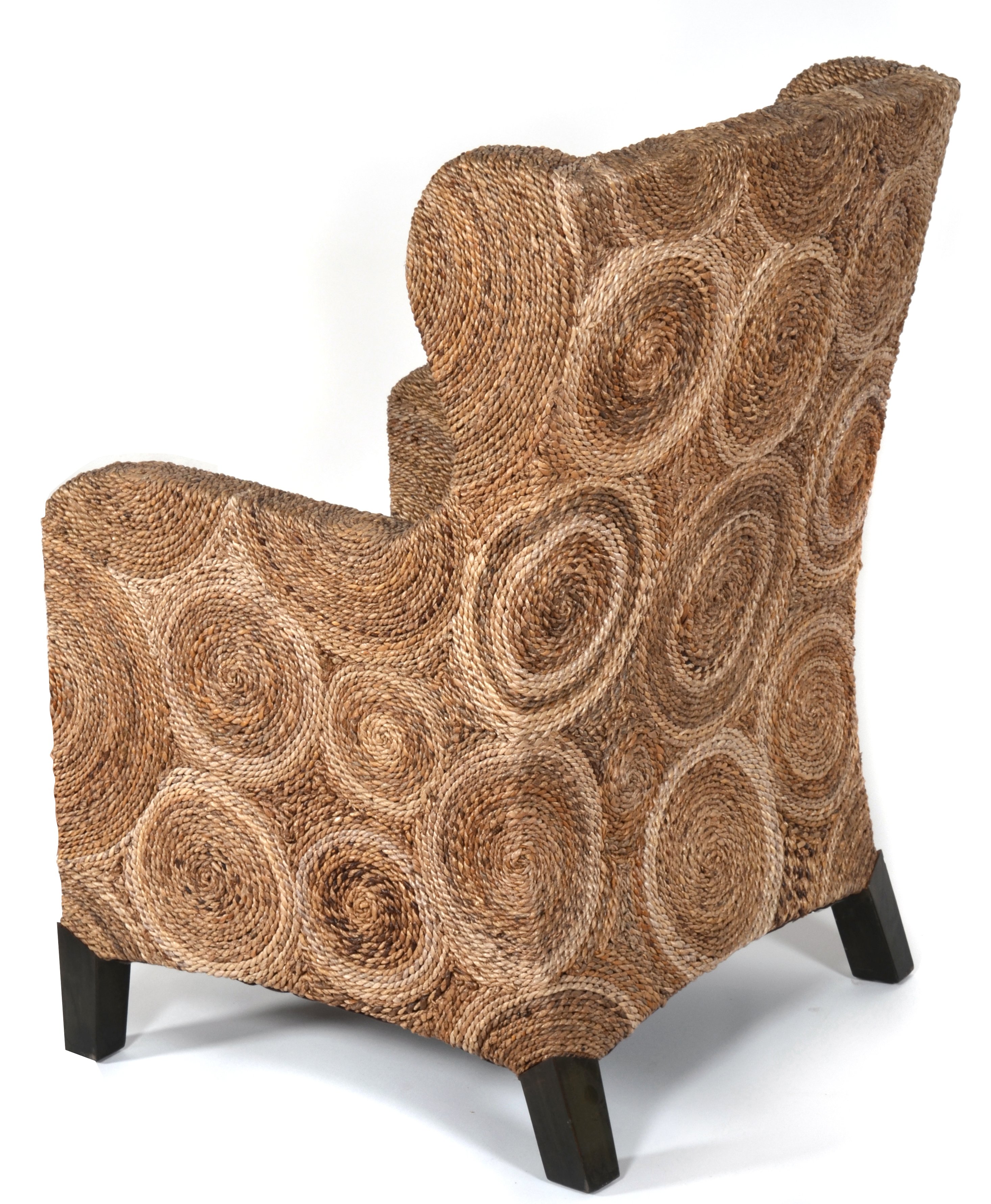 This modern organic Chair offers a contemporary twist when adding organic elements in design. Special attention was paid to making this Chair taller and comfortable. Measuring 29.00 x 33.00 x 42.00 Inches. Sold Separately, This chair is often ordered in pairs for seating balance. Hand Made over solid mahogany framed. Hand Woven by selected weavers capable of executing the design are using the strongest Water Hyacinth Natural Weave. Beautiful natural finish contrasts slightly for affect with the darker brown Chenille fabric used. This chair and design is only for covered spaces and not suitable for exposure to outdoor weather for long periods of time. Minor Assembly of legs may be required. Imported from Indonesia and exclusively manufactured for the AFD Home Collection.