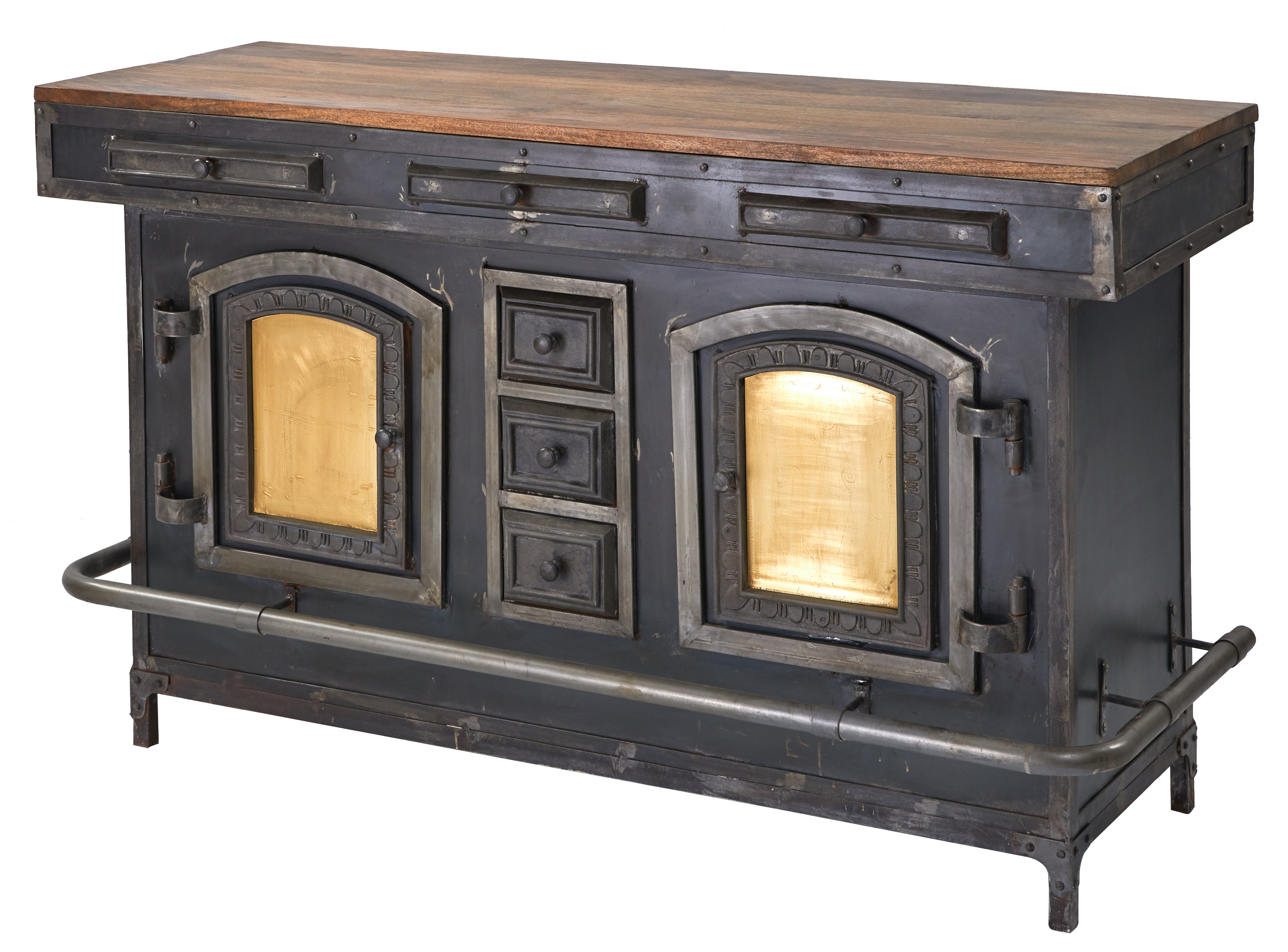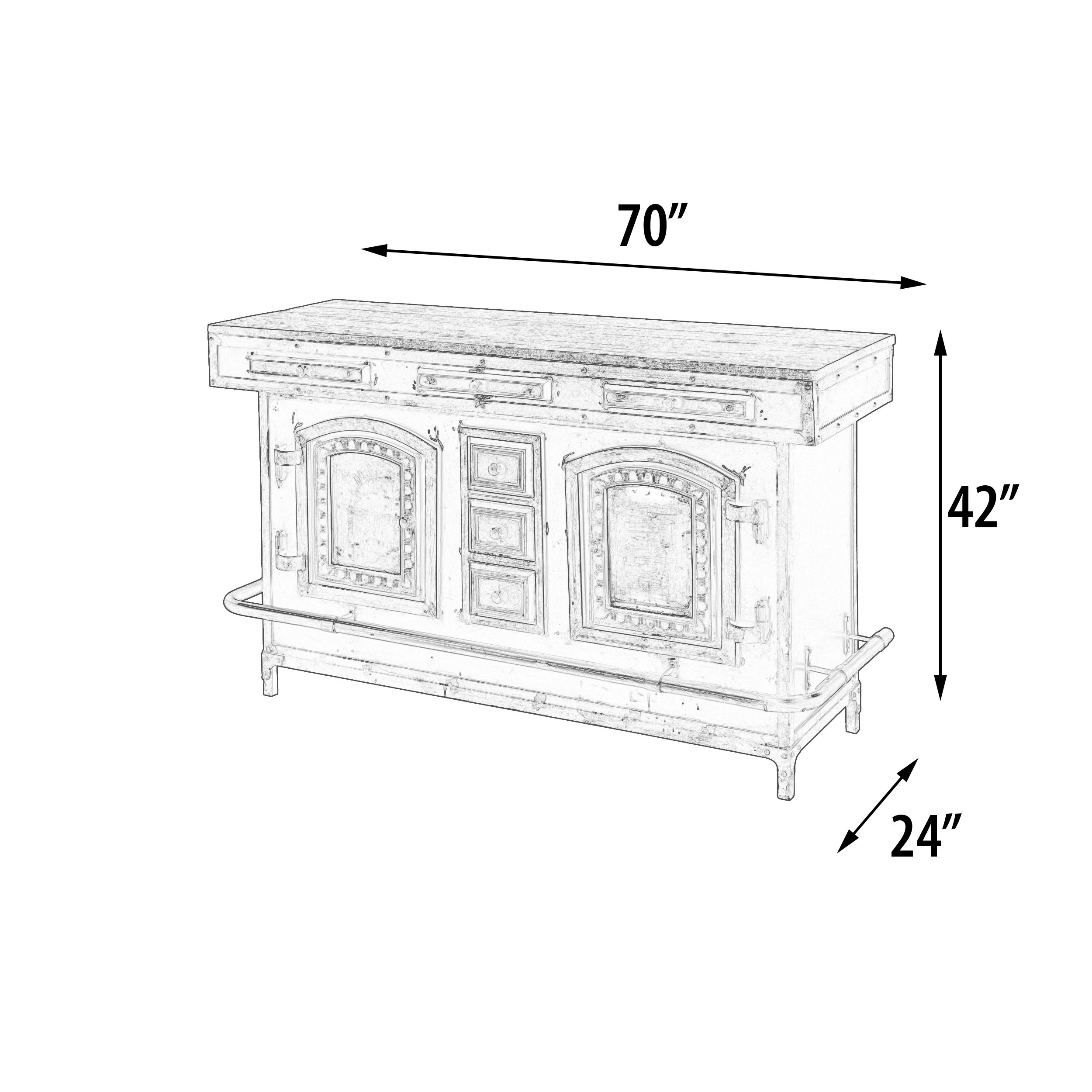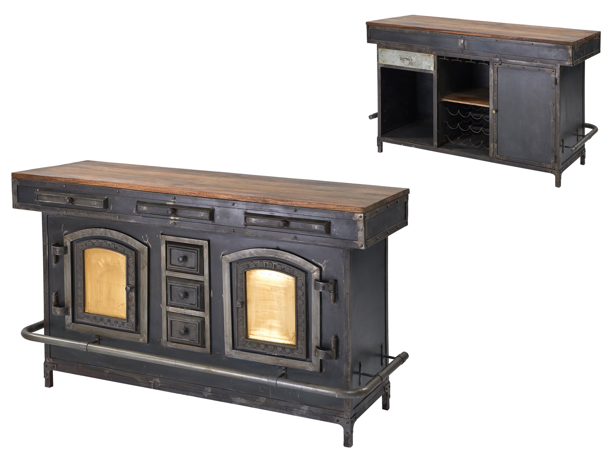 Mountain Blacksmith Cast Iron Industrial Bar 70 Inch. Authentically crafted from Old and Newly Casted Parts from Antique Iron Molds. This Bar Counter is Authentically created from the hands of our skilled Blacksmiths. The Bar was Built for USE! The Cast Doors on the front facade are Ornamental and not functional, the back rear section offers ample function and storage space. Offering concealed and open storage for bottles, glasses and assorted bar stuff. Hand Made and Imported from India. India is known for the skills of their metal crafting. Constructed of Steel, iron, galvanized metal with a top surface of wood. Like these unique type hand made items from the Mountain Blacksmith Collection of AFD Home then check out all the cool options for your fun room or business. No Assembly Required, Enjoy!