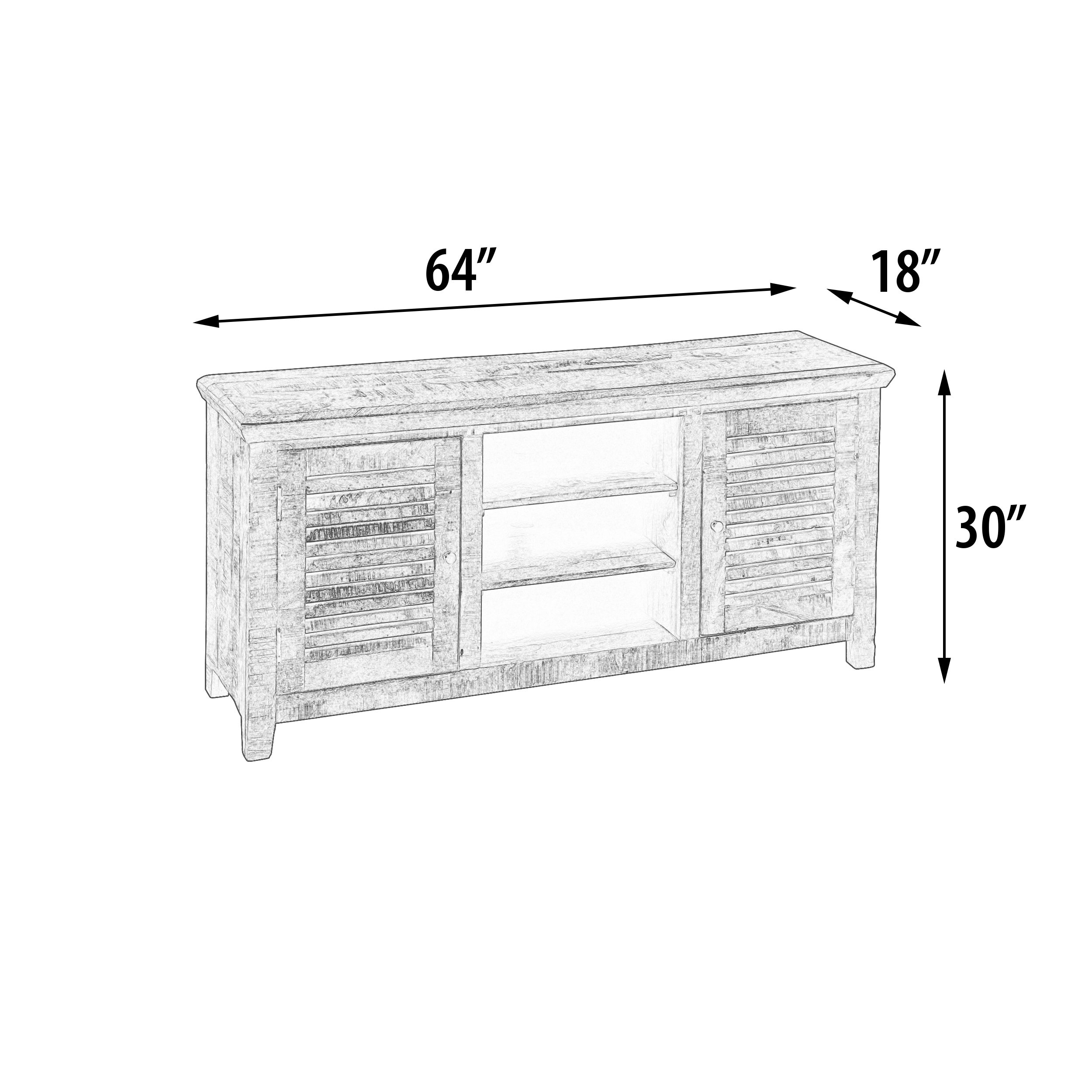 Mountain Studio Design presents their beautiful solid wood Rustic Entertainment TV Console Unit is 64 Inches Wide by 30 Inches Tall. This Entertainment TV Console is constructed, using a combination of Old and New reclaimed timber of mango hard wood. The finish is an authentic aged and weathered affect done by the skilled artists at Mountain Studio. Additional Features include louver style shutter slat doors, removable center shelves for concealed storage and antique brass finished knobs. Consider combining this with other Rustic, farmhouse, lodge and Cabin designs from Upholstery to Complete Rooms and lots of functional Items. Hand Made in India for AFD Home. No Assembly Required!