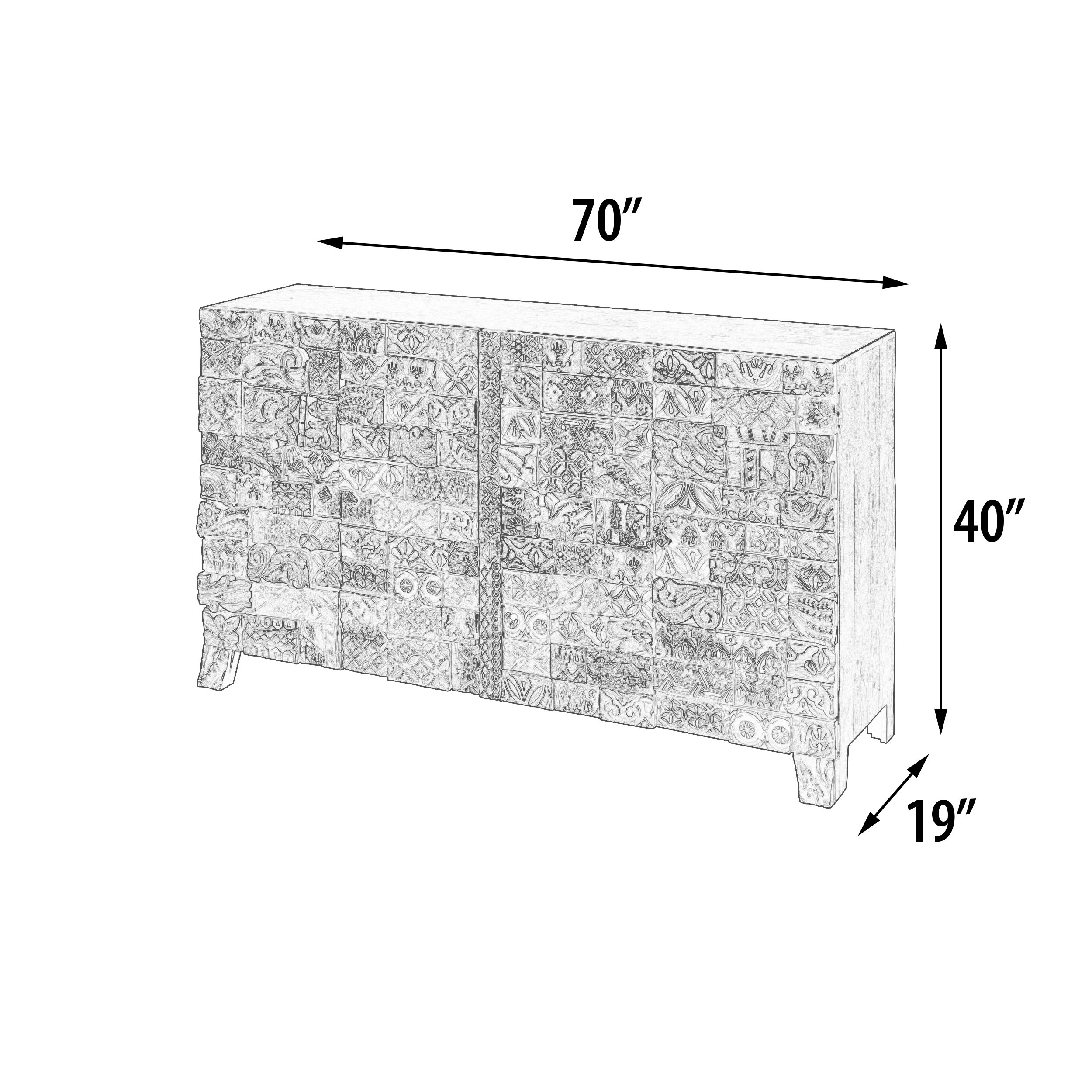 The Timelessly Accented 4 Door Authentic Print Block Credenza Cabinet 70 Inch is an exciting Creation. Constructed, using a combination of Old and Newly Carved Pattern Print Blocks. The doors are made from original decorative elements, that are collected from abandoned printing factories of fabrics and wallpapers. Larger scale entry style cabinet s of this size are also Today's popular size and shape for use as a stylish TV, Entertainment cabinet. The Cabinet is Constructed of solid Mango Hardwoods using tongue and groove joint methods. Rich Walnut stain finishing of the wood, offers contrast and overall beautiful affect. The large 4 doors all open to ample storage and shelving. Hand Made and Hand Finished in India for AFD Home. Arrives Fully Assembled, Enjoy!