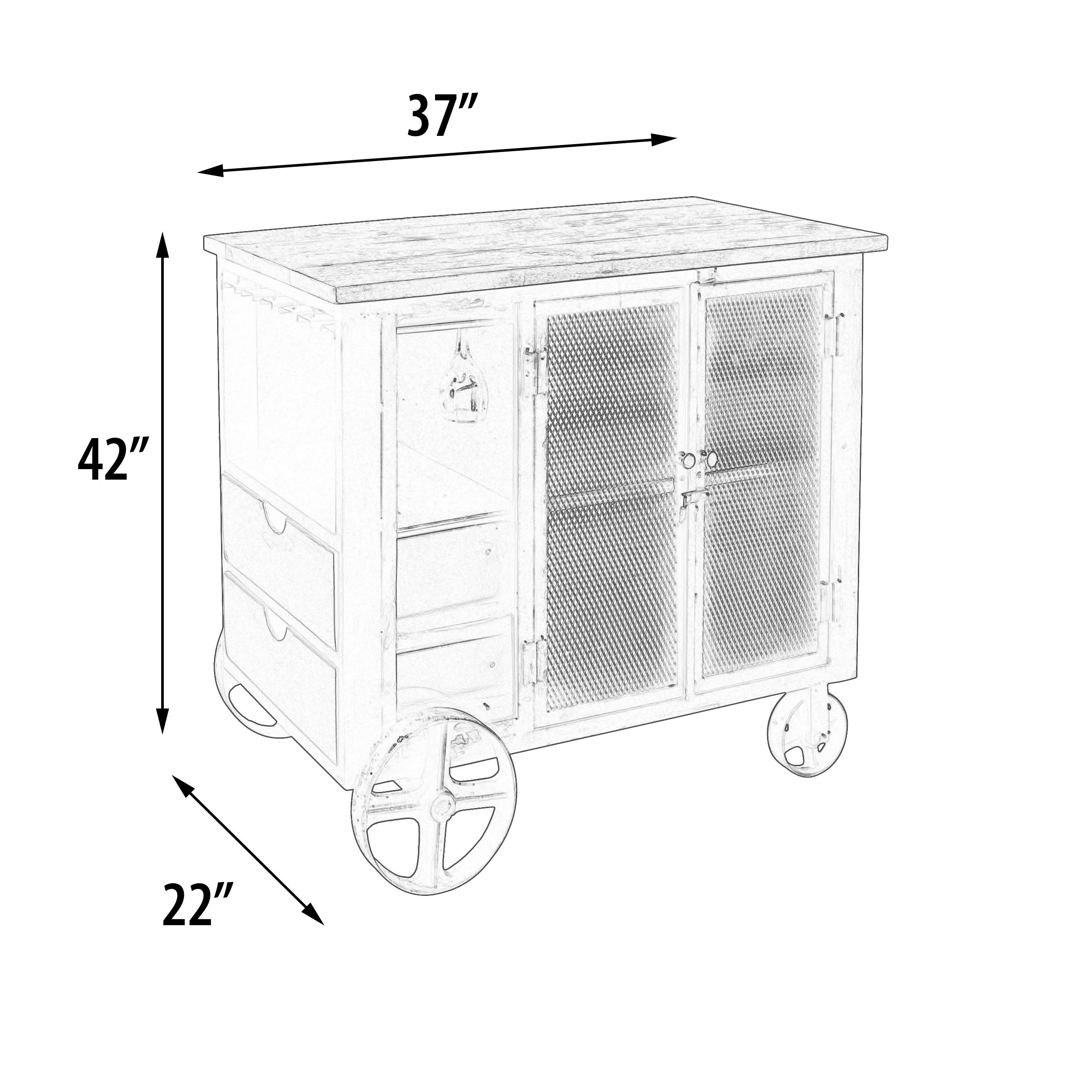 Mountain Blacksmith Island Bar Cabinet on Wheels 42 Inch. Authentically Hand Crafted from our skilled Blacksmiths. The Bar has many popular uses; such as an Kitchen island, Console, Counter or Wine Bar. Versatility is also provided with it being mounted on Wheels. The style is perfect for designing Farmhouse, Urban, Industrial and/or Rustic Interiors. The Doors open for storage for bottles, glasses and assorted bar stuff. Hand Made and Imported from India. India is known for the skills of their metal crafting. Constructed of Steel, iron, galvanized metal with a top surface of wood. Like these unique type hand made items from the Mountain Blacksmith Collection of AFD Home then check out all the cool options for your fun room or business. No Assembly Required, Enjoy!