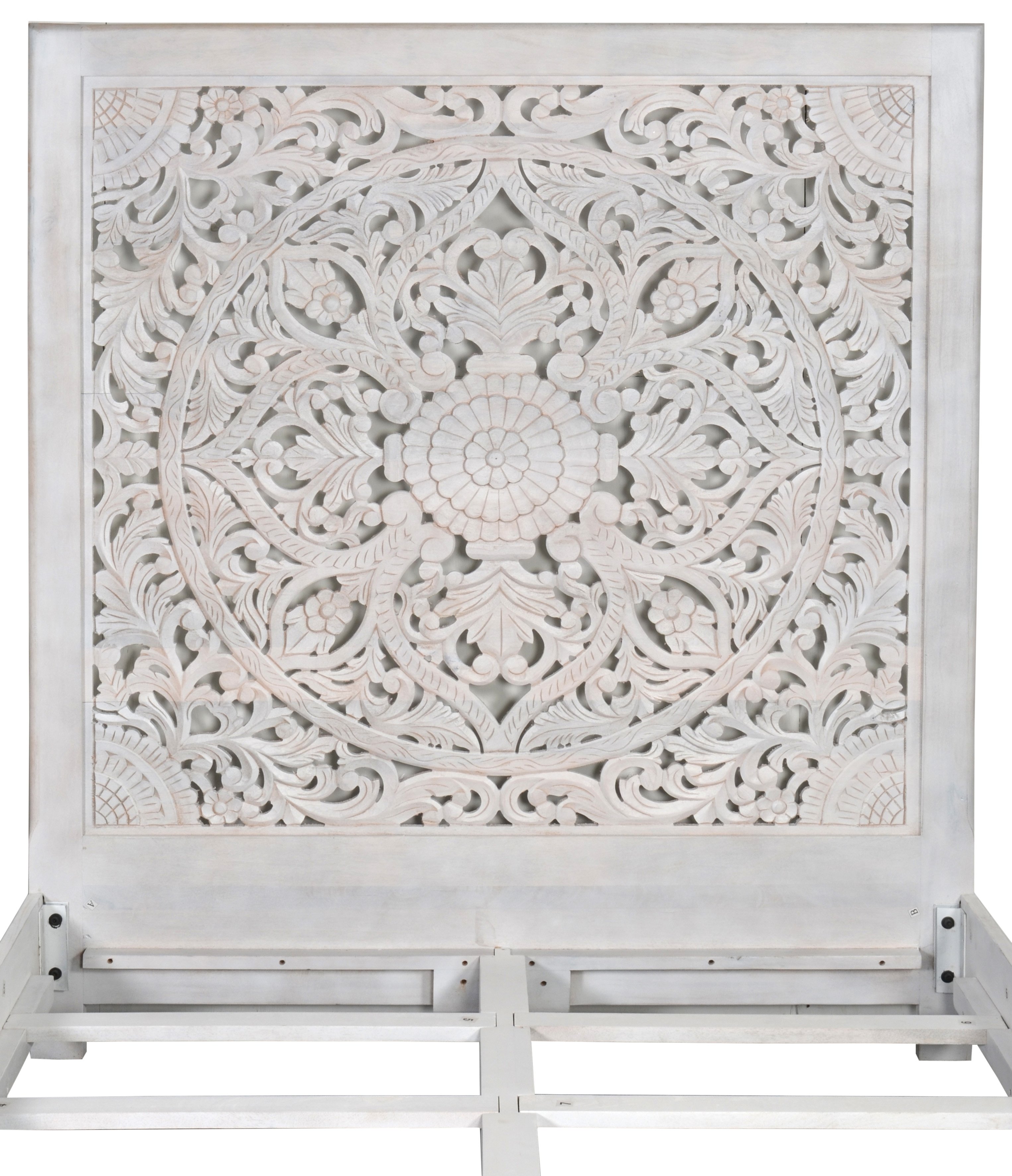 An Exciting Find for our clients looking for a very Special Bed A design that provides a perfect start for You to Personalize Your Room and Create your vision of the perfect Bedroom. The Bed is a good start featuring an elegant and unique Headboard with Fully Carved Lace Design. The Bed design is easily placeable, offering a Casual transitional styling that is also a perfect match for Coastal or Farmhouse trends. It is hand made in solid wood. The finishing is a painted white wash offering a light and bright Palette. Bed offered is King Size. Also available in Queen size, matching side cabinets, dressers are also available to complete the Room. Hand Made in India for AFD Home. The Bed comes complete with headboard, footboard, side rails and slats. Assembly Required