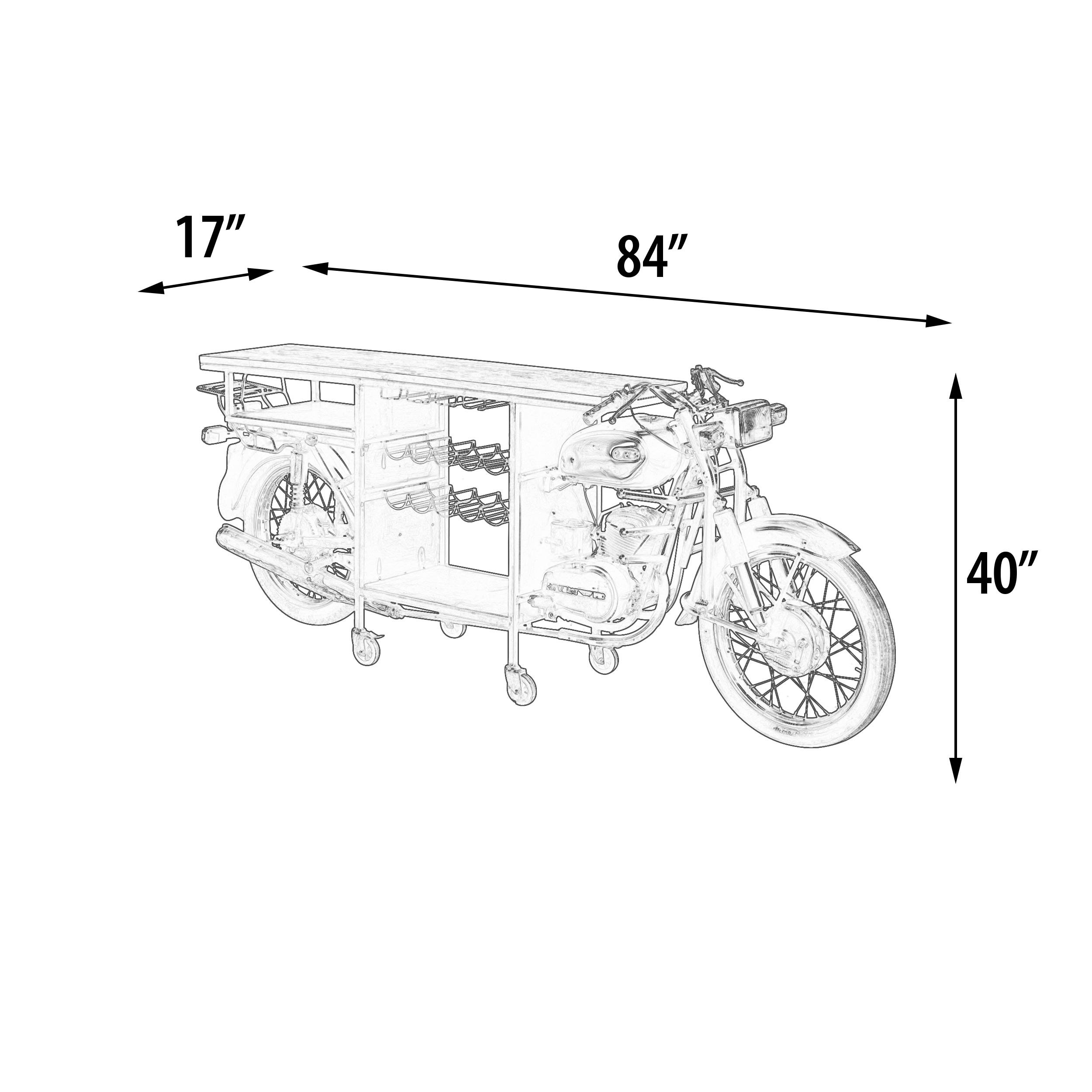 Introducing the Authentic Motorcycle Bar Counter, a remarkable one-of-a-kind discovery for vintage motorcycle enthusiasts and those seeking distinctive interior design pieces. This authentic vintage motorcycle has been artfully repurposed into a wine bar and counter, creating a functional yet captivating conversation starter. Measuring an impressive 80 inches, the bar stands securely on a robust iron stand. Crafted by skilled blacksmiths, each piece is authentically hand-created using old, repurposed motorcycles, each with a unique history. Constructed from a combination of steel, iron, rubber, and hardwood, this motorcycle bar counter seamlessly complements a range of interior styles. Whether you are a motorcycle enthusiast or someone who appreciates the creativity of repurposed items, the Motorcycle Bar is a standout addition to your space. Revel in the uniqueness of this original décor piece and let it become a focal point in your home or commercial setting. No assembly required – simply savor the ride!