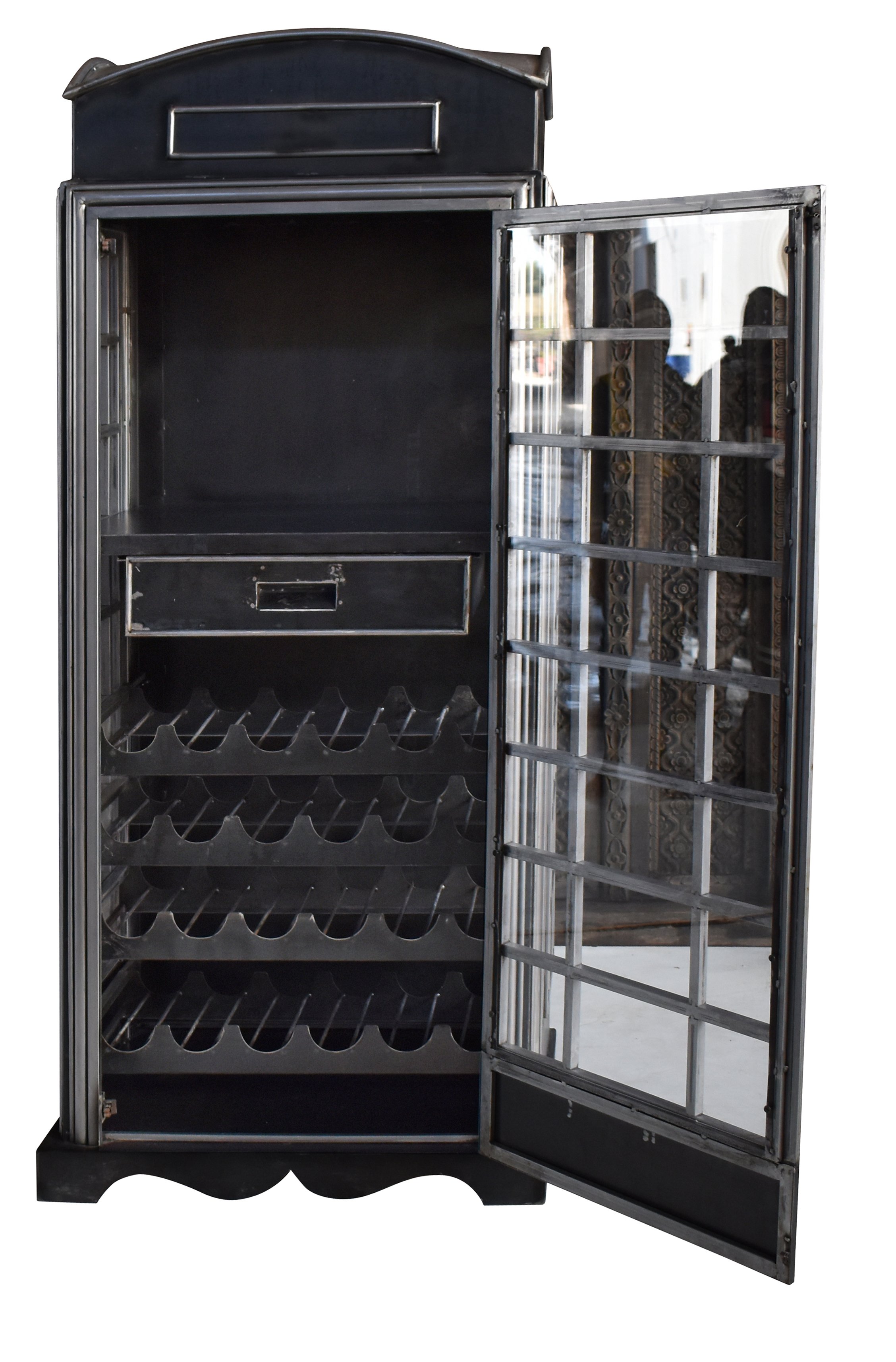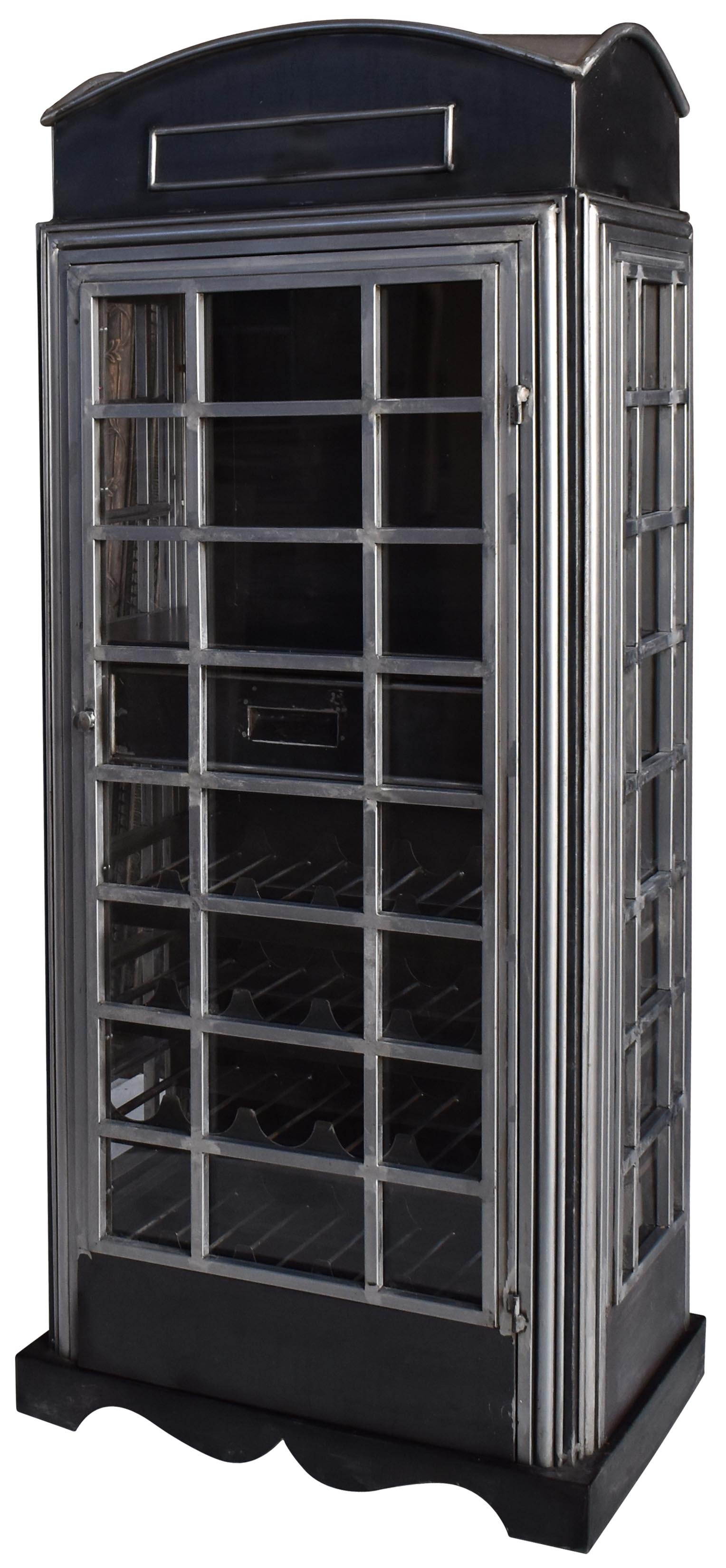 Mountain Blacksmith English Style Metal Telephone Booth Bar Cabinet 77 Inches Tall. An all metal recreated English style Call Box. Opens to a full sized bar cabinet with custom fitted interior, stores 24 bottles, stem ware hangers, shelves and a drawer are included. This Industrial Iron cabinet is finished in an appropriate graphite Steel Metal Finishing. Plexiglass was used for the glass doors and sides to insure safe shipping and safer usage. Hand Made by skilled Blacksmiths and Imported from India. Like these unique type hand made items from the Mountain Blacksmith Collection of AFD Home then check out all the cool options for your fun room or business. No Assembly Required, Enjoy!