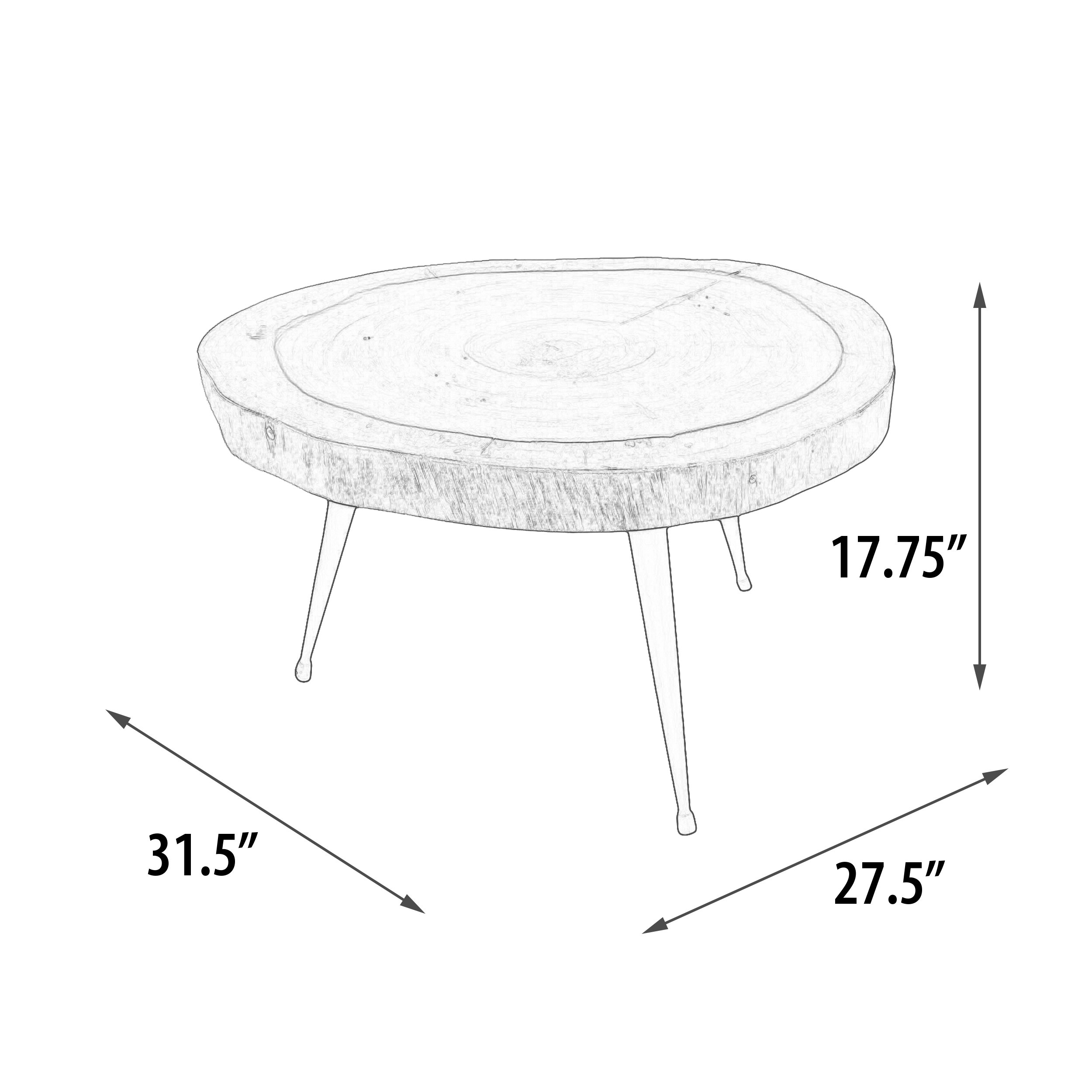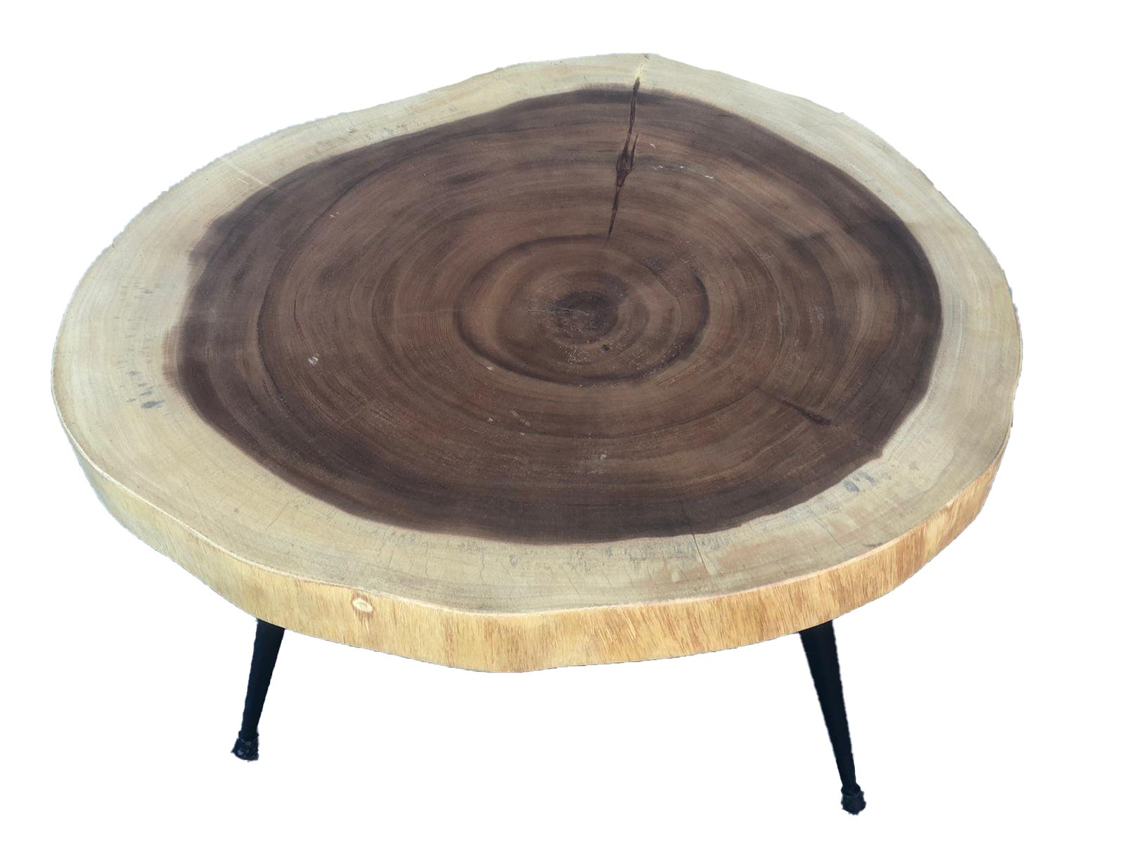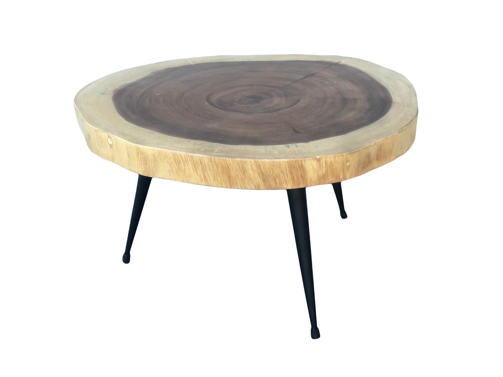 A natural Slab of Suar wood suspended with 3 modern iron legs a perfect height for a Cocktail Table or Occasional Table. The sizes and shape will vary slightly but we select specimens that fall within the 27' to 31.50" width and depth. Suar Is A beautiful Natural Wood And each specimen will vary Slightly In Grain, Texture And Finish Color. A Natural Hand Product Of This Type will come with all the Natural Inclusions Which Makes The table Beautiful. Suar Wood Aka Monkey Pod Wood Is Strong, Very Durable, And The Color And Grain Of The Wood Is Pleasing As You Will See Tones From Light Yellow Sapwood To Rich Dark Chocolate-Brown Tones Of The Heartwood. The Rich Color And Beautiful Grains Of The Heartwood, Resemble Black Walnut. Suar Wood Only Requires Basic Maintenance Such As Soap and Water To Maintain. For Environmental Concerns Suar Is Not On Any Endangered species List And It Is Eco-Friendly. The Suar Tree Is Aptly Nicknamed Monkey Pod Wood For Its Beautiful Crowning Arbor Sometimes Reaching Heights Of Up To 80' Tall And As Such A Favorite Yet Bountiful Play Tree For These Local Residents. Enjoy!