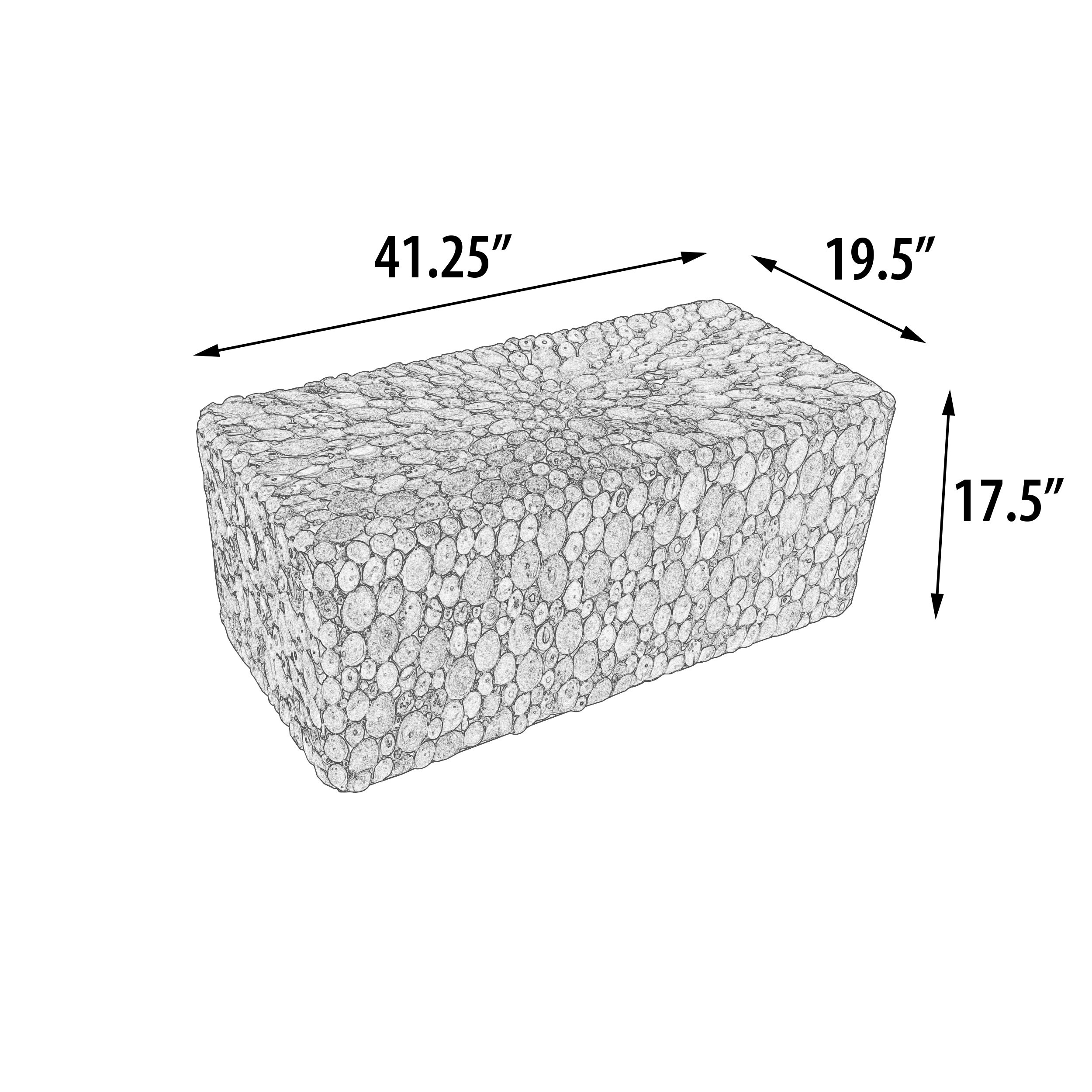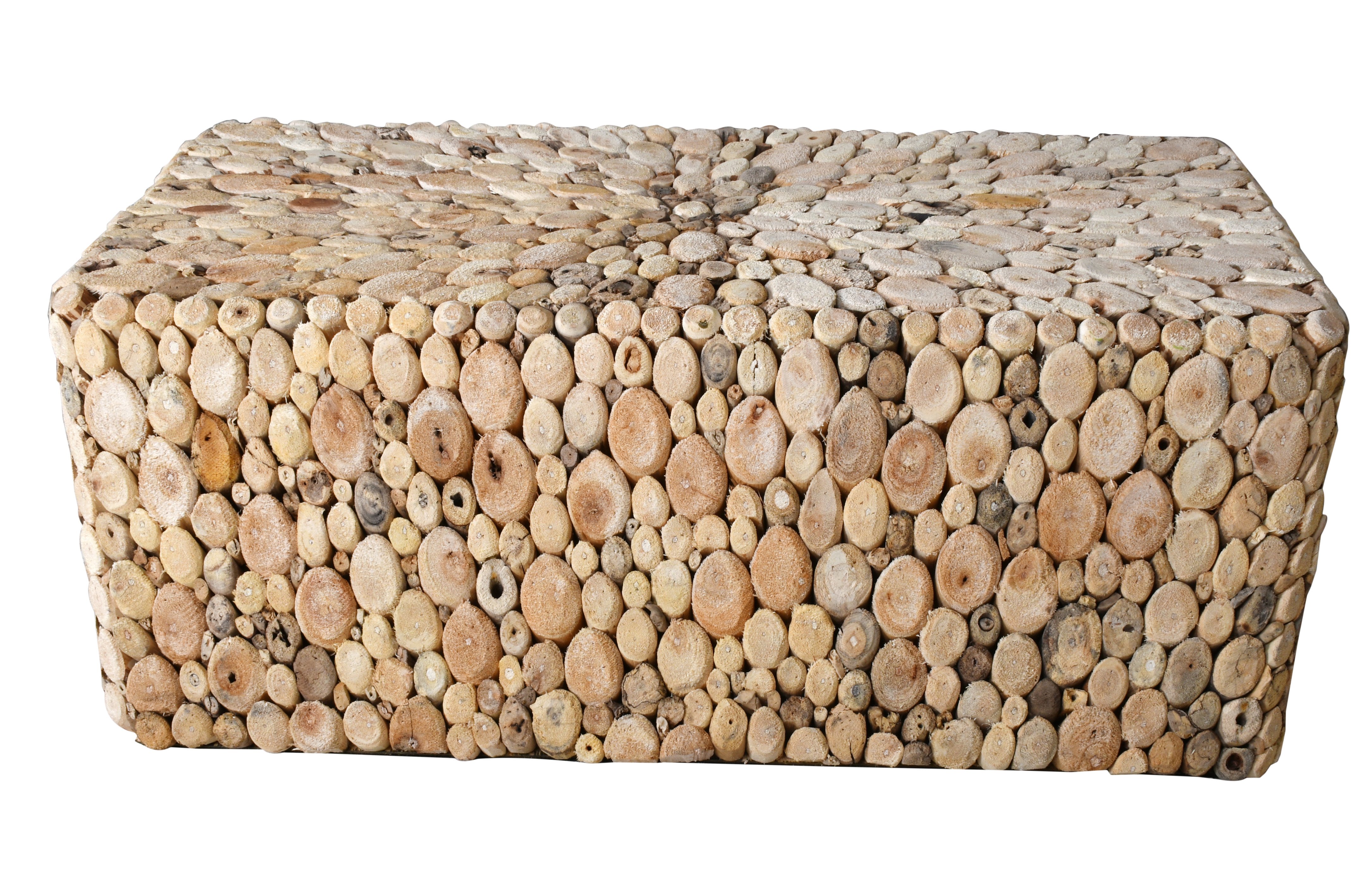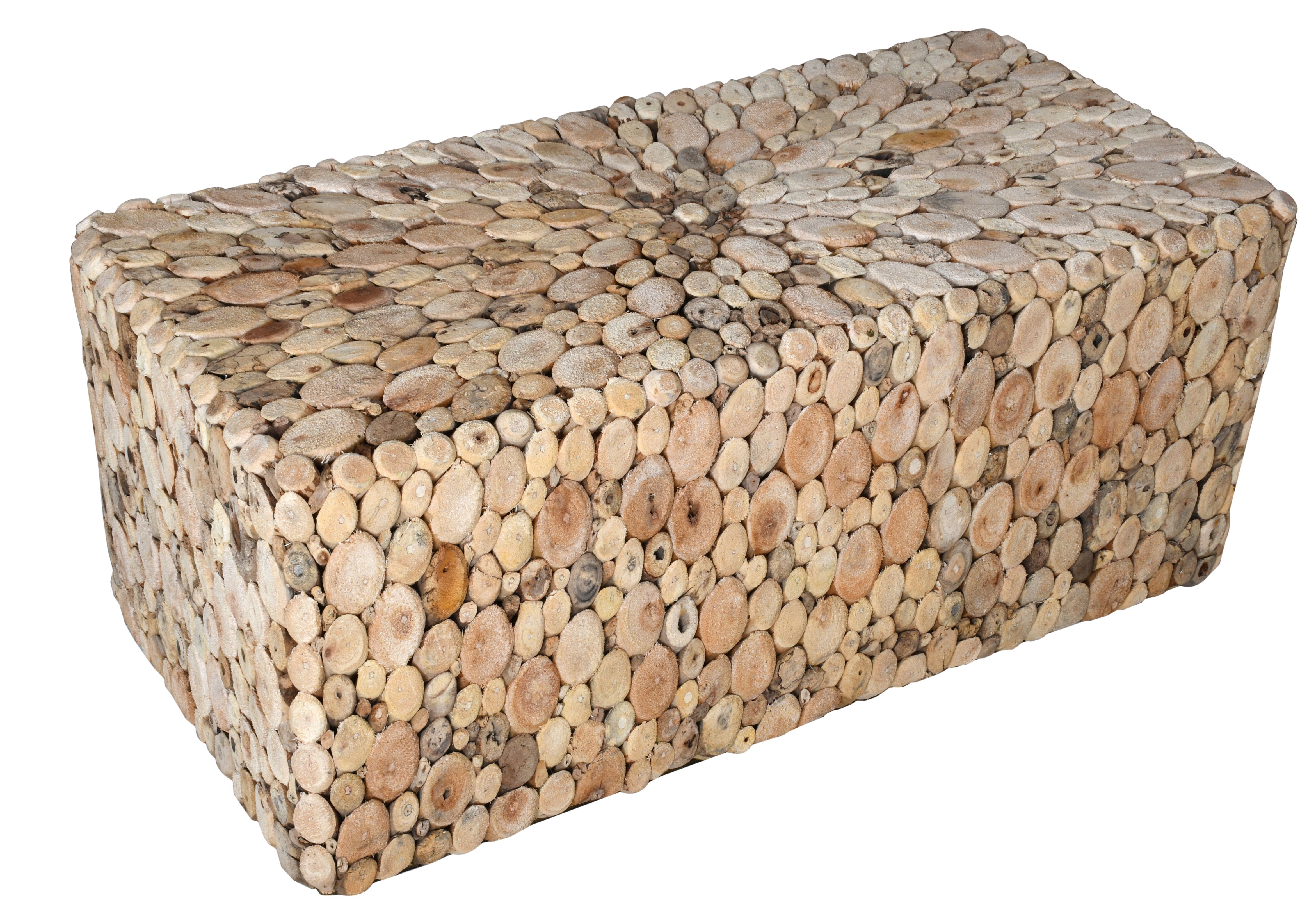 A natural Oyster Cross Cut Random Wood Solid Bench Table 41" Wide 17.5" tall. It was sized appropriately for a 2 seater bench ottoman or as a Cocktail Coffee Table with it 17.5" height. Oyster Cross Cutting is wood workers technique of diagonally cutting the random sized wood branches creating a pretty oyster shaped natural end cut that adds to the uniqueness of the Bench Table design. The item is structurally sound with interior wood framing enabling it to sit up to 300 lbs. Manufactured in random wood species native to the country of origin Indonesia. No assembly required.