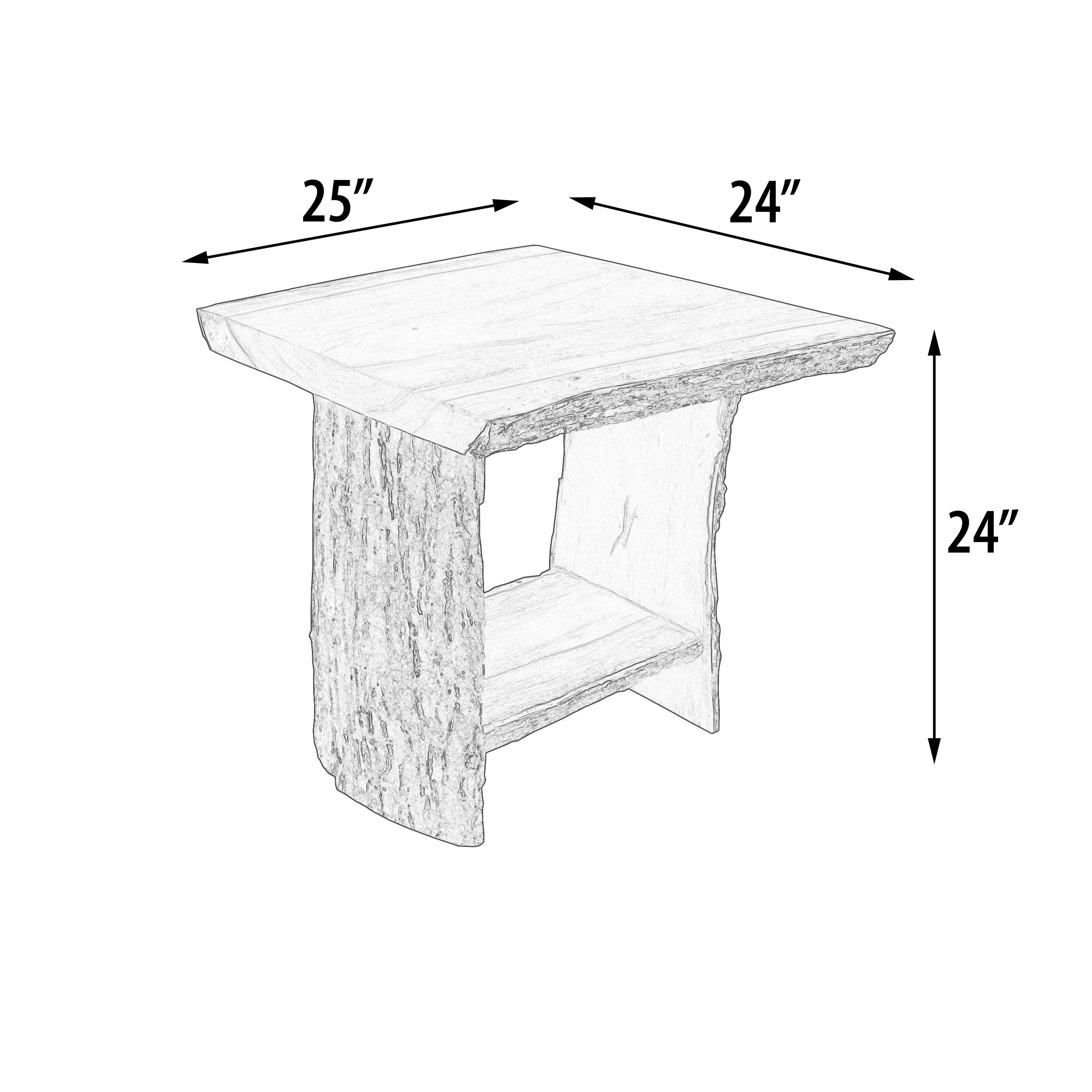 One of the newest additions to the Authentic Timberline Solid Natural Wood Collection. This natural side or occasional Table measures 24.00 x 25.00 x 24.00 Inches. The purity of the rustic design is a great find for your special retreat! Beautiful Suar specimens of wood with live edges and with original bark are collected and maintained though production, creating a very natural Rustic Furniture. Suar wood is used for this collection by Mountain Studio Designs, it is often referred to as Oriental Walnut for its contrast between the darker heart of the center wood and lighter outer bands is a plentiful species. Also referred to as Monkey trees these big creations of nature grow tall and have large canopies that the local inhabitants love to hang around under. Consider adding other matching items from this popular Timberline Solid Natural Wood Collection, Entertainment Stand, cocktail table or side tables are now being offered to help expand this natural collection for our purest customers looking for the best in natural decor! Hand Made and Imported from Indonesia!