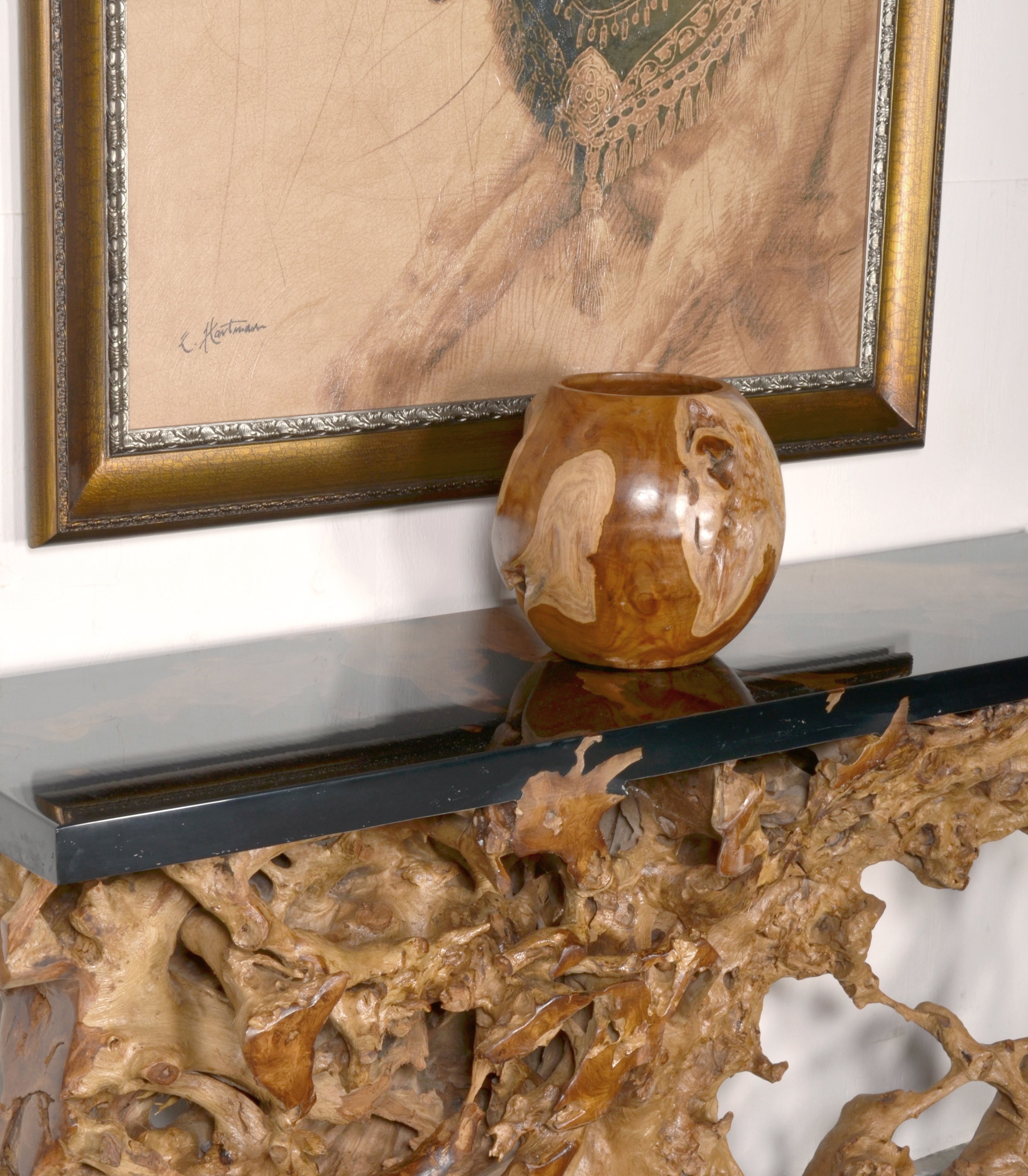 A natural large Teak Vase 11.00 x 11.00 x 11.00 Tall. Our Local Craftspeople search vast forests for these perfect Teak specimens. This Modern Organic style offers a purity of nature, in a pleasing and functional form. The vase is decorative on it's own and can hold flowers, if you choose. Once found they are prepared, sanded and polished. The clear natural finish they apply enhances the final affect of the beautiful wood. As With All Natural Exotic Wood Products There Will Be Some Slight Variation In Color, Texture And Finish Color. Imported from Indonesia by AFD Home. Sold separately often ordered in pairs for Balance. Also consider combining with other modern rustic items from Mountain Studio Design. No Assembly Required.