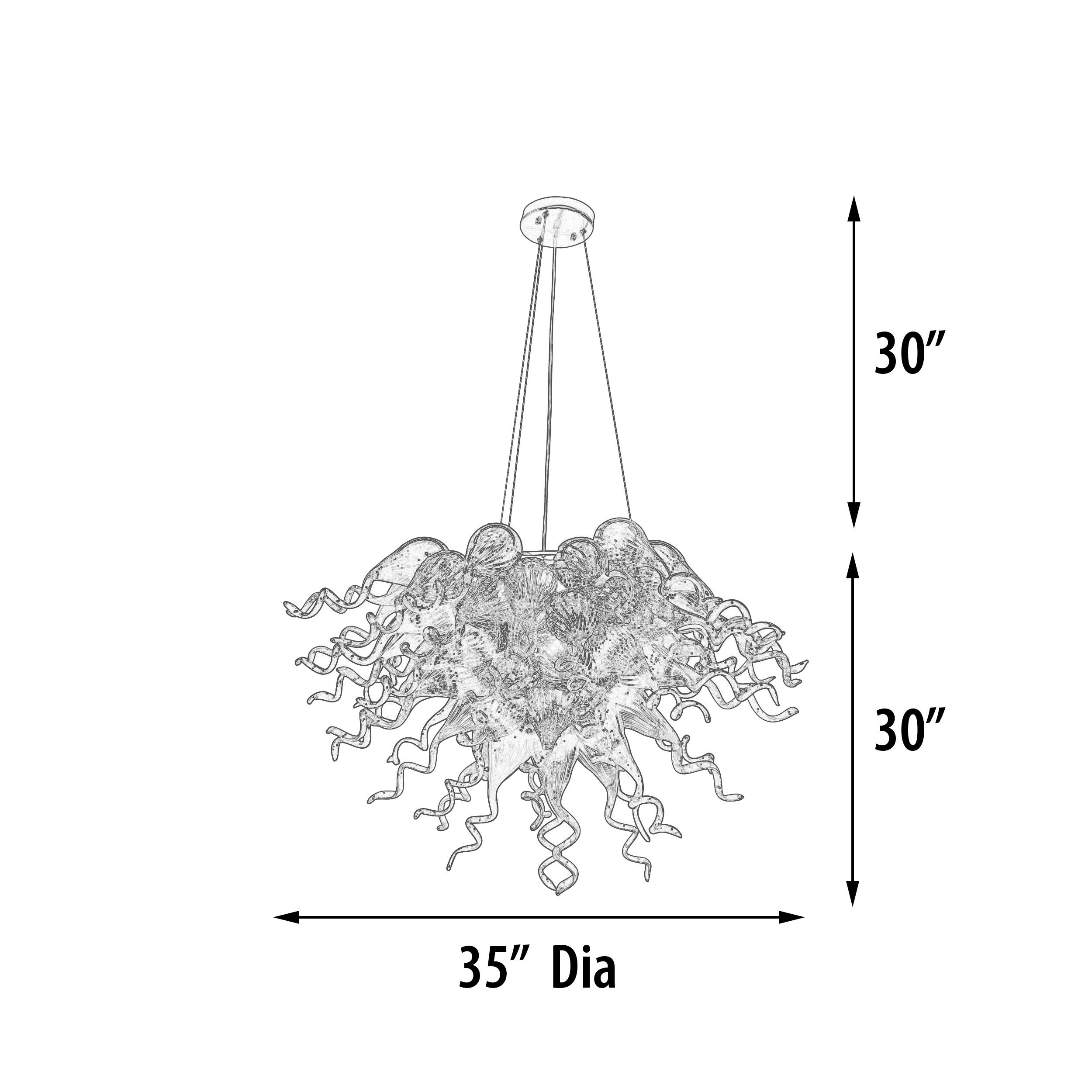 World-Class Hand Blown Glass Artist to design and create these beautiful Blown Glass Burst Chandeliers in a variety of different colors. Each of the Glass Bulbs are perfectly hand blown art glass with a curly cue tip to create this beautiful masterpiece. We commissioned a world class Glass Artist, skilled in the art of hand blown glass, to provide the public the best the world has to offer at a price that they can afford. Installation: Each globe attaches to the multi-level graduated concentric circle frame. Appropriate O-Rings and Clips are provided for installation. Assembly is an extremely simple process of attaching an O-Ring to a Hand Blown Glass Globe, the Globe' O-Ring to the provided Clips and then clip the O-ring to the Frame. Repeat as Necessary Until the Chandelier's Frame is Full. Each Frame Holds Most of the Provided Globes. The Artist Includes a Few Extra for Replacements if Necessary. Bulbs not included Material: Steel/Glass Weight Lb:15.4 Bulbs:6 Watt :35 Switch:G9 Product Ul :Yes Wiring Ul :Yes Socket Ul :Yes Assembly :As Per Instruction