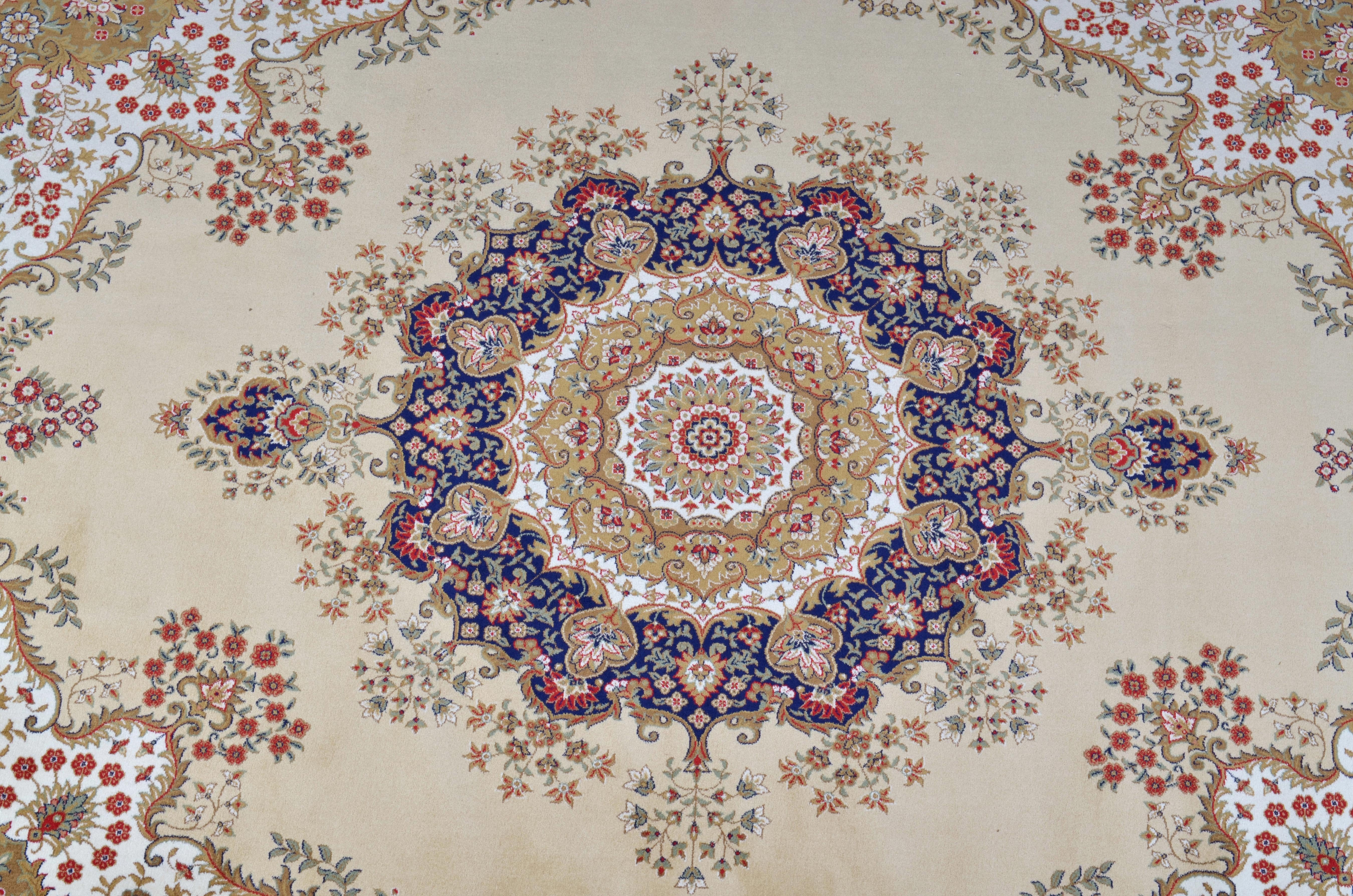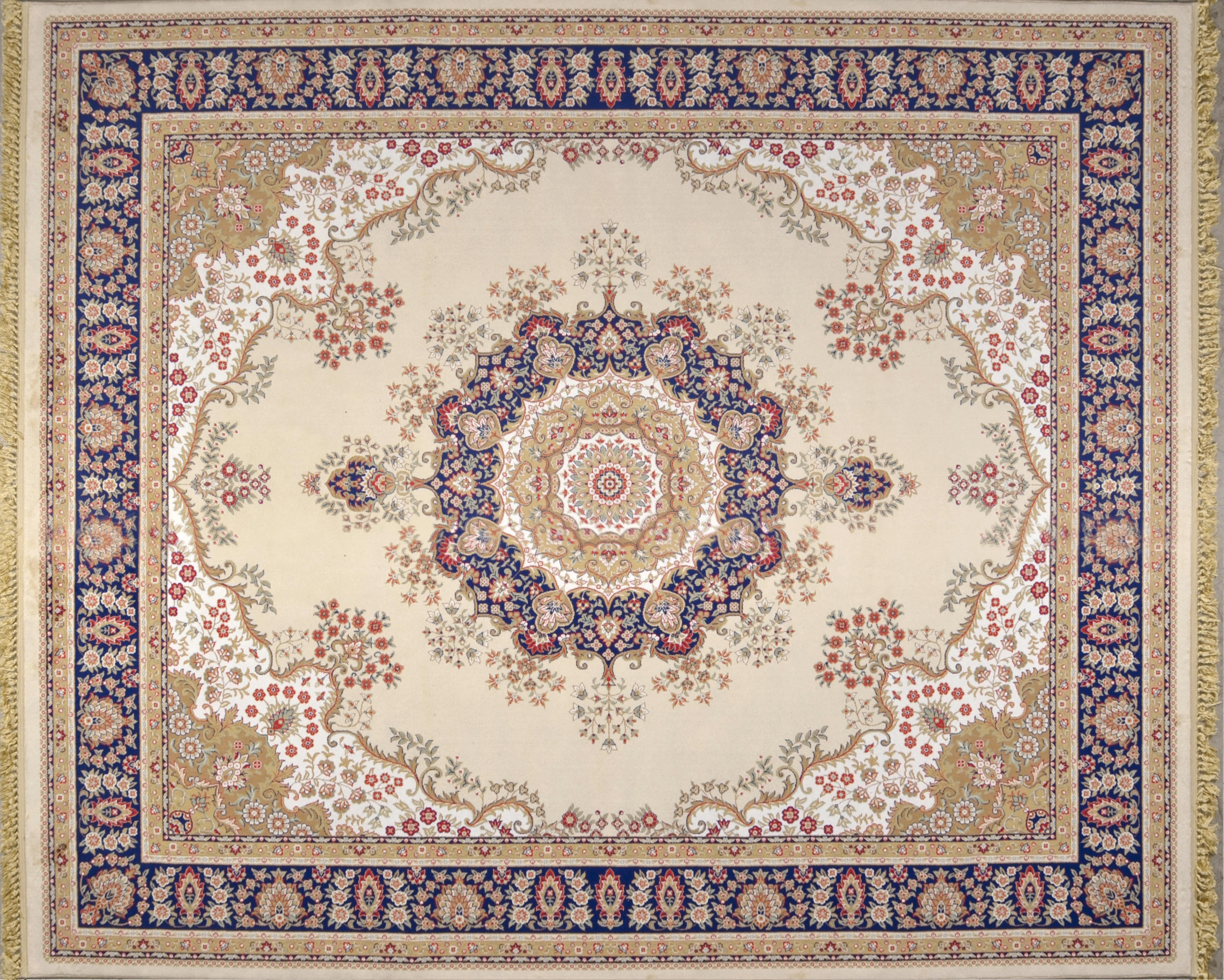 Offered is a beautiful large 9 x 11 foot Persian Style carpet from our elegant, top selling, Kashan Design Cream Collection. Designer's understand that floor is the foundation of any well designed room as we naturally look were we walk. This Cream Kashan Design Palace Rug will create a beautiful first impression and will help define spaces, accent furniture, or simply add some welcome color and texture to a room. The history of Kashan design's originate from Kashan an oasis town along the Kavir desert, in central Iran. It is one of the oldest cities in Iran, As early as the 17th century Kashan had a well established silk area rug industry. Coveting by kings, at one time it was commonplace to see Kashan rugs hanging on palace walls all over the world. It is for this reason that it is also referred to as “the palace carpet”. This modern interpretation is manufactured using a lustrous Viscose pile referred to also as synthetic silk. When combined with its 1 million point manufacturing detail made possible by production using a state of the art face-to-face power loom assures the highest consistent quality across all its designs. There are many popular sizes offered in this TIMELESS TREASURES RUG COLLECTION, consider matching this room size rug with one of its matching accent rugs or runners for a complete statement of Rich Old World Luxury!