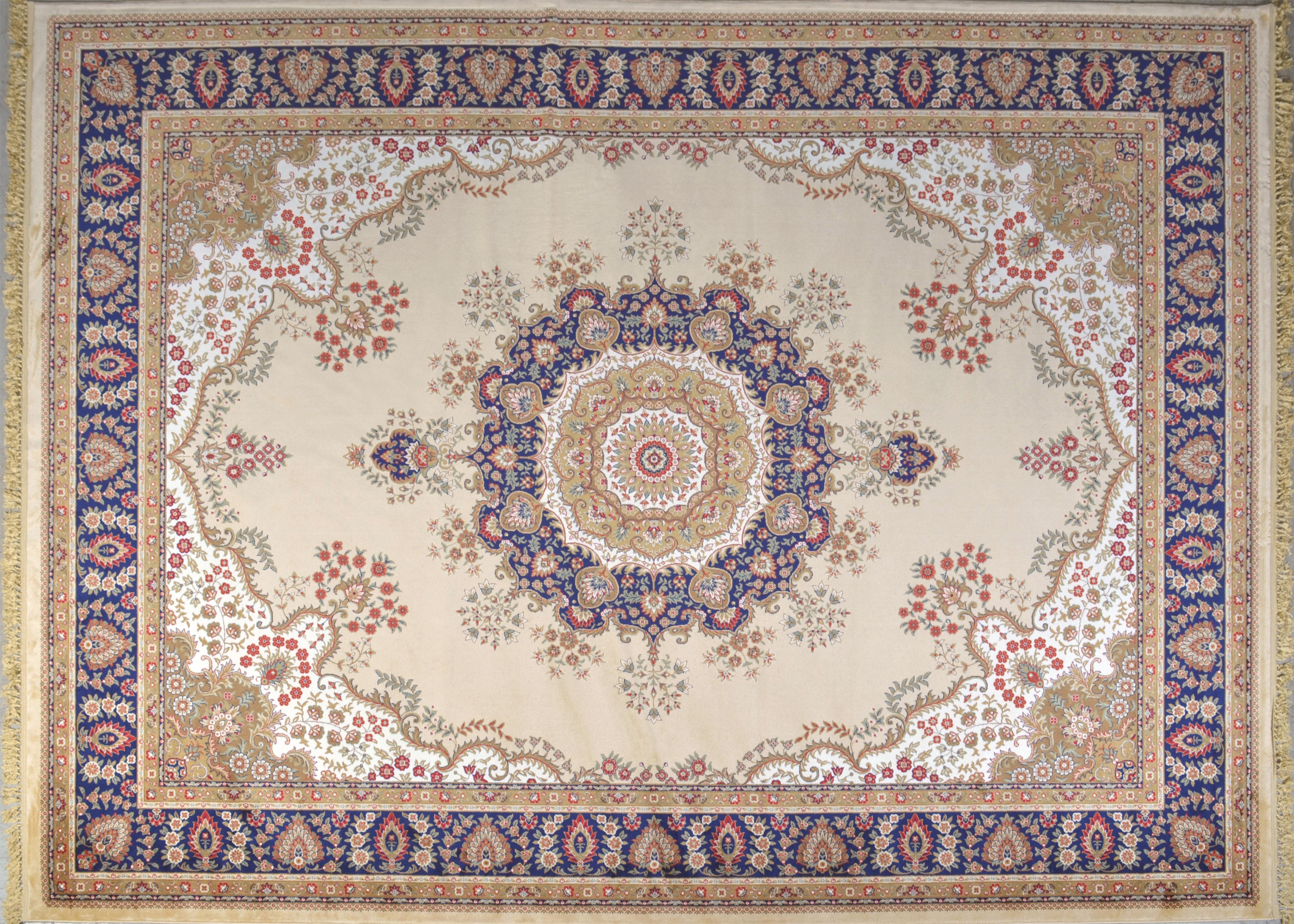 Offered is a beautiful and large 10 x 14 foot Persian Style carpet from our elegant, top selling, Kashan Design Cream Collection. Designer's understand that floor is the foundation of any well designed room as we naturally look were we walk. This Cream Kashan Design Palace Rug will create a beautiful first impression and will help define spaces, accent furniture, or simply add some welcome color and texture to a room. The history of Kashan design's originate from Kashan an oasis town along the Kavir desert, in central Iran. It is one of the oldest cities in Iran, As early as the 17th century Kashan had a well established silk area rug industry. Coveting by kings, at one time it was commonplace to see Kashan rugs hanging on palace walls all over the world. It is for this reason that it is also referred to as “the palace carpet”. This modern interpretation is manufactured using a lustrous Viscose pile referred to also as synthetic silk. When combined with its 1 million point manufacturing detail made possible by production using a state of the art face-to-face power loom assures the highest consistent quality across all its designs. There are many popular sizes offered in this TIMELESS TREASURES RUG COLLECTION, consider matching this large rug with one of its matching accent rugs or runners for a complete statement of Rich Old World Luxury!