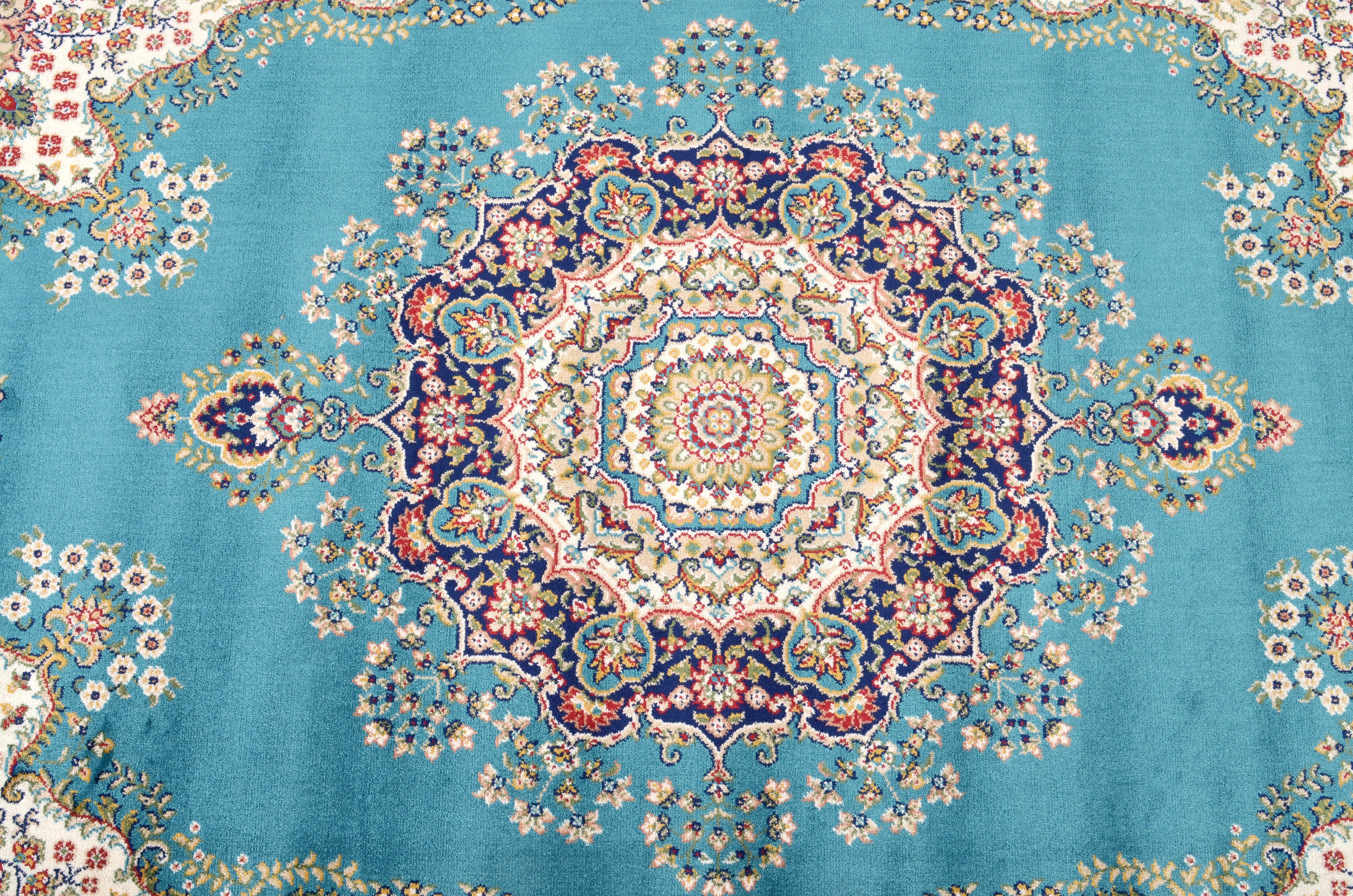 One of the newest additions is this beautiful 4 x 6 foot accent rug from our spectacular, Kashan Design Blue Collection. So striking in beauty and first impression. This is spectacular color combination with Turquoise Teal Blue Fields surrounded by exciting accent colors offering contrast with dark Black Blue, Cream and touches of Burgundy. Designer's understand that floor is the foundation of any well designed room as we naturally look were we walk. This Kashan Design Blue Palace Rug will create a stunning first impression and will certainly help define spaces, accent furniture, or simply add some welcome color and texture to a room. The history of Kashan design's originate from Kashan an oasis town along the Kavir desert, in central Iran. It is one of the oldest cities in Iran, As early as the 17th century Kashan had a well established silk area rug industry. Coveting by kings, at one time it was commonplace to see Kashan rugs hanging on palace walls all over the world. It is for this reason that it is also referred to as the palace carpet. This modern interpretation is manufactured using a lustrous Viscose pile referred to also as synthetic silk. When combined with its 1 million point manufacturing detail made possible by production using a state of the art face-to-face power loom assures the highest consistent quality across all its designs. There are many popular sizes offered in this TIMELESS TREASURES RUG COLLECTION, consider matching this accent rug with one of its matching room sized offerings or runners for a fresh take of style and color in Timeless Old World Luxury!